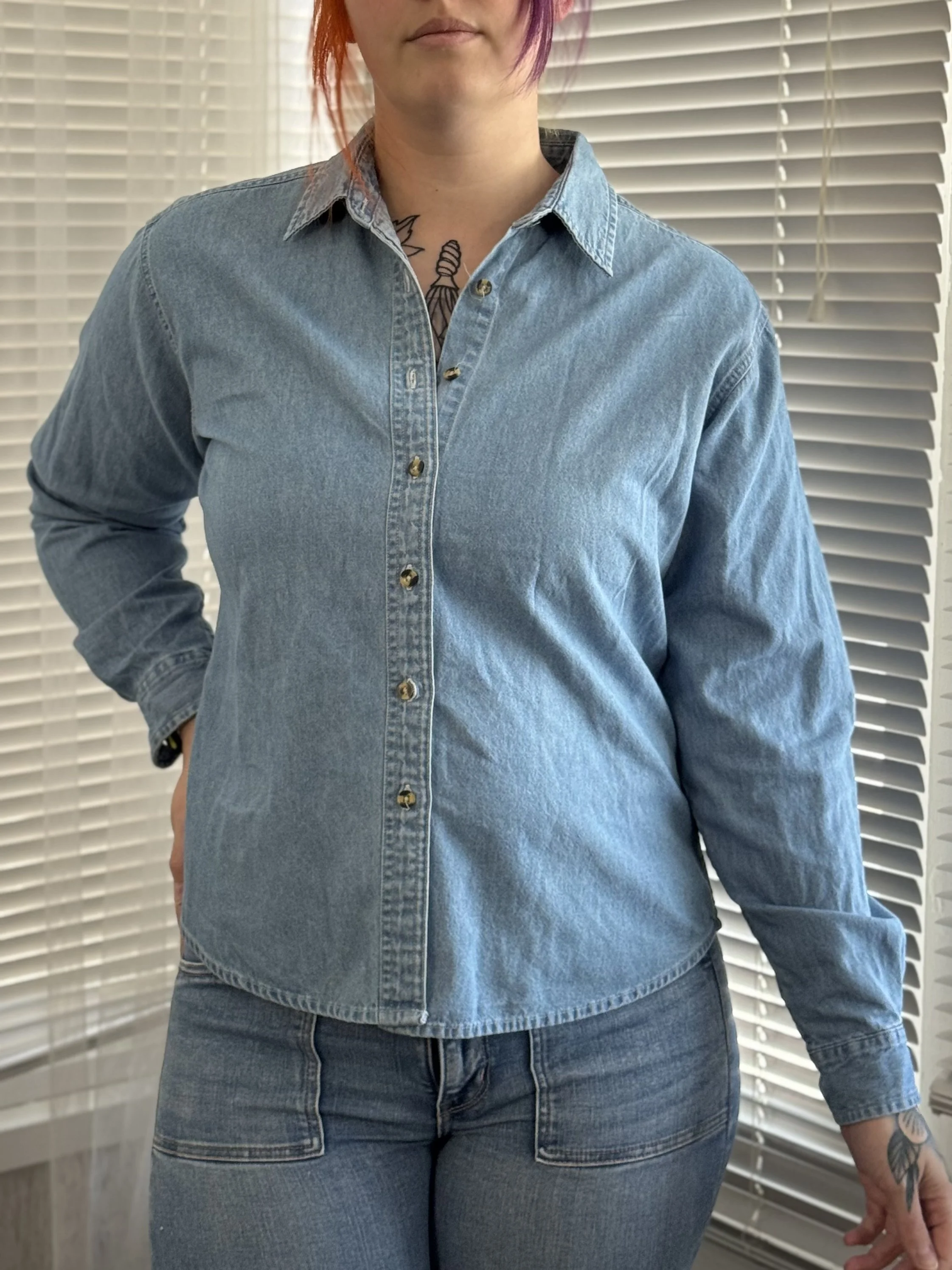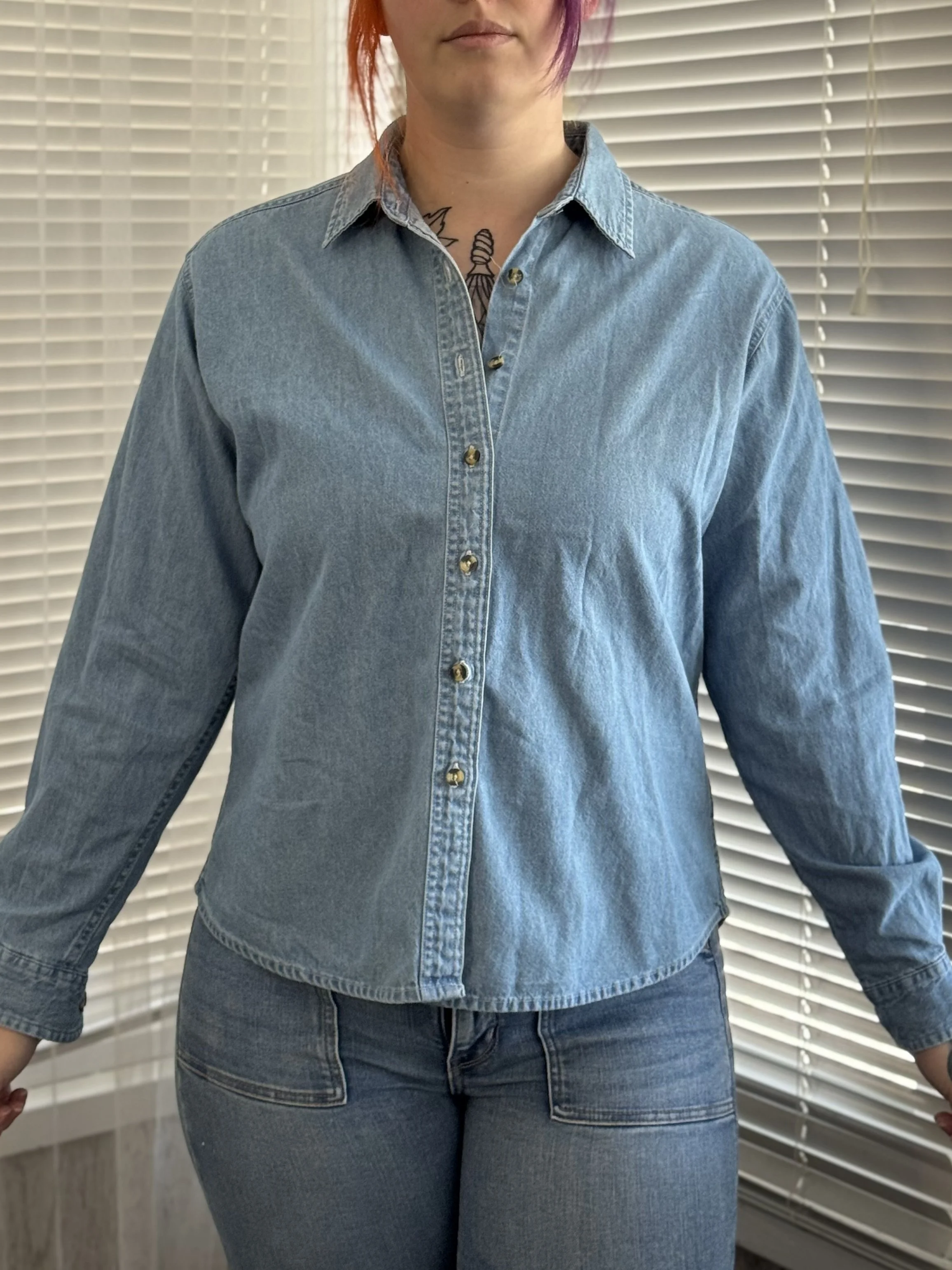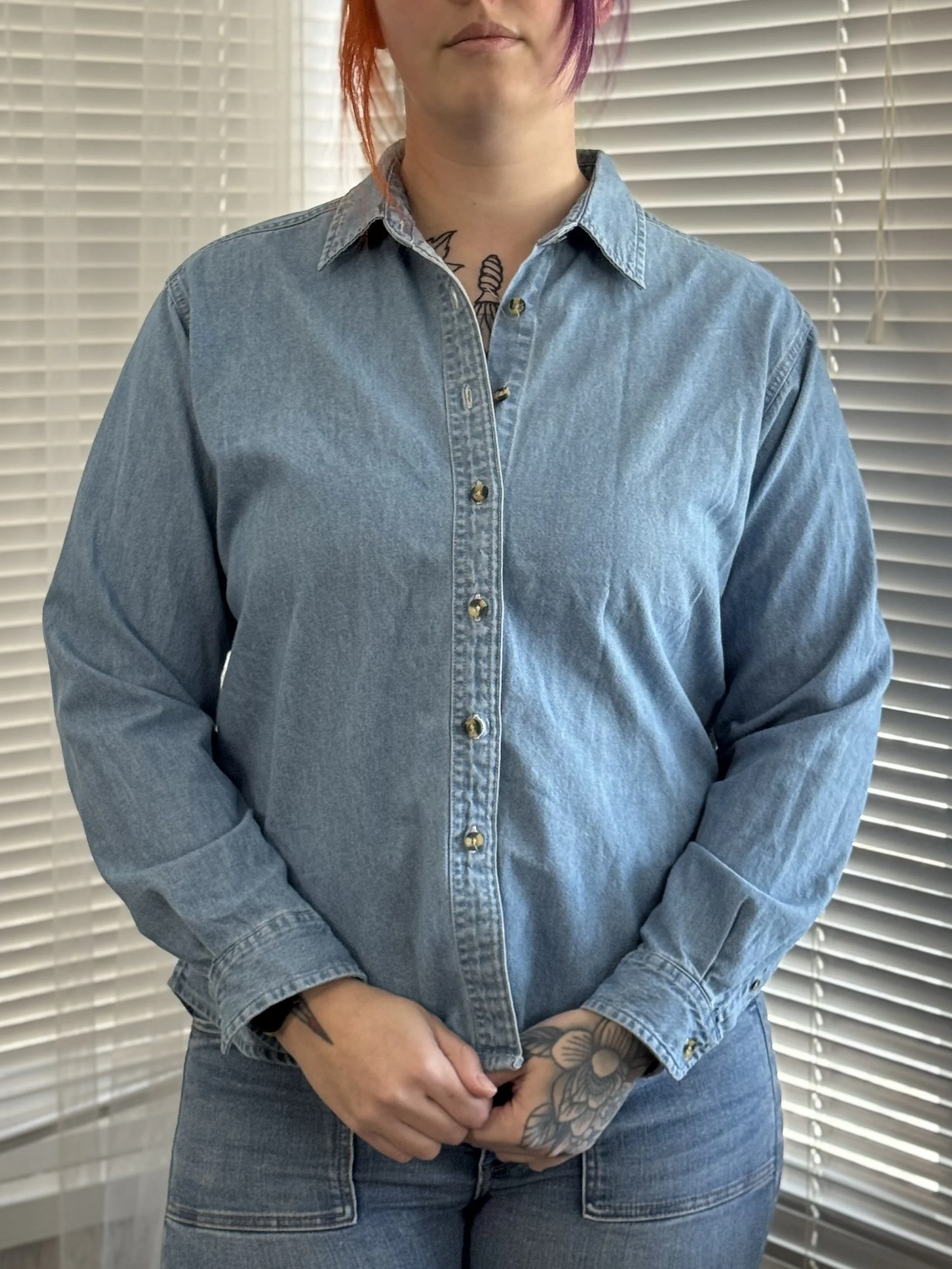 Thrifted Port & Company denim button-up top. Features top-to-bottom button closure in front. Button closures on wrists for adjustable fit.