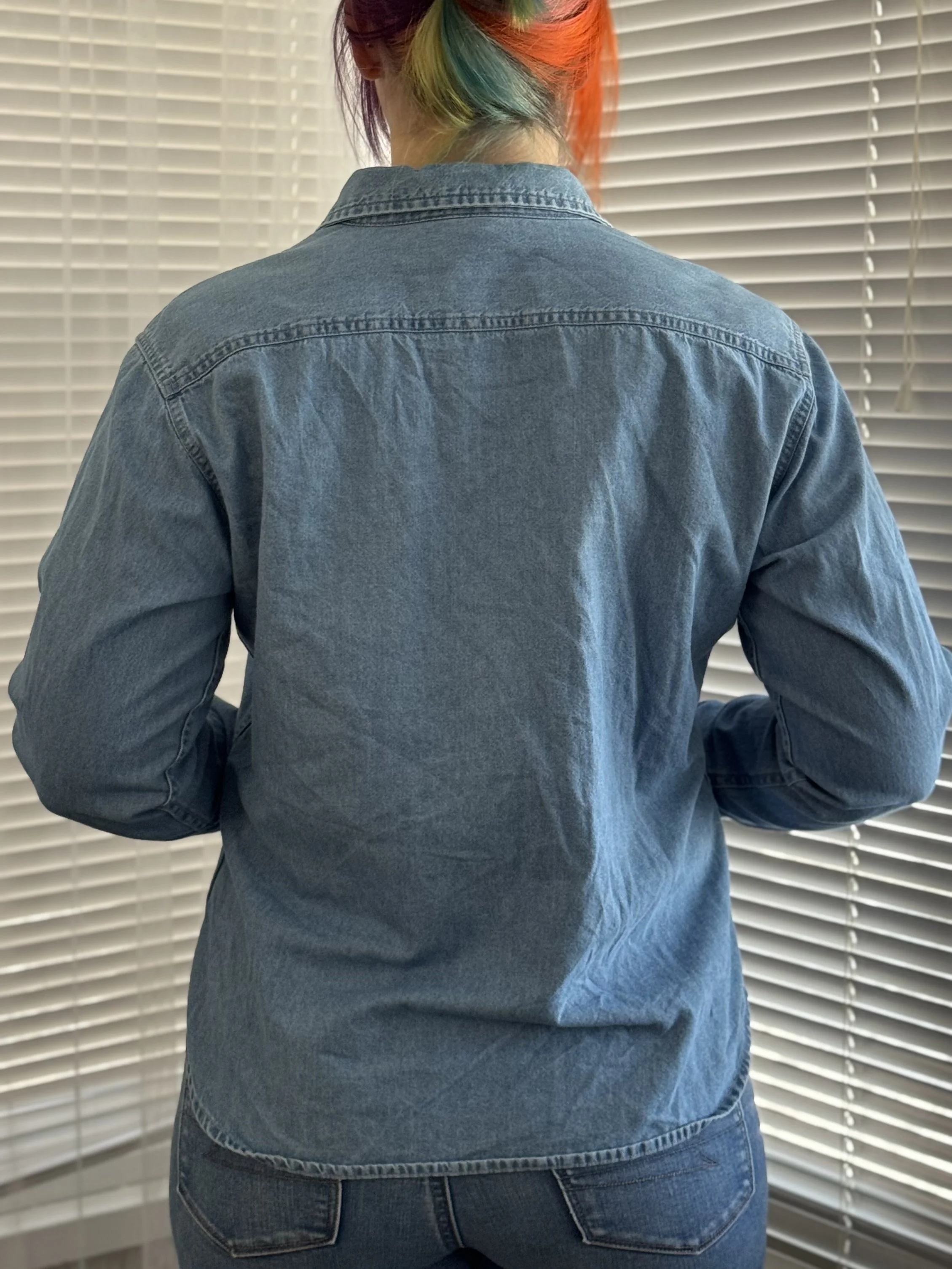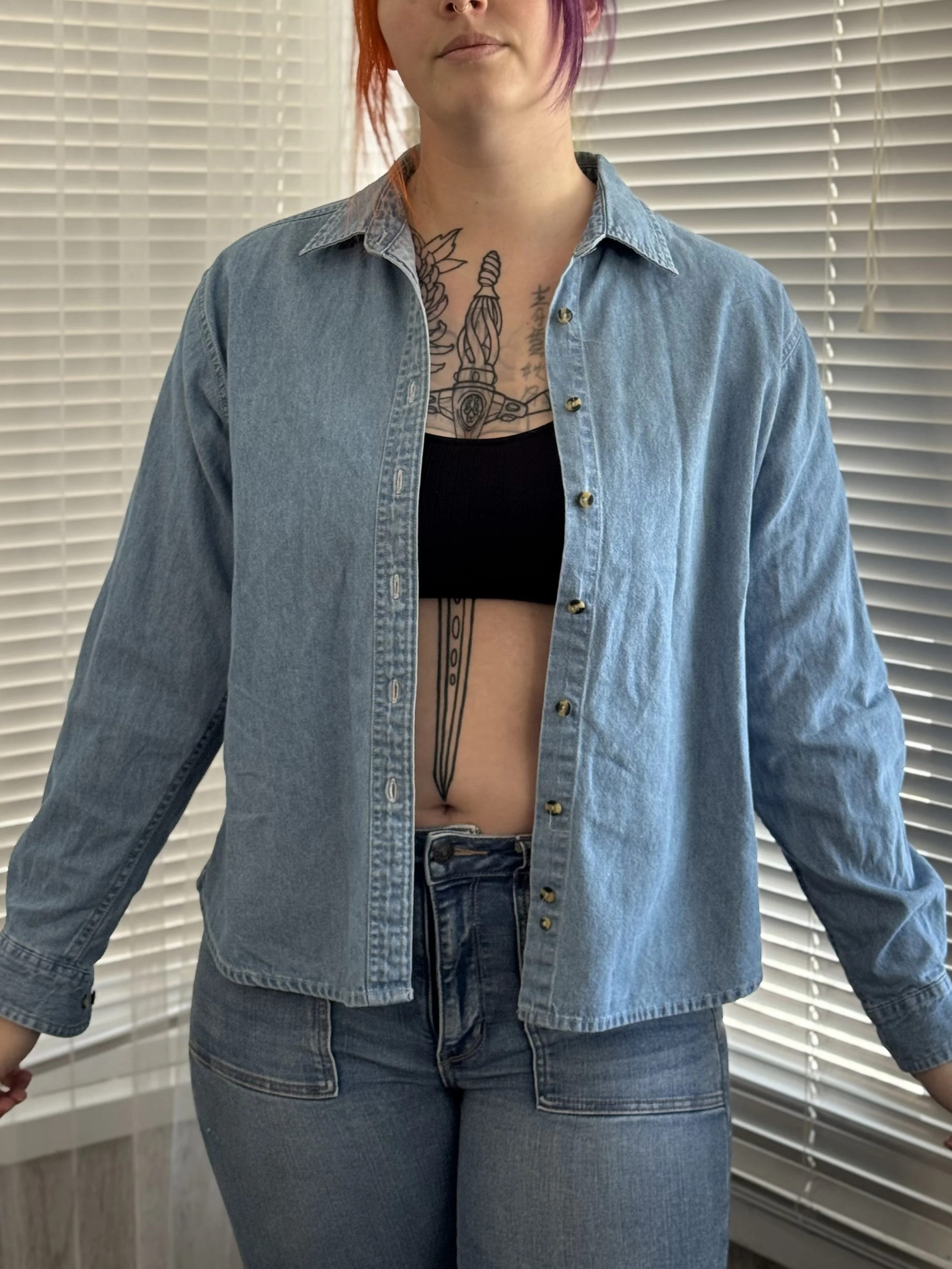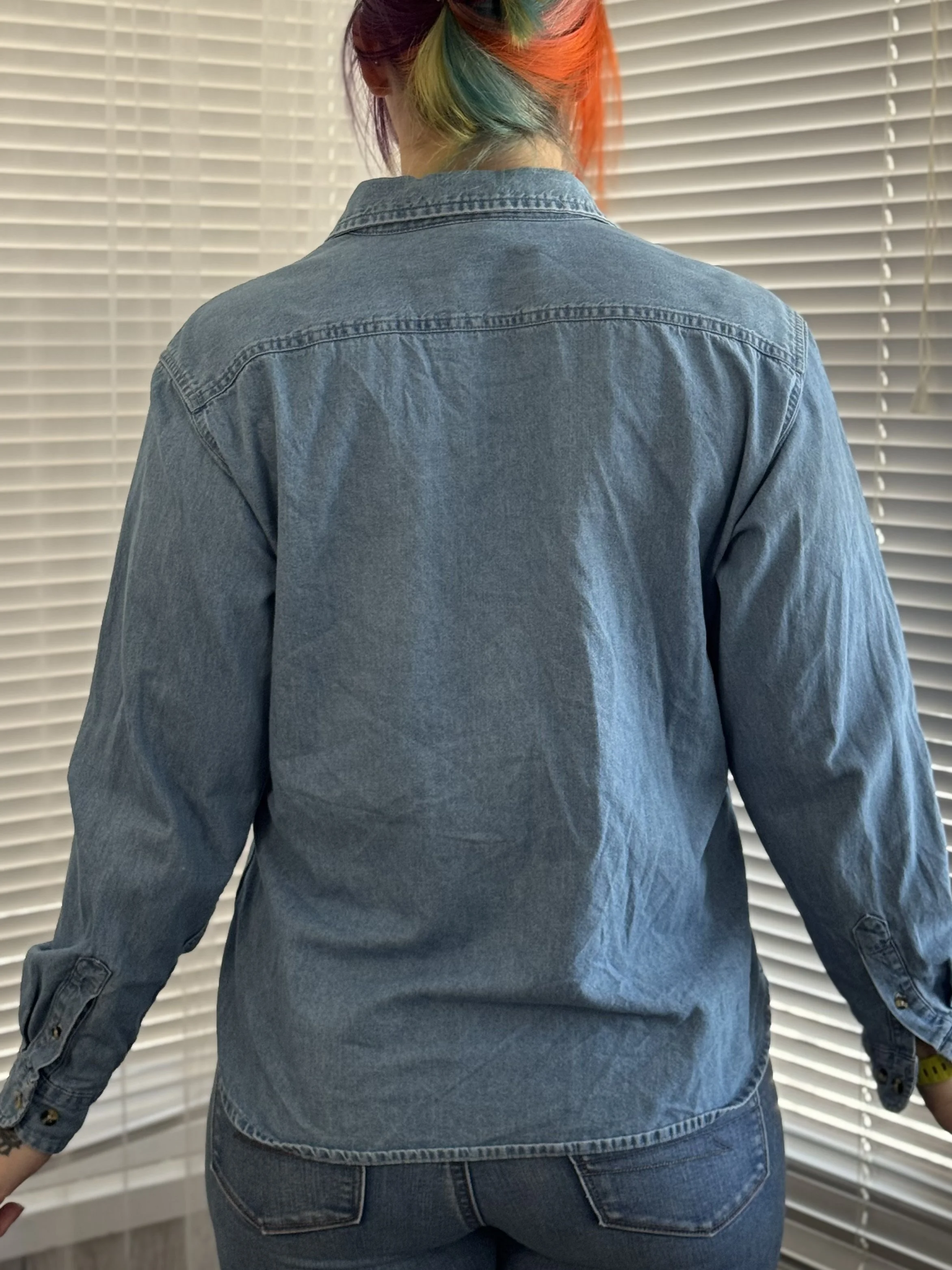 Thrifted Port & Company denim button-up top. Features top-to-bottom button closure in front. Button closures on wrists for adjustable fit.