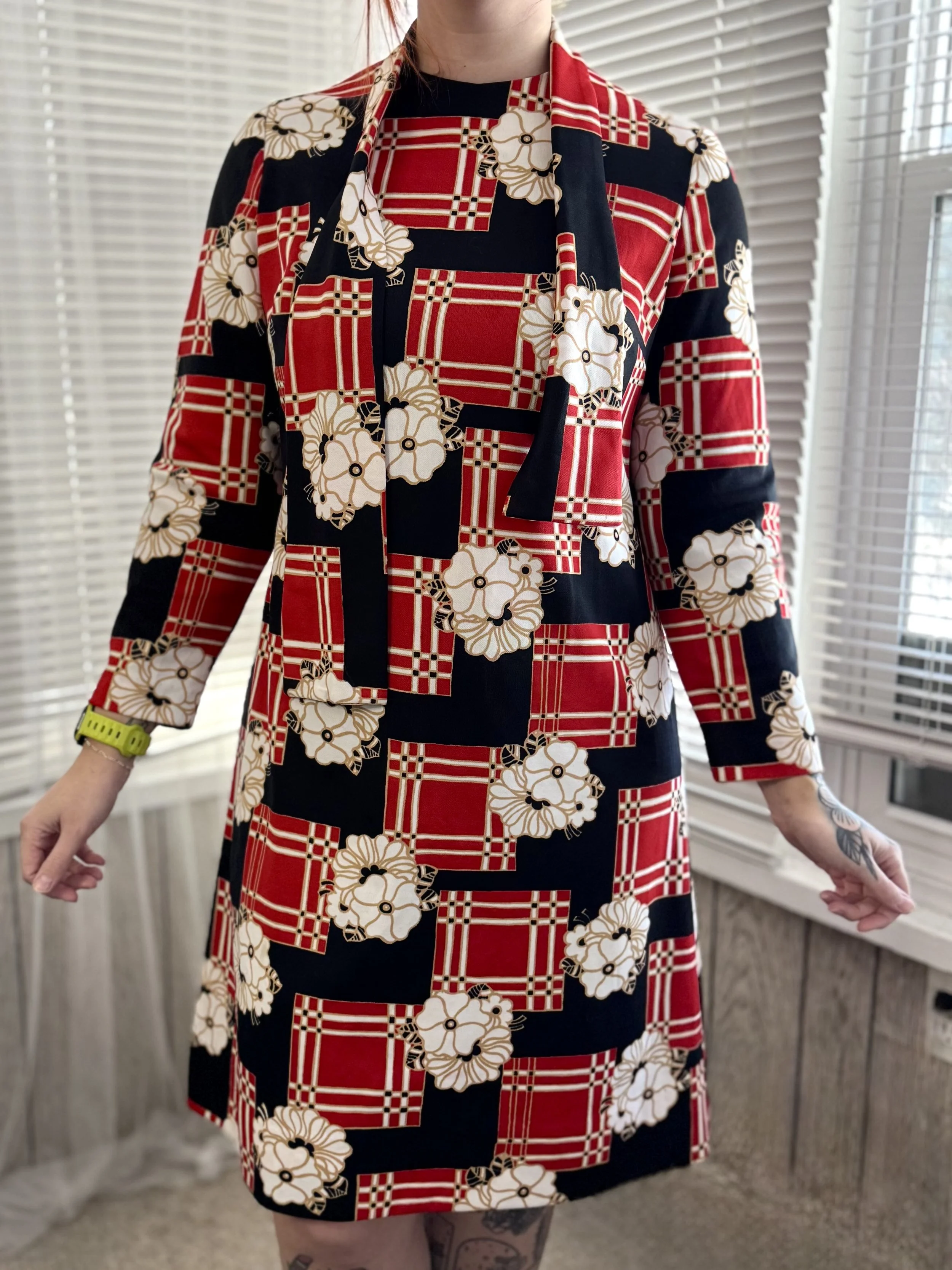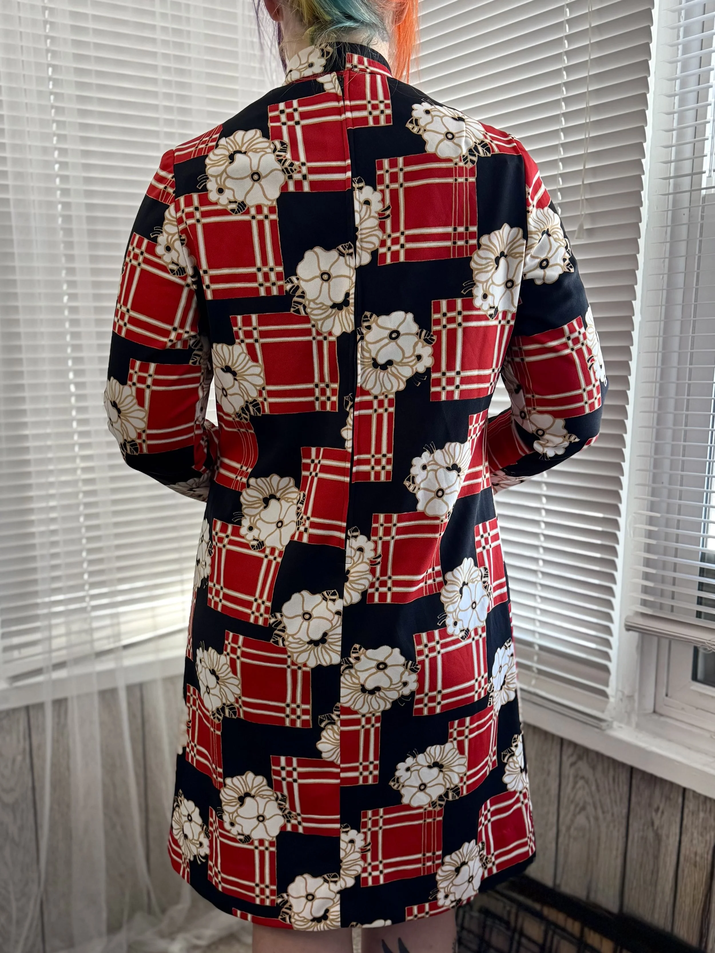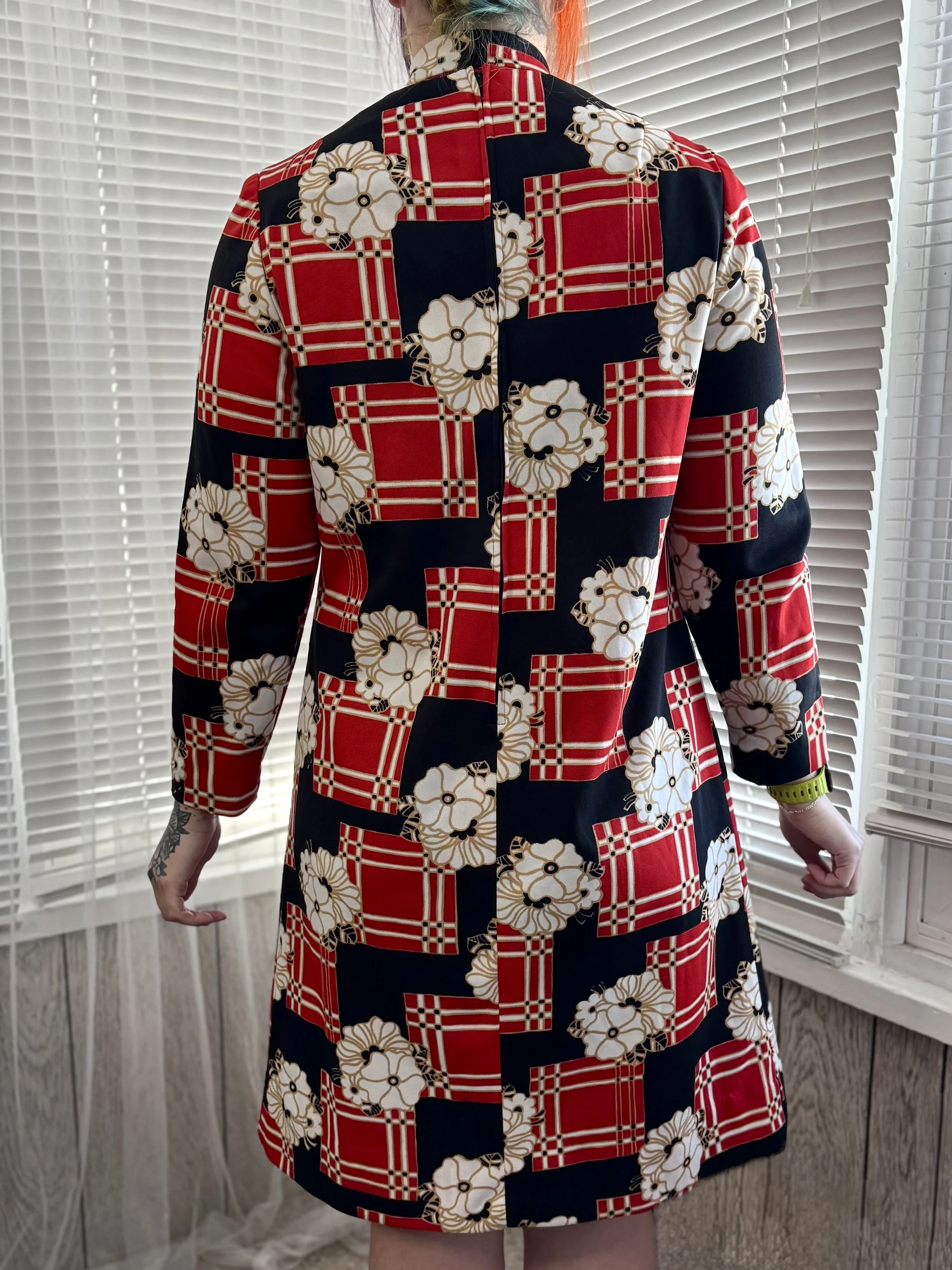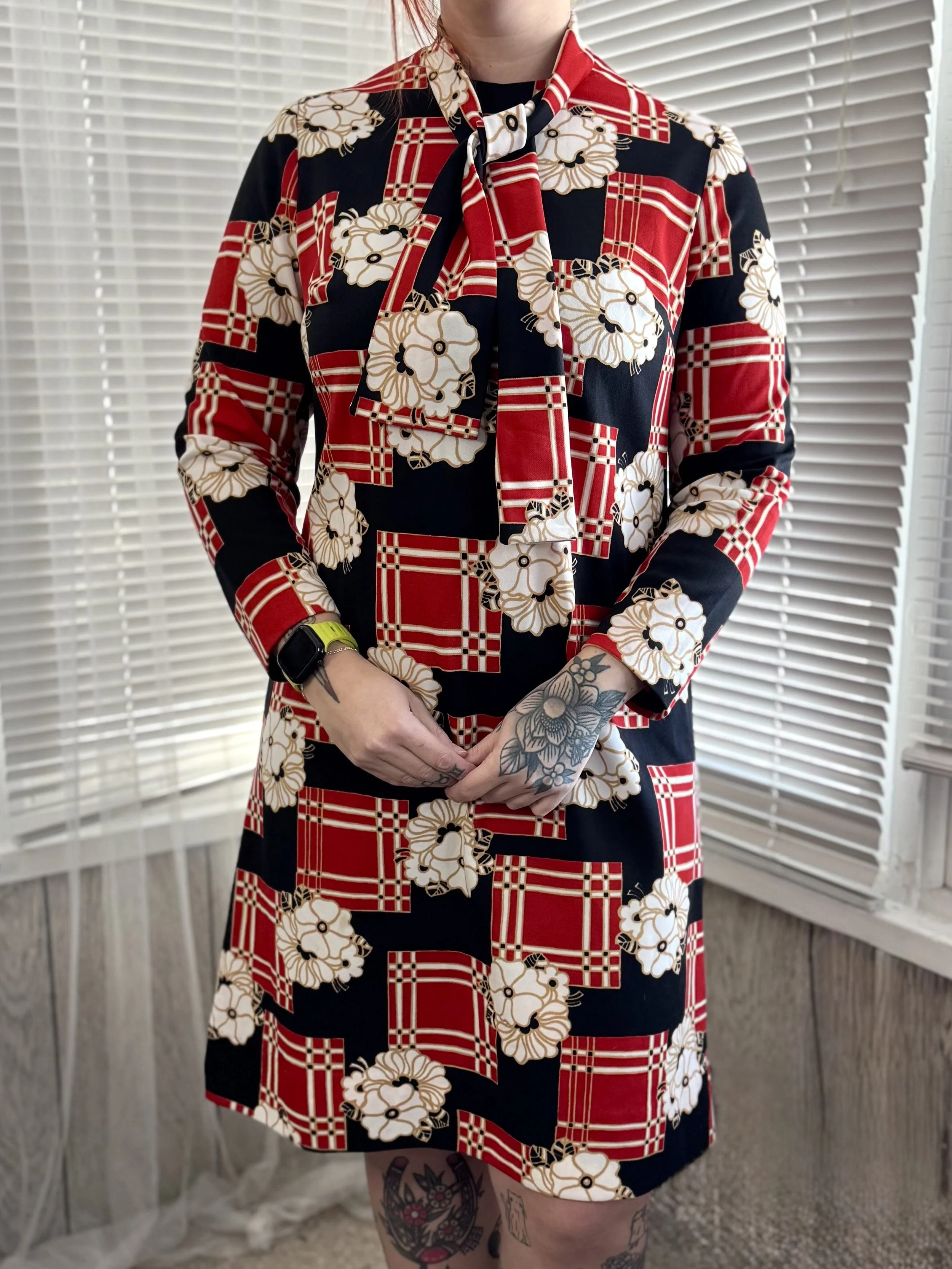 Vintage Henry-Lee floral and block print midi dress. Features zipper closure in back. Comes with sewn on necktie (attached in the back) that can be easily removed if desired.
