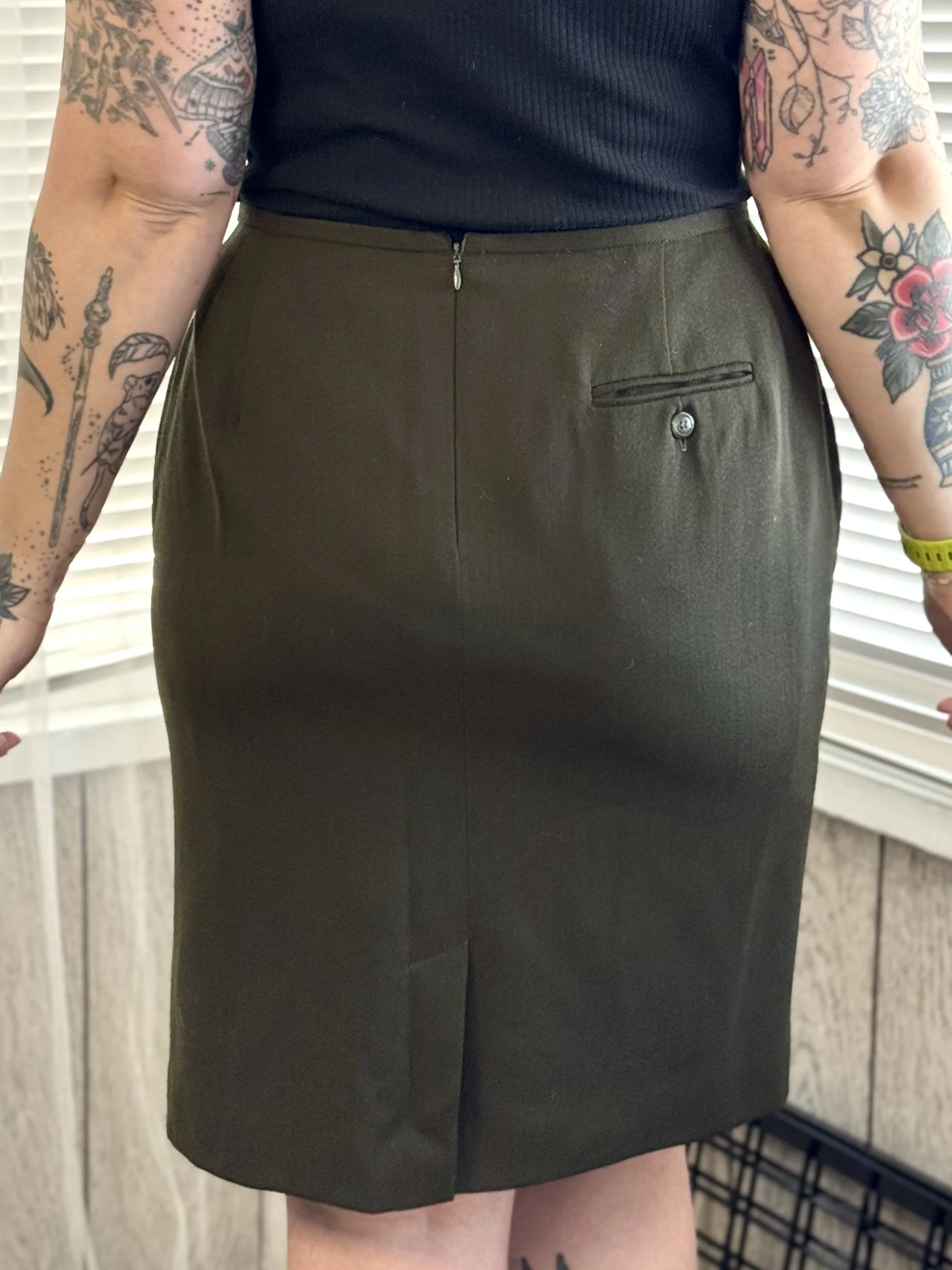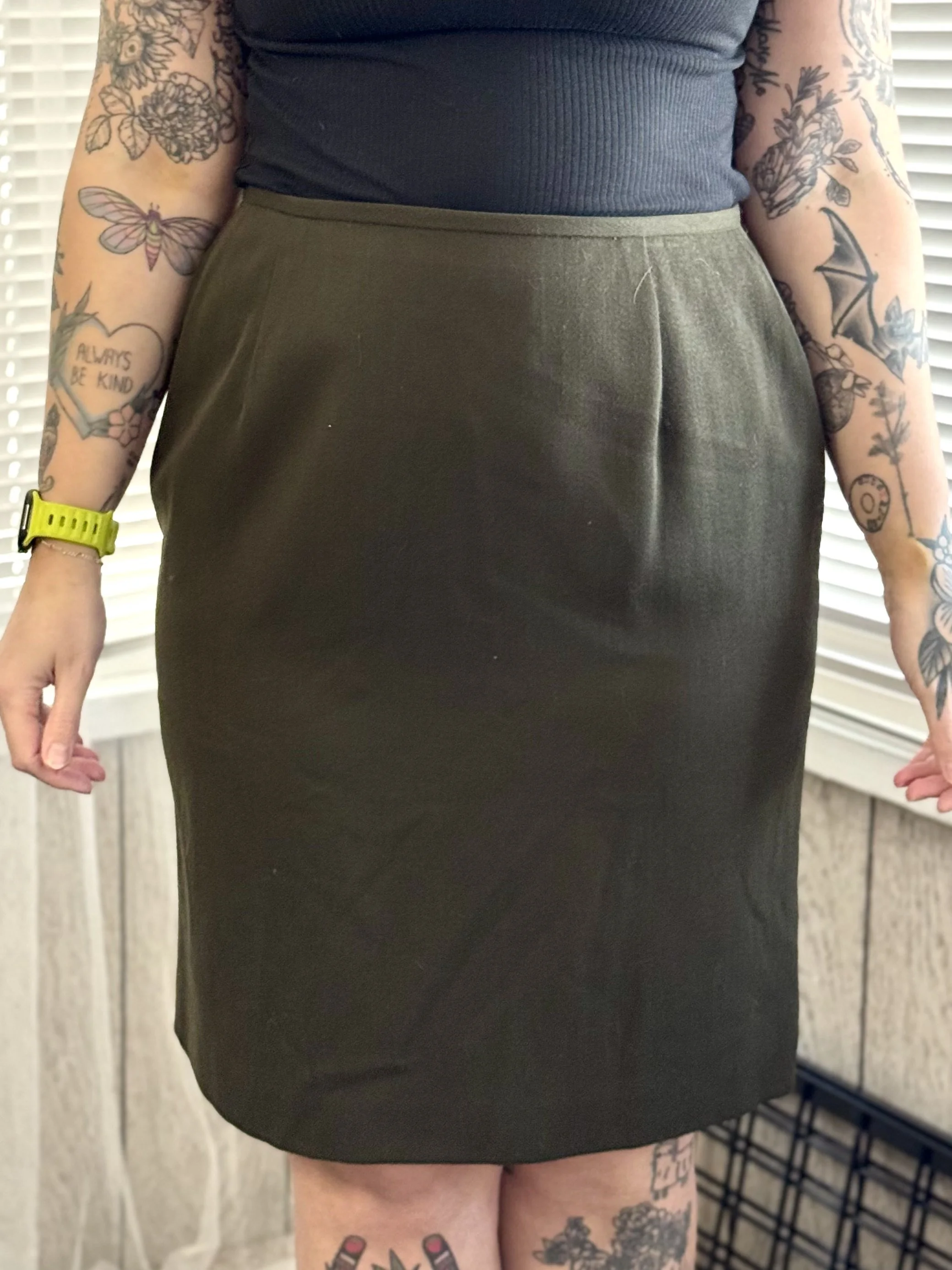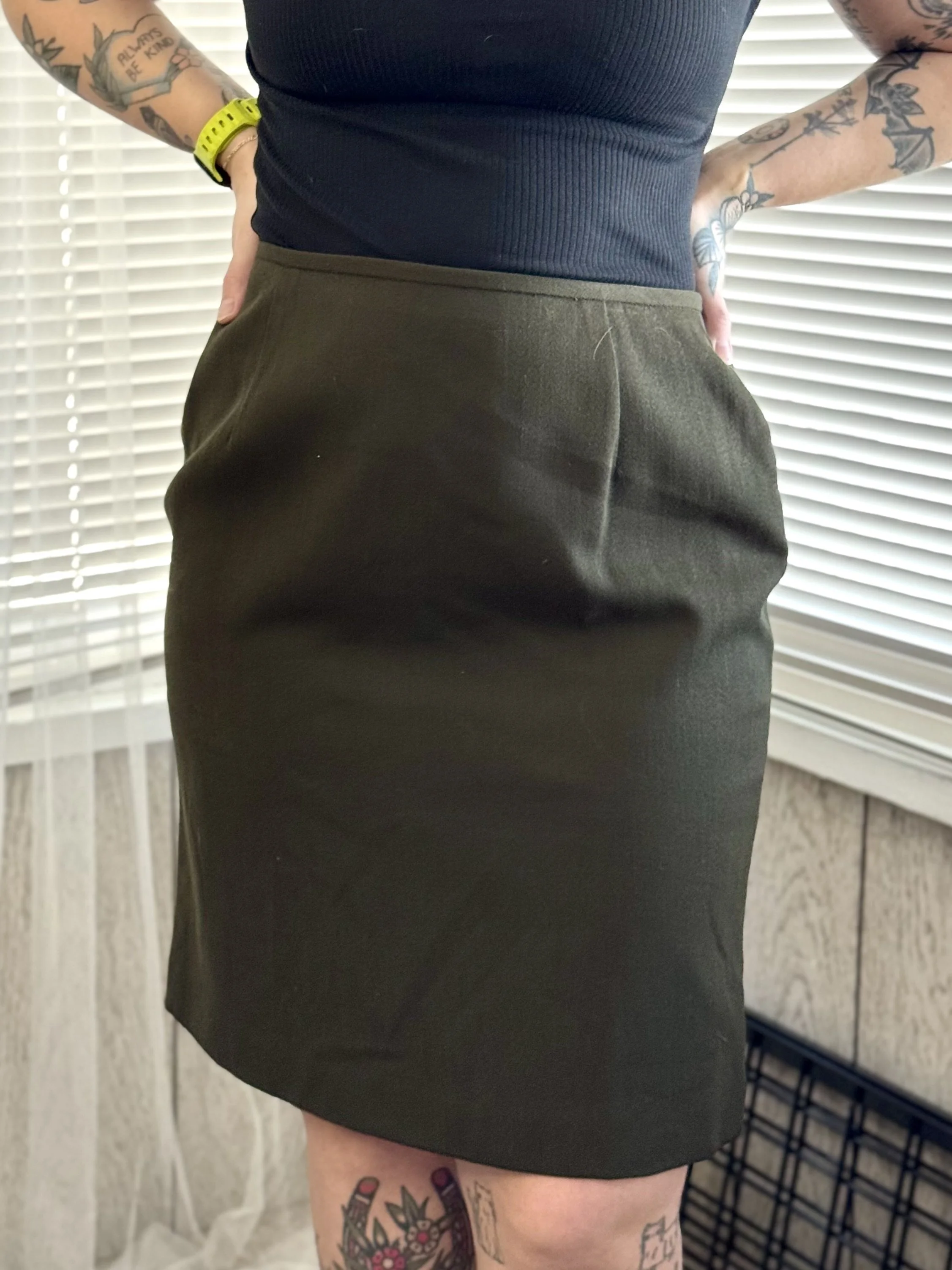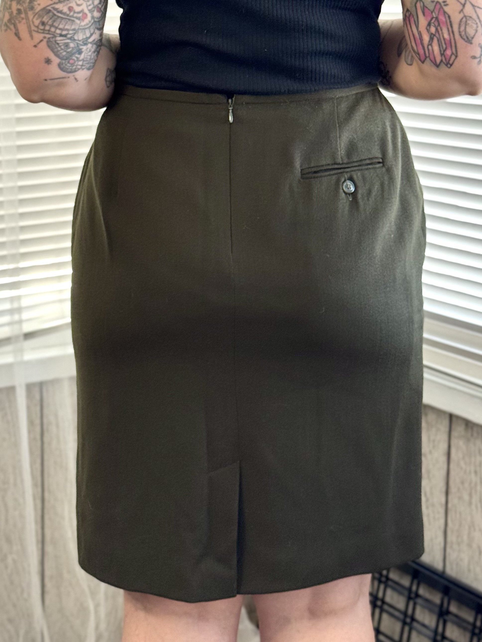 Vintage Jones New York olive green wool skirt. Features zipper closure in back. One small fully function on back right with button closure.