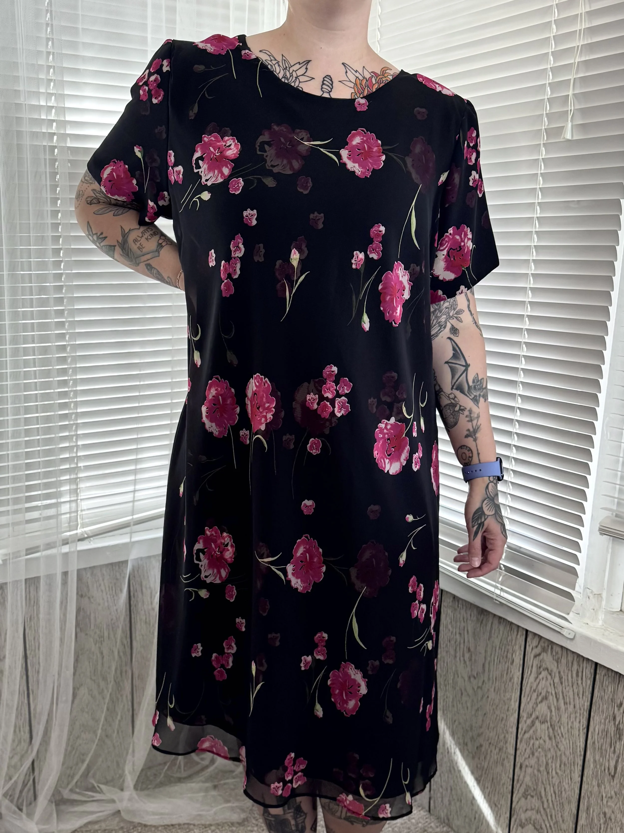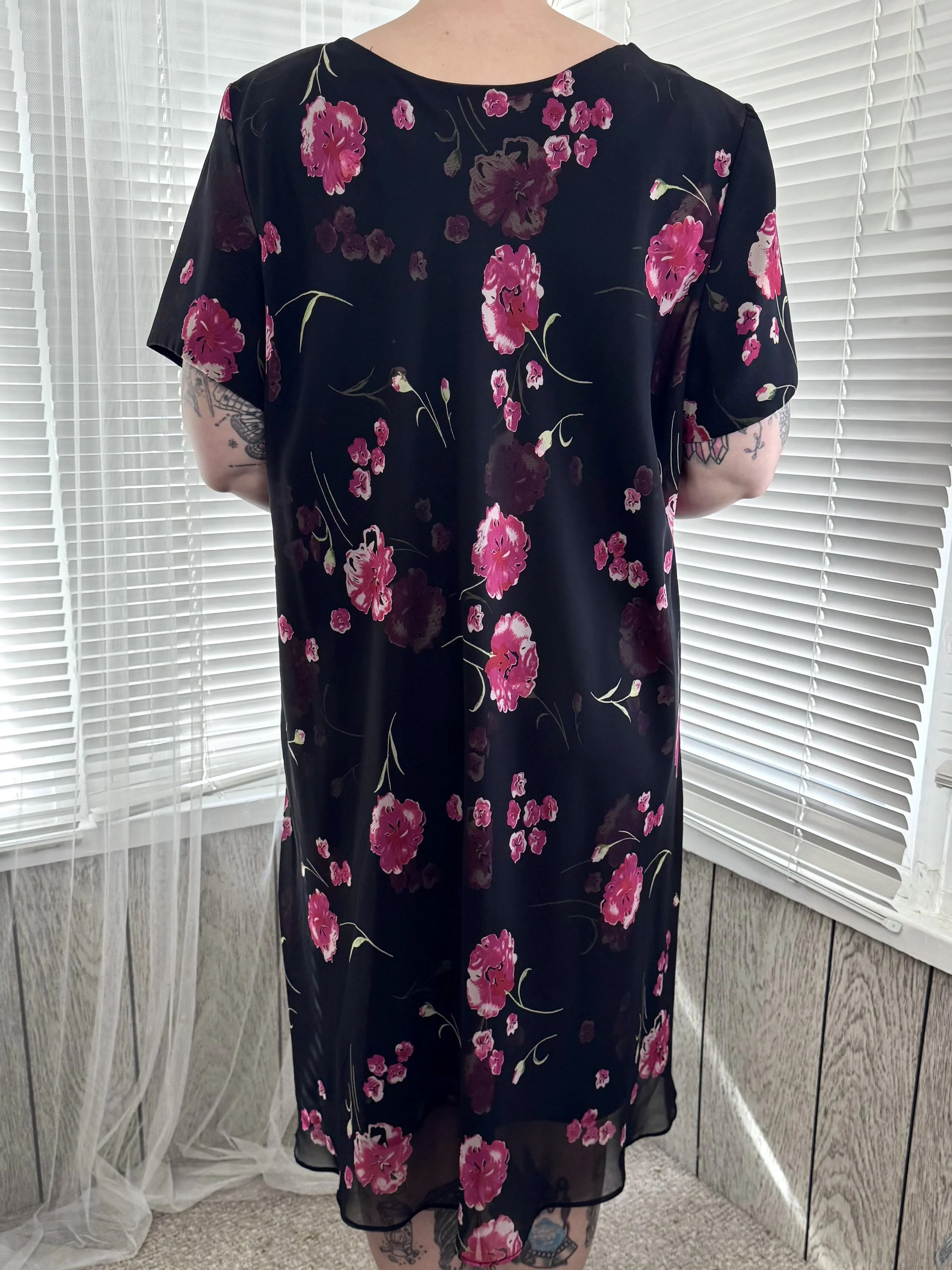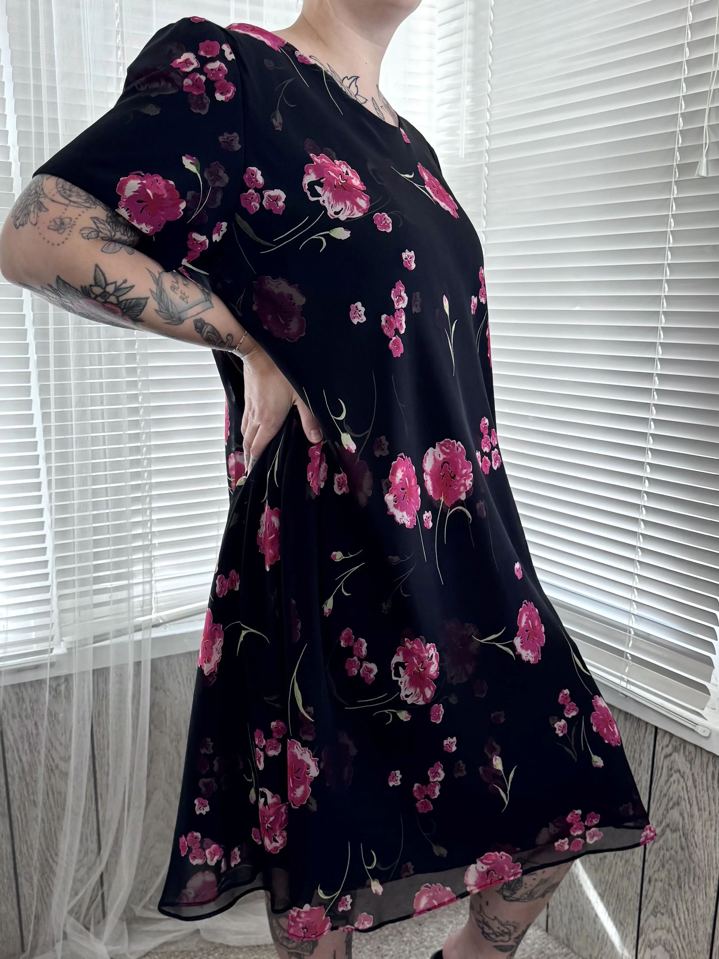 Vintage Jessica Howard black midi dress with pink floral print. Light shoulder padding, can be easily removed. Slips on, no zipper or button closures.