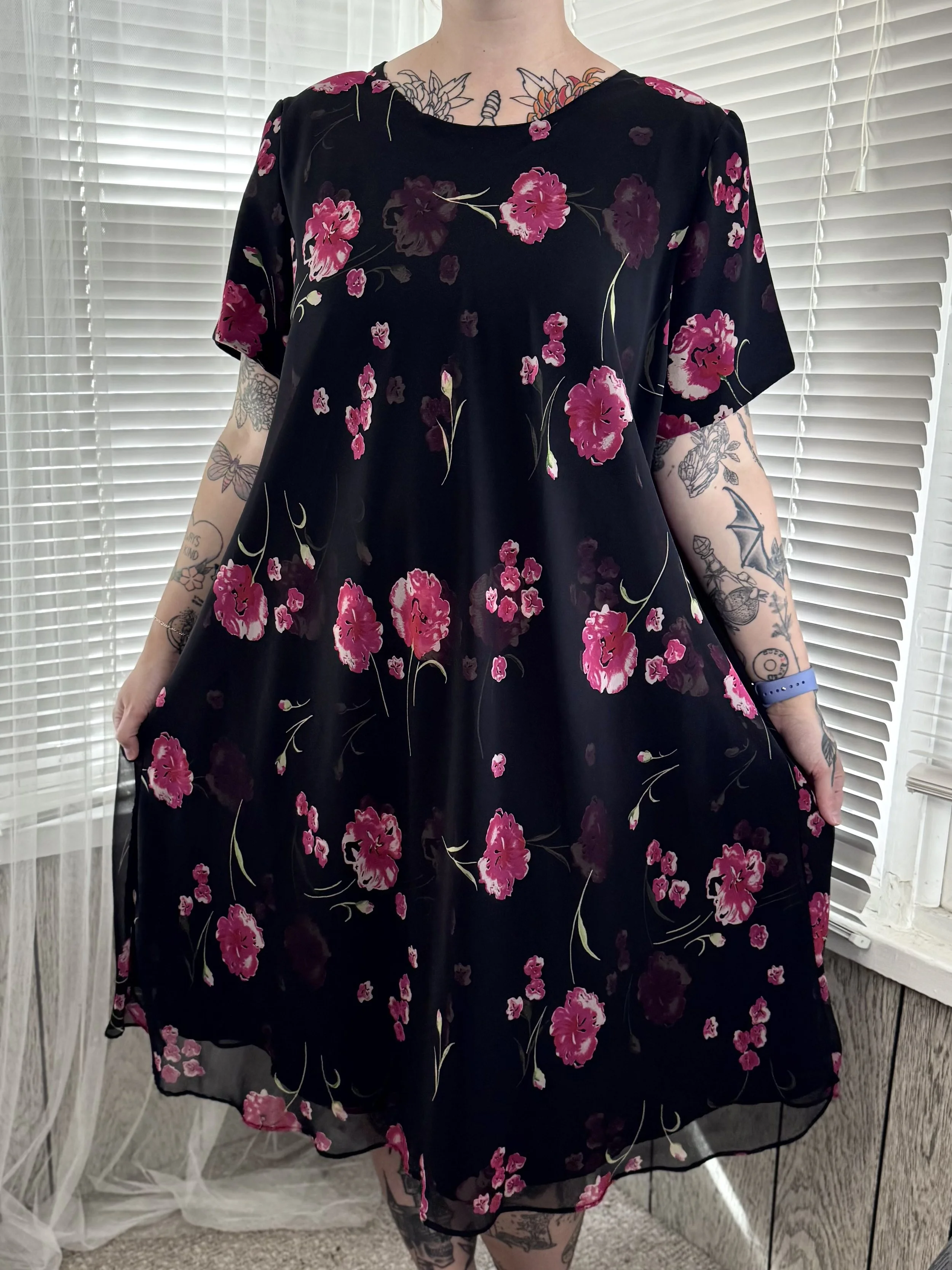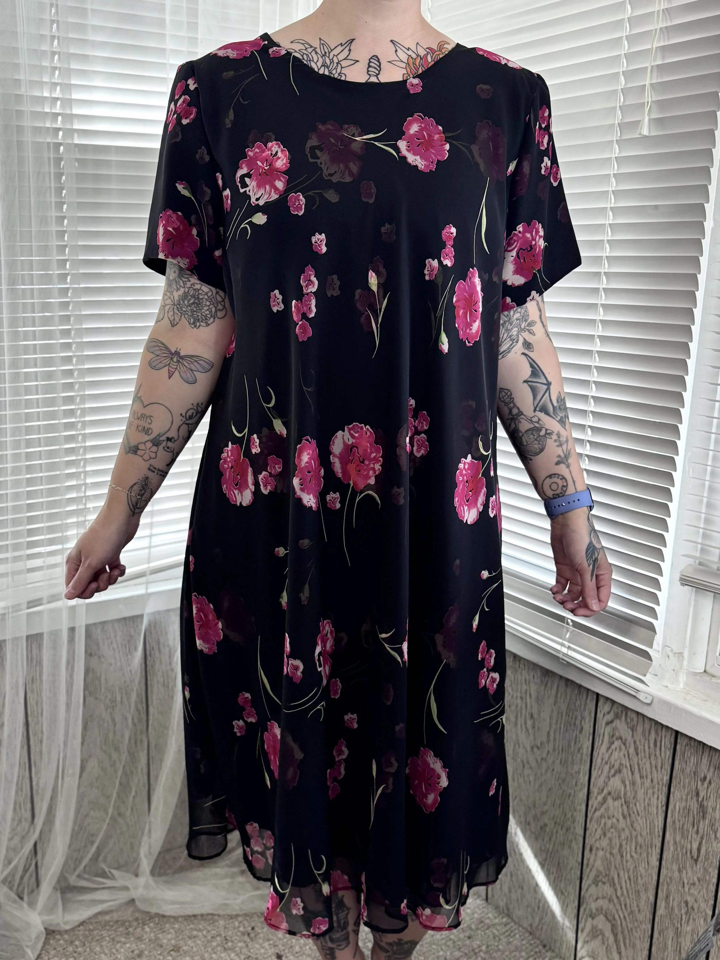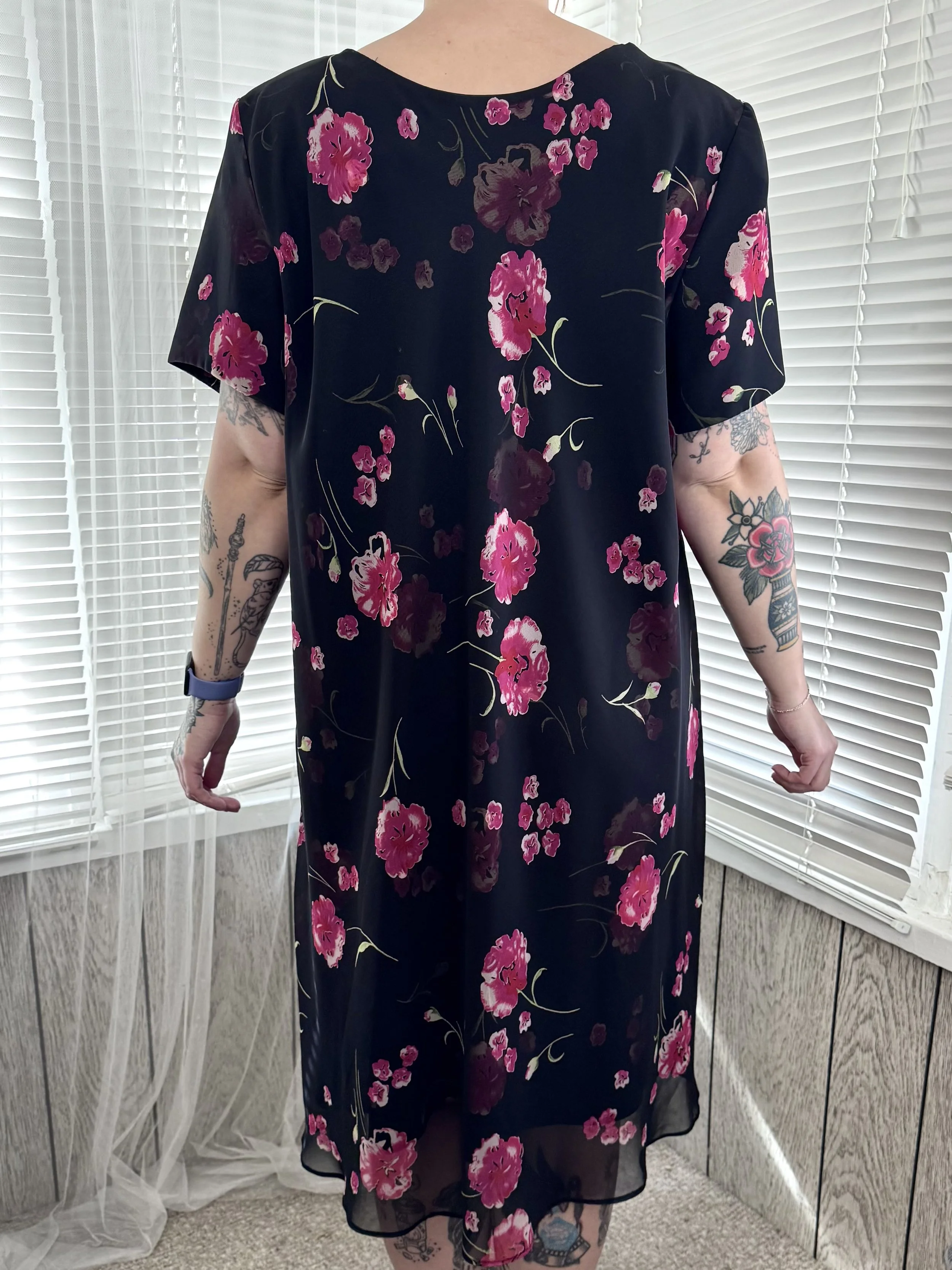 Vintage Jessica Howard black midi dress with pink floral print. Light shoulder padding, can be easily removed. Slips on, no zipper or button closures.