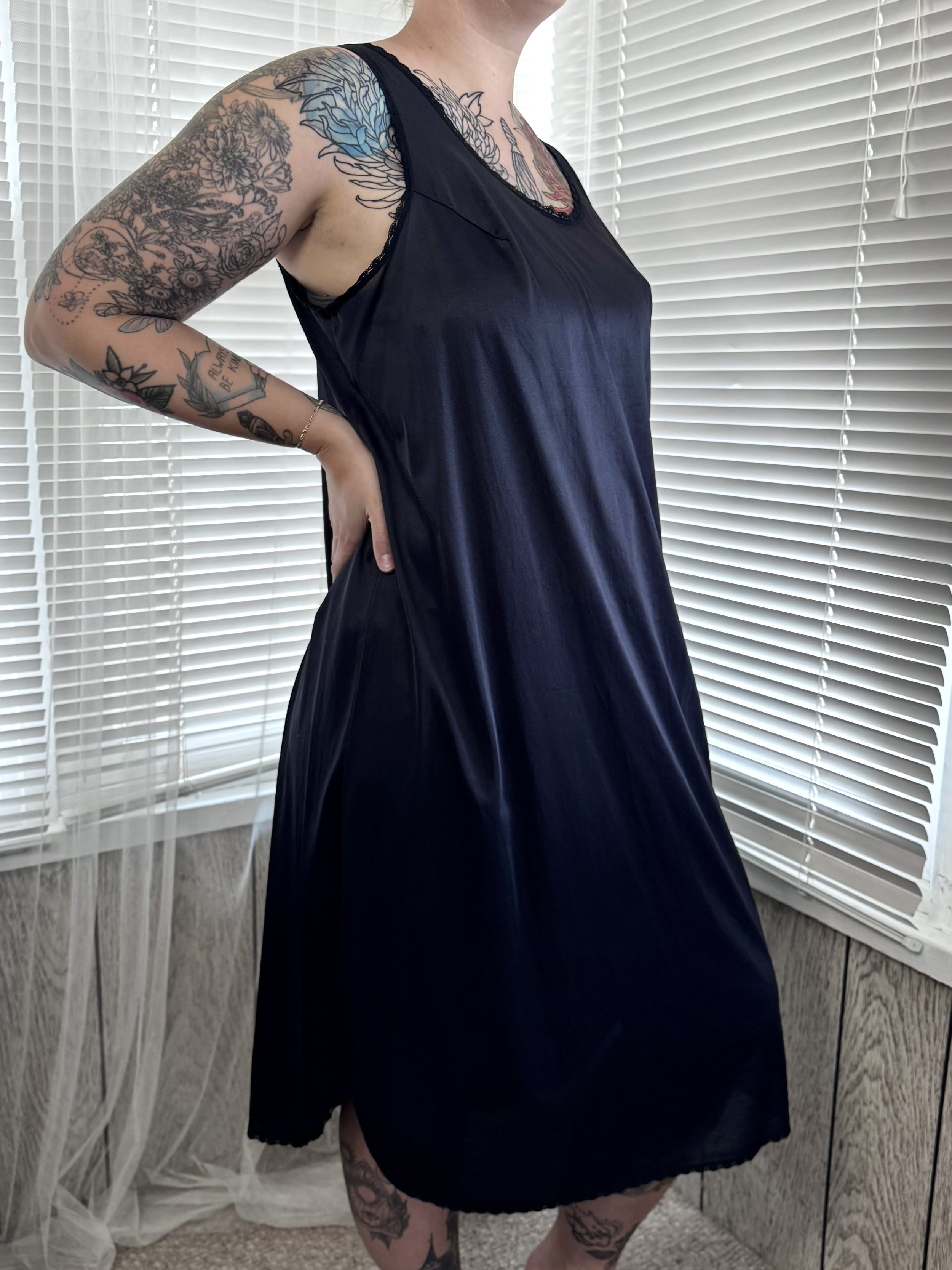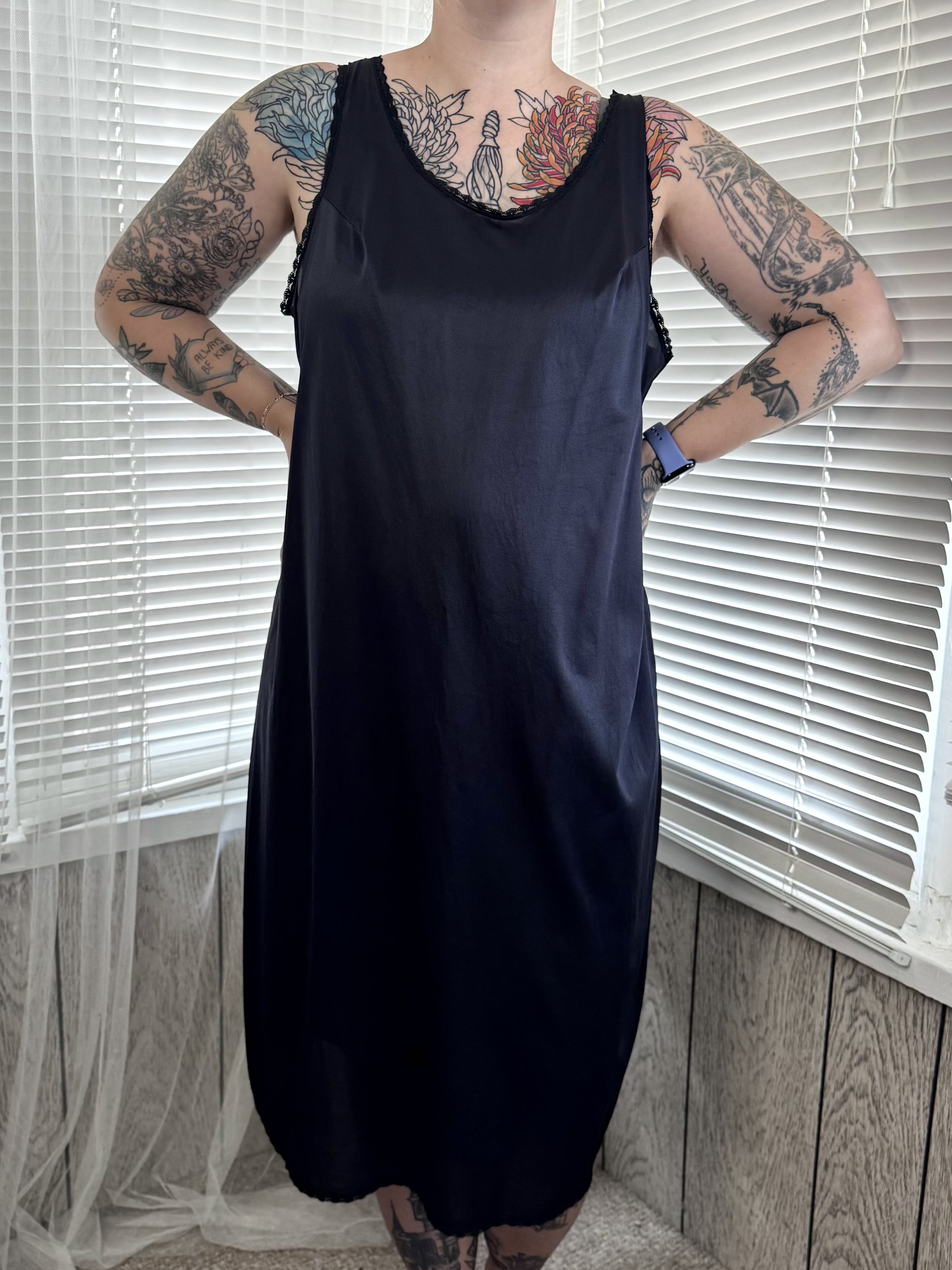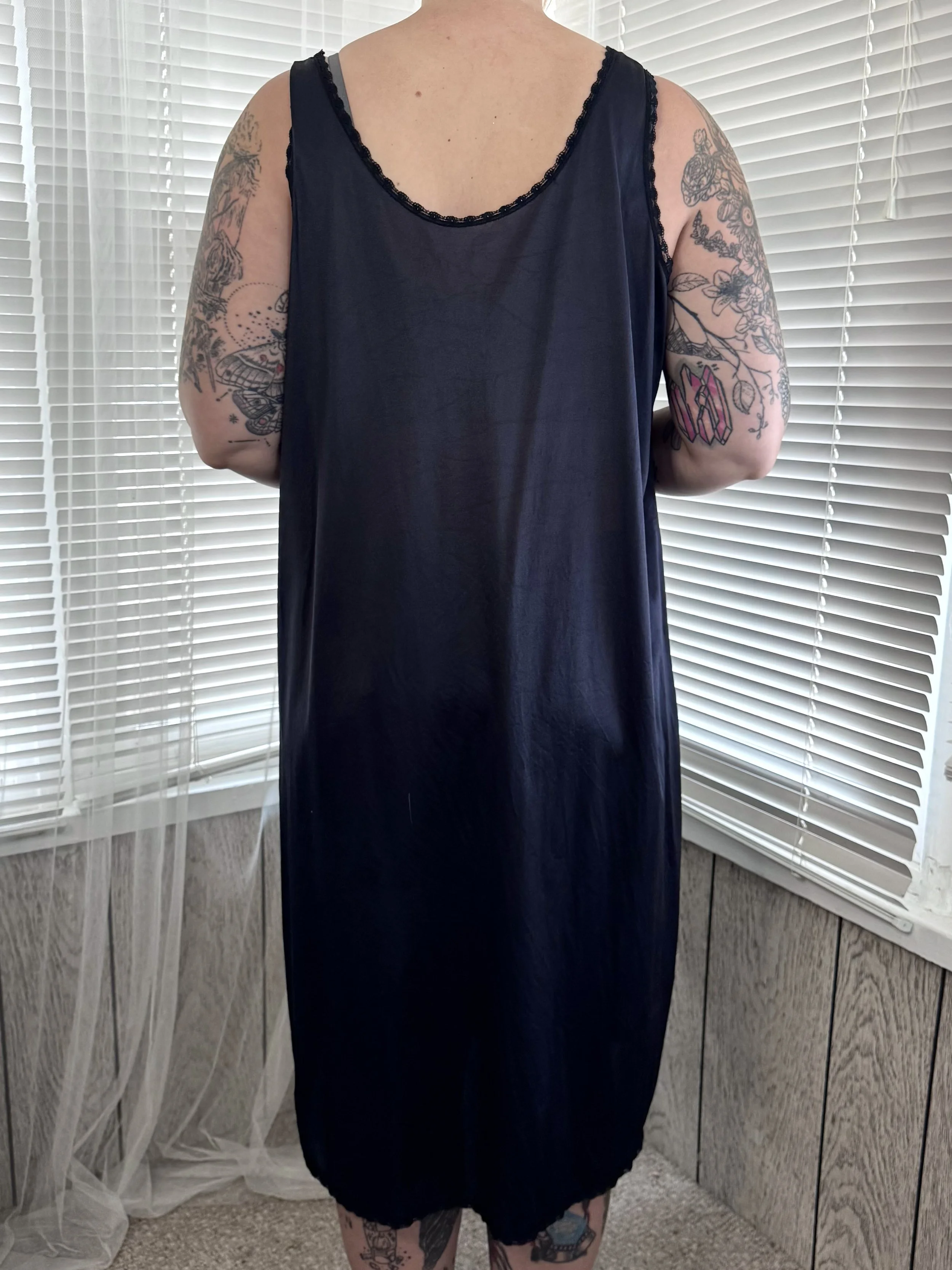 Vintage Velrose black lace-trimmed slip dress. Material is semi-sheer. Straps are not adjustable. Slips on, no zipper or button closures.