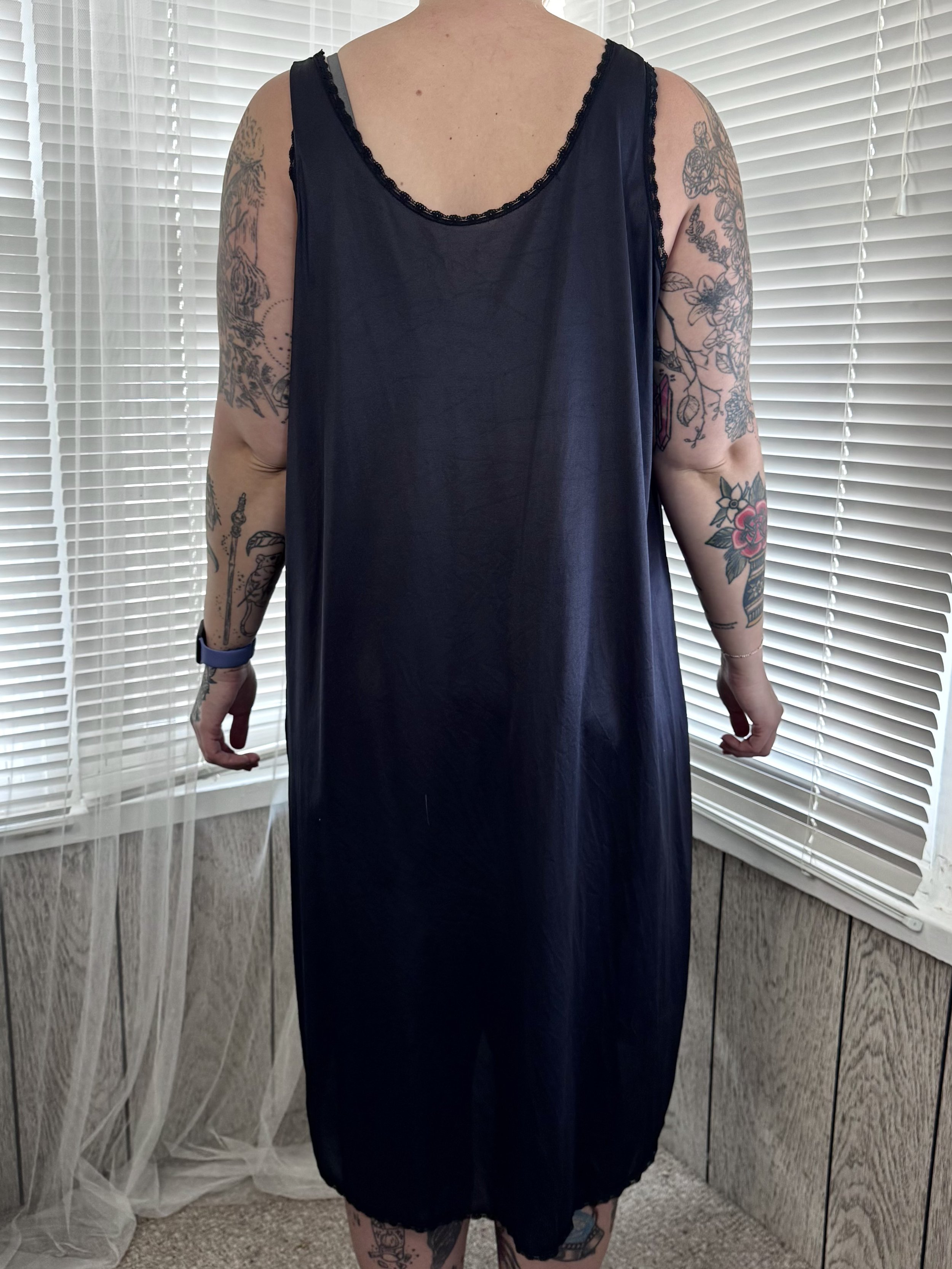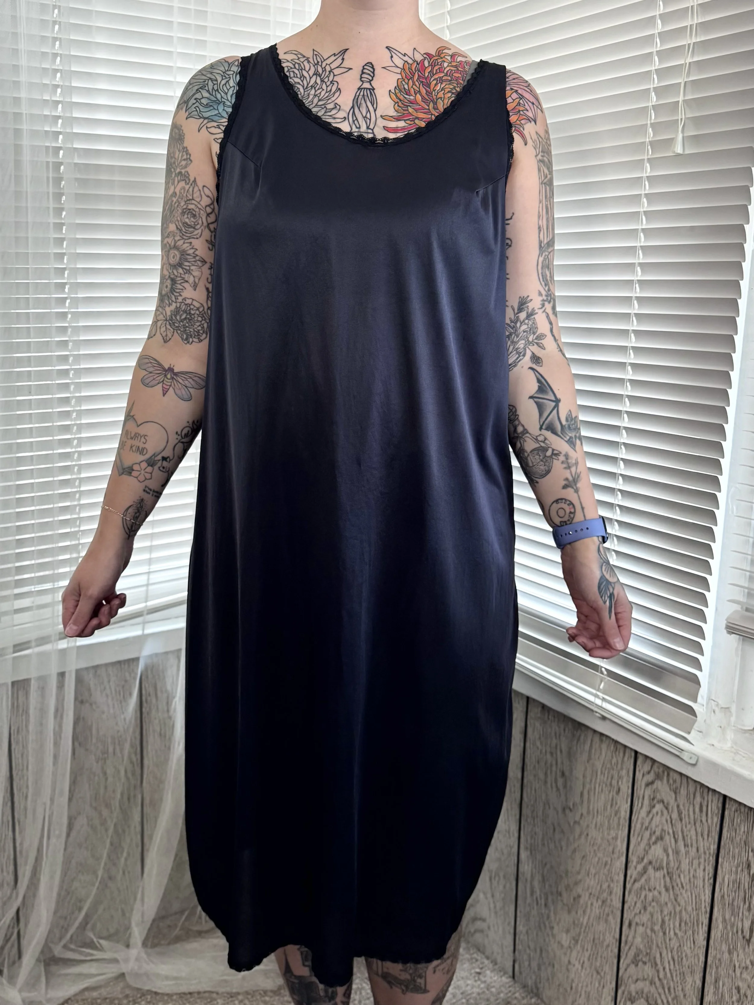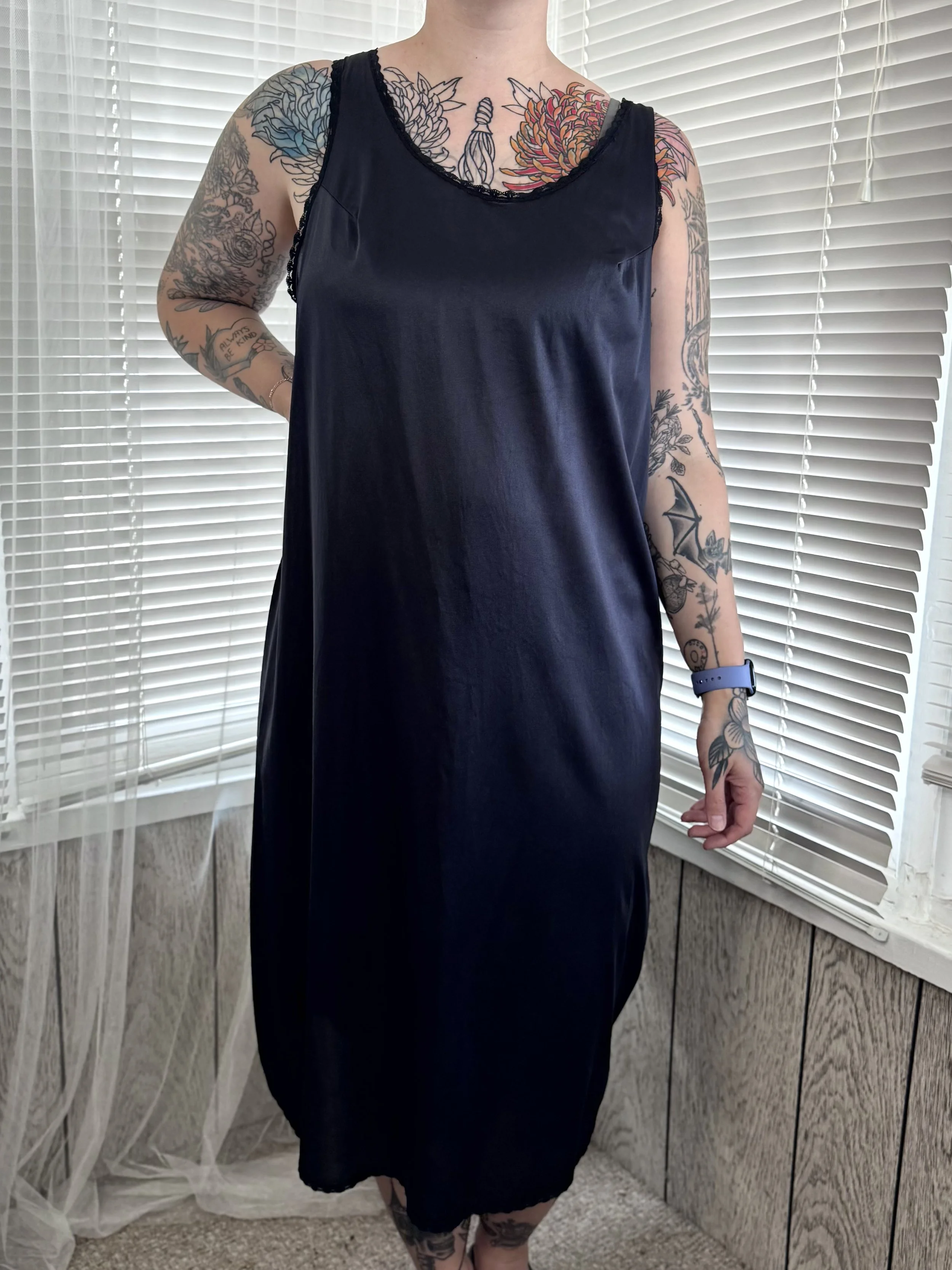 Vintage Velrose black lace-trimmed slip dress. Material is semi-sheer. Straps are not adjustable. Slips on, no zipper or button closures.