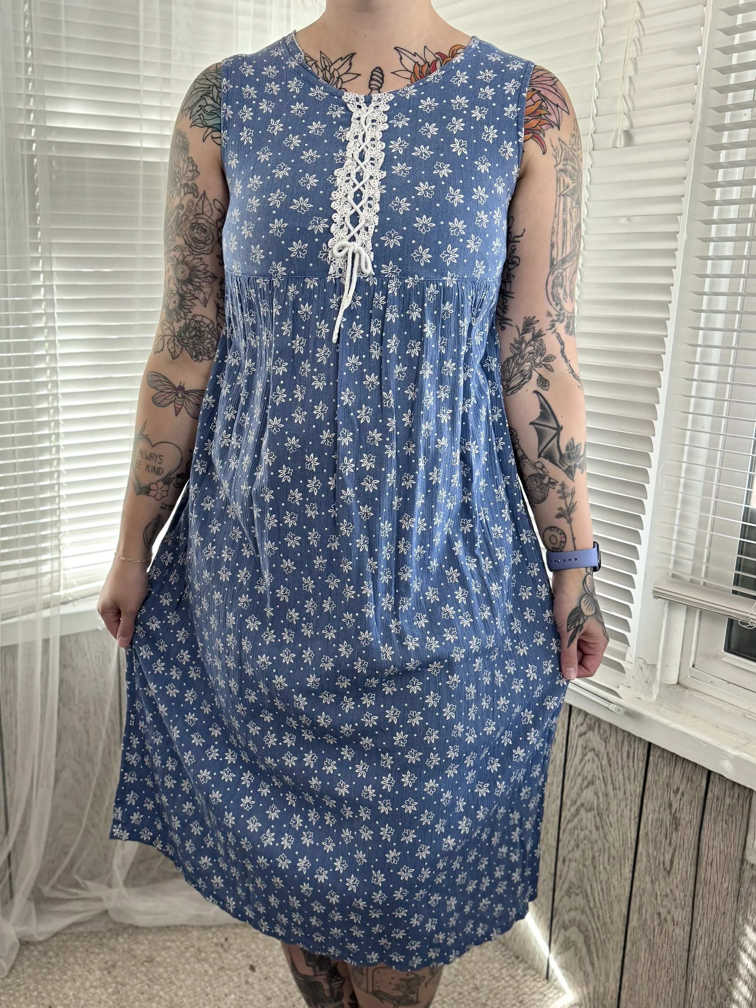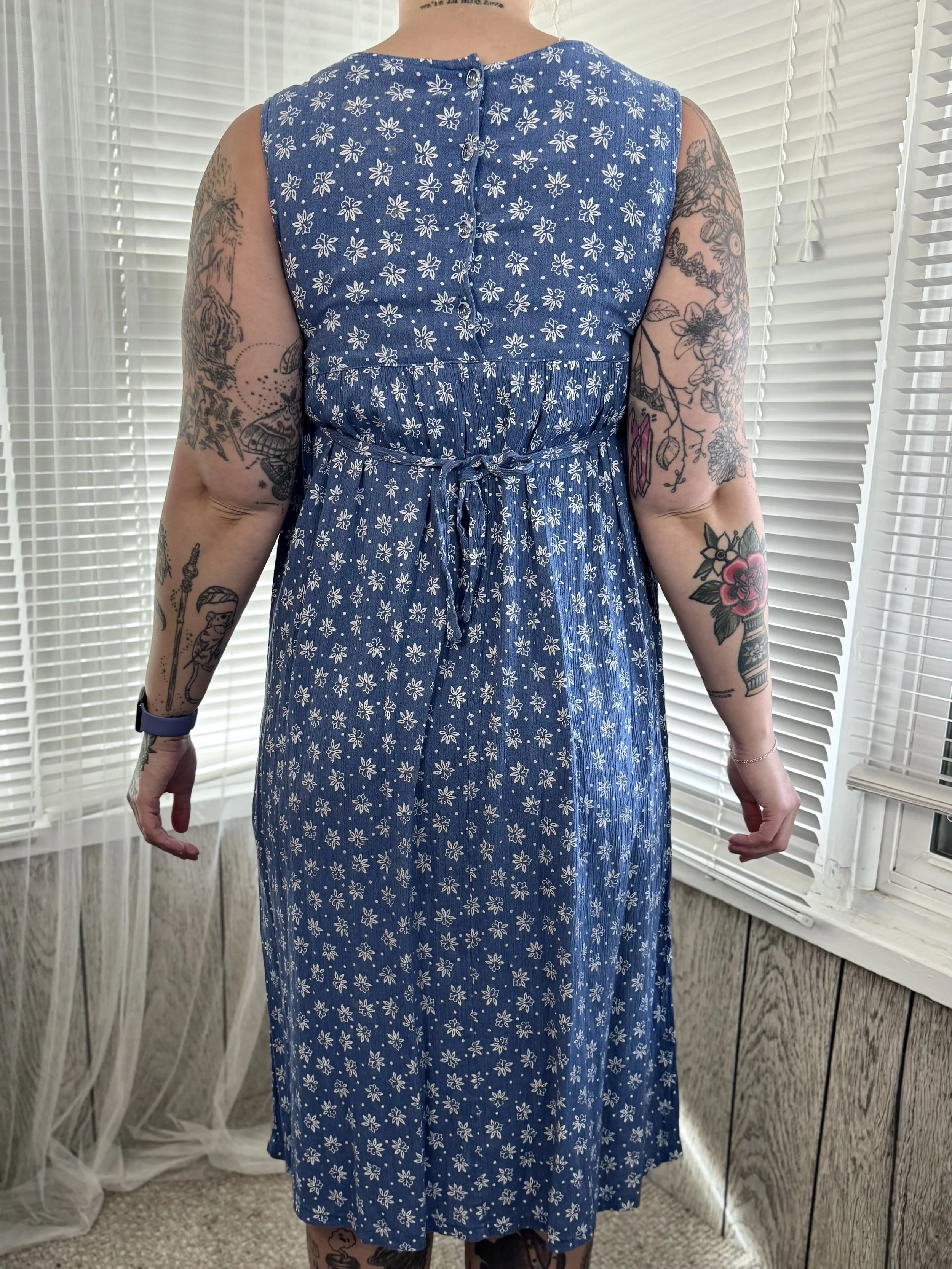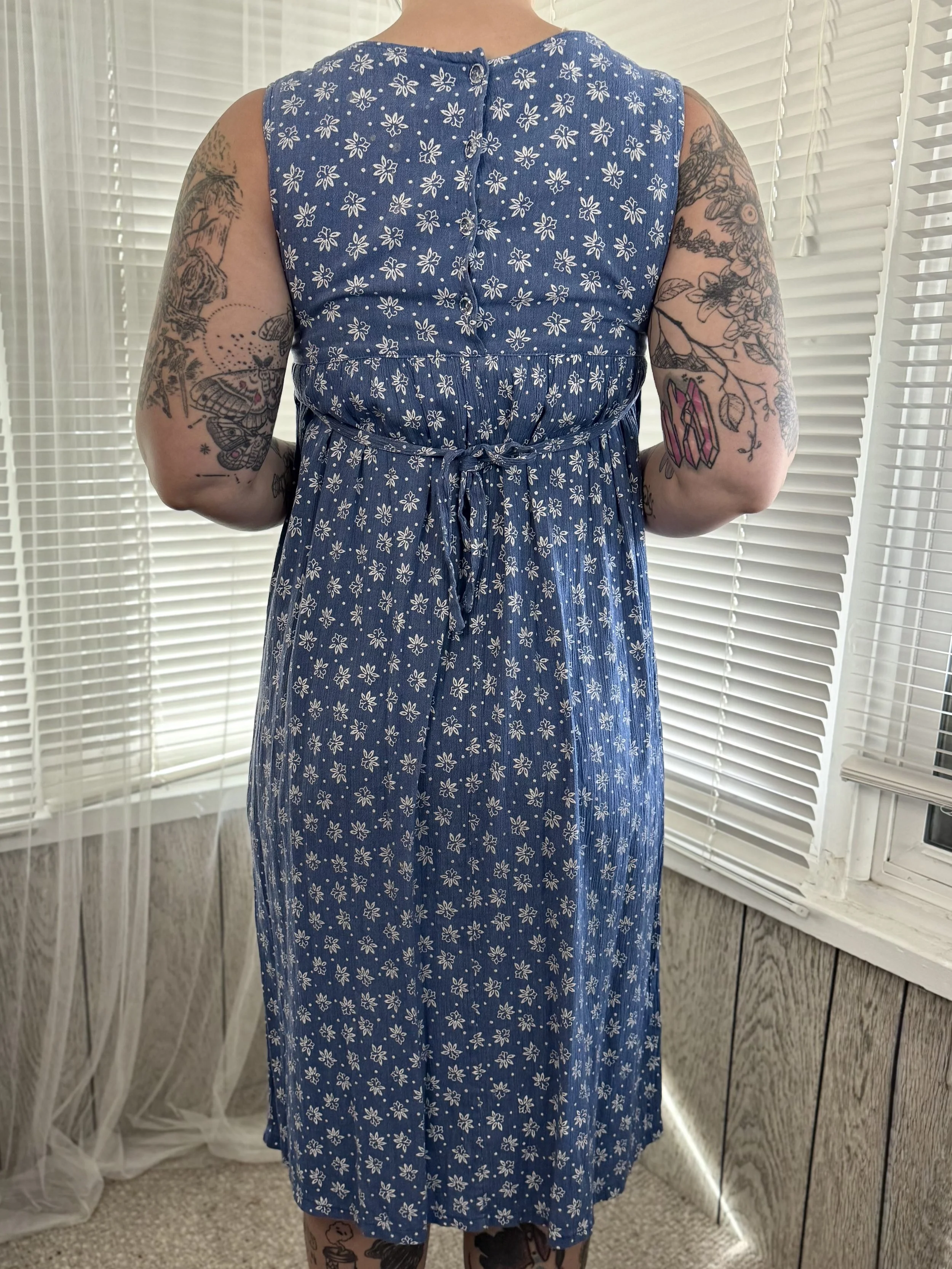 Thrifted blue and white floral babydoll midi dress. Features lace-up detail in front - does not affect fit. Four button closure in back on top of dress and tie at waist to adjust fit. **Emily’s personal opinion - due to style of dress, I would recommend this fit for a size small OR size medium with a smaller bust as the seam and tie hit right under bust line.