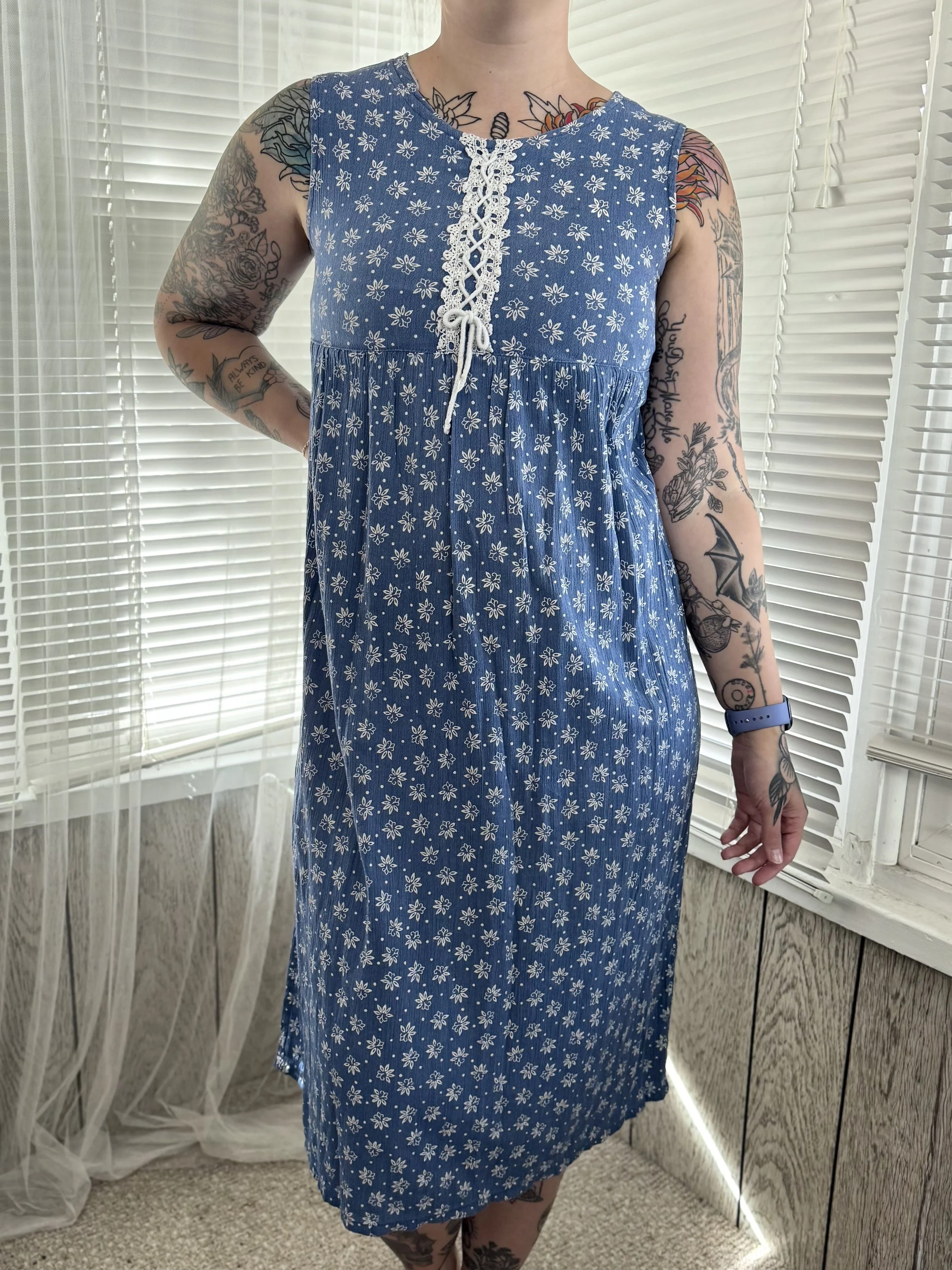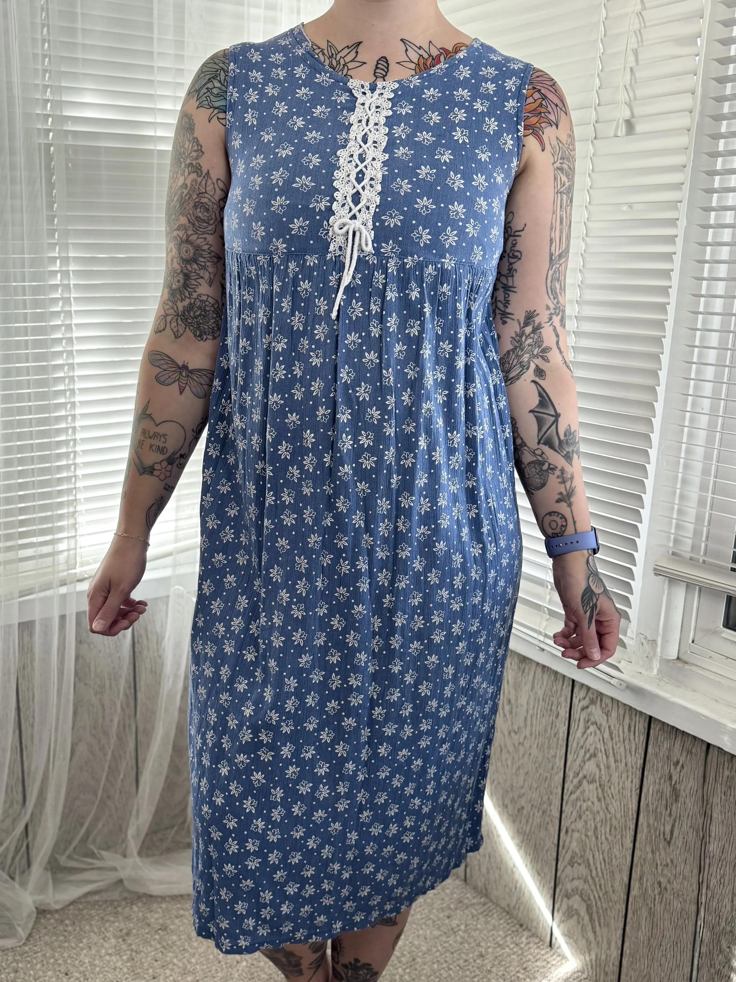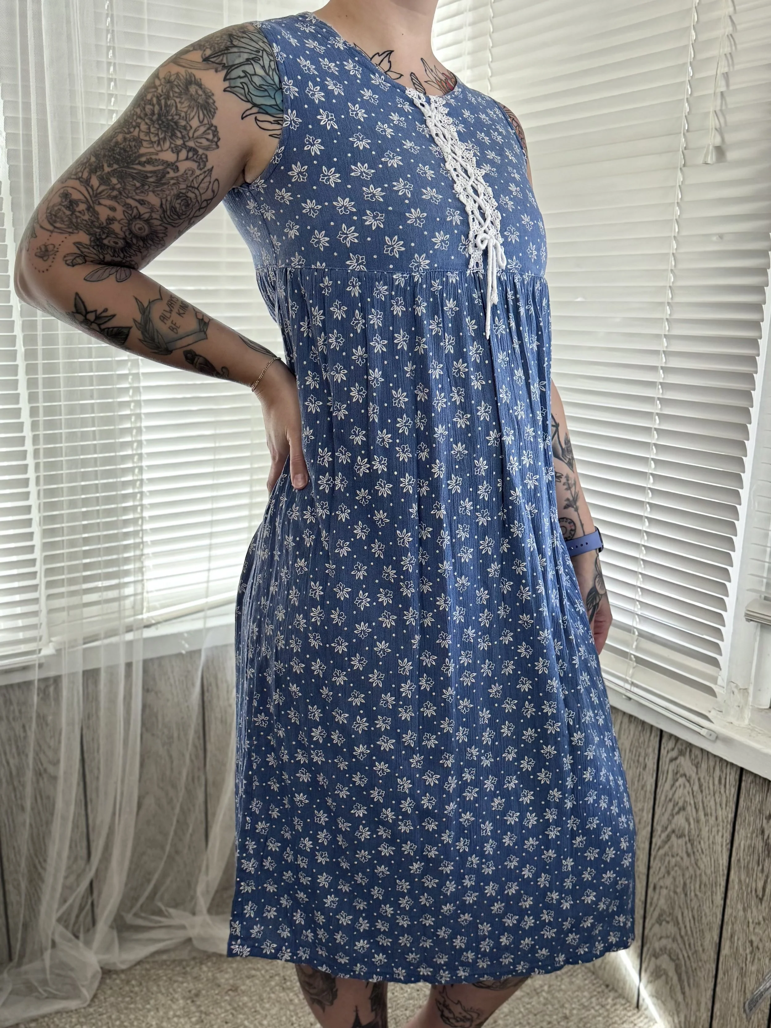 Thrifted blue and white floral babydoll midi dress. Features lace-up detail in front - does not affect fit. Four button closure in back on top of dress and tie at waist to adjust fit. **Emily’s personal opinion - due to style of dress, I would recommend this fit for a size small OR size medium with a smaller bust as the seam and tie hit right under bust line.