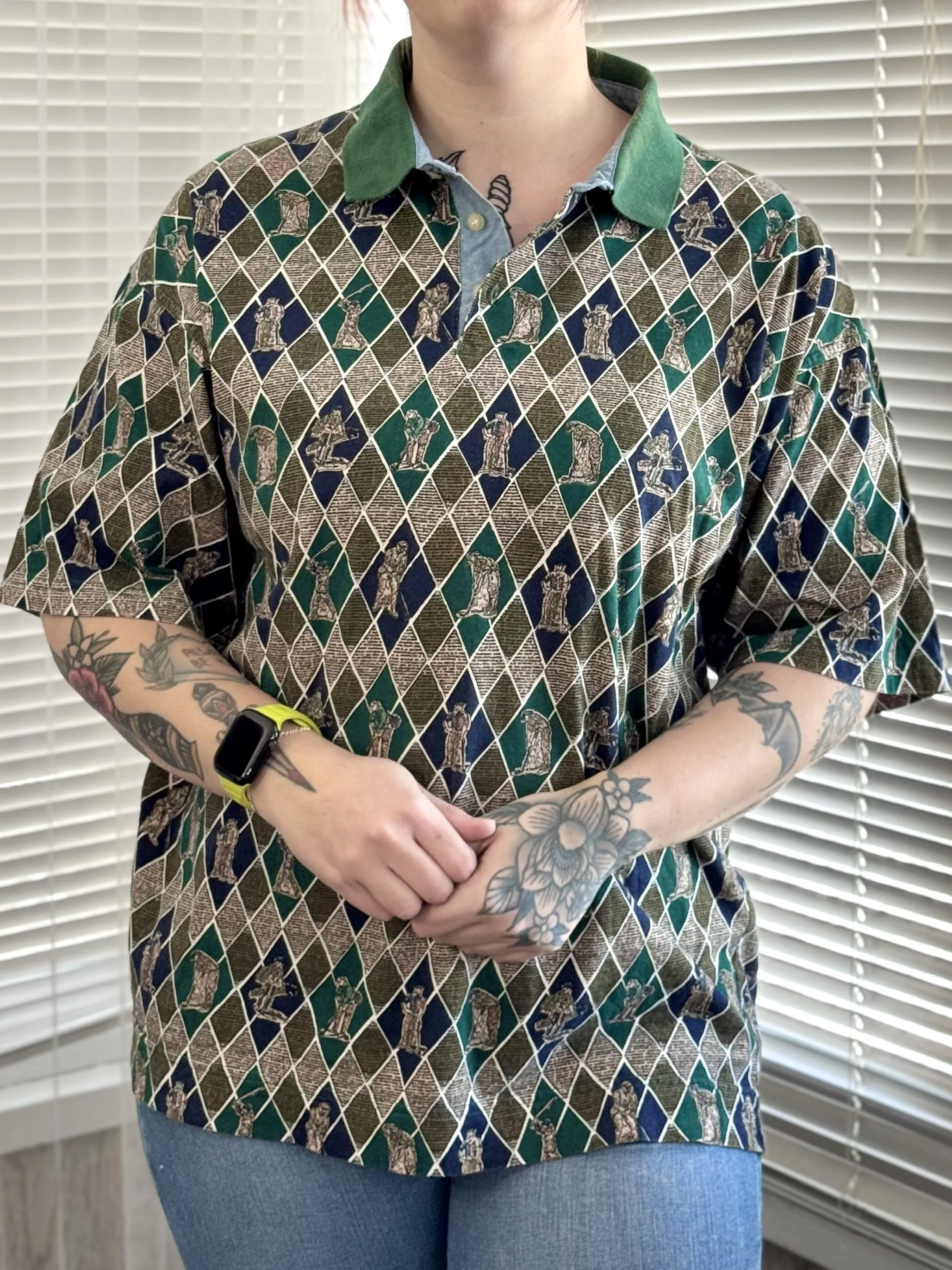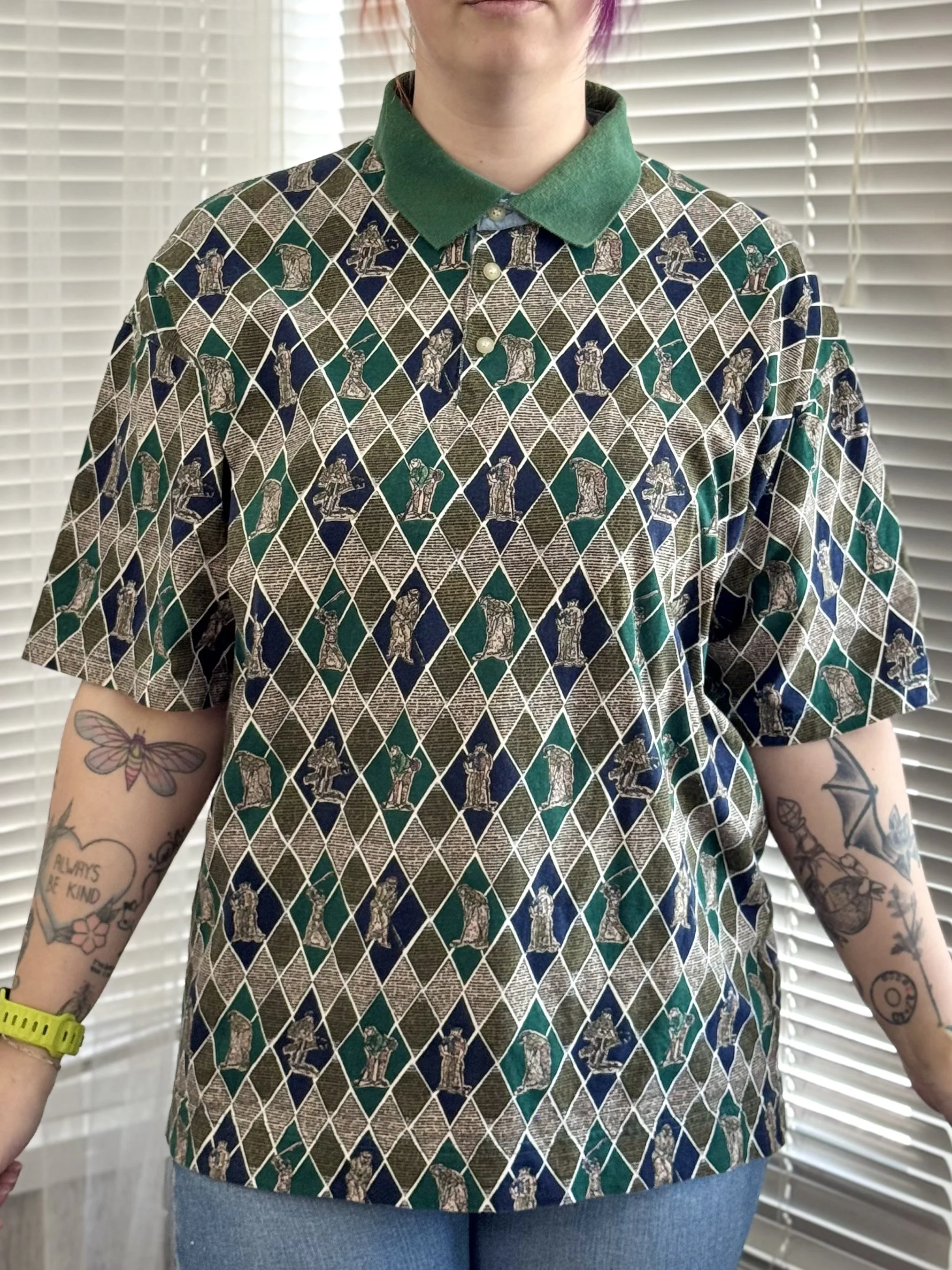 Vintage Bugle Boy Co golfer print polo tee. Features short 3-button closure at neckline. Print features golfers in various poses on green, navy, and tan diamond-print background.