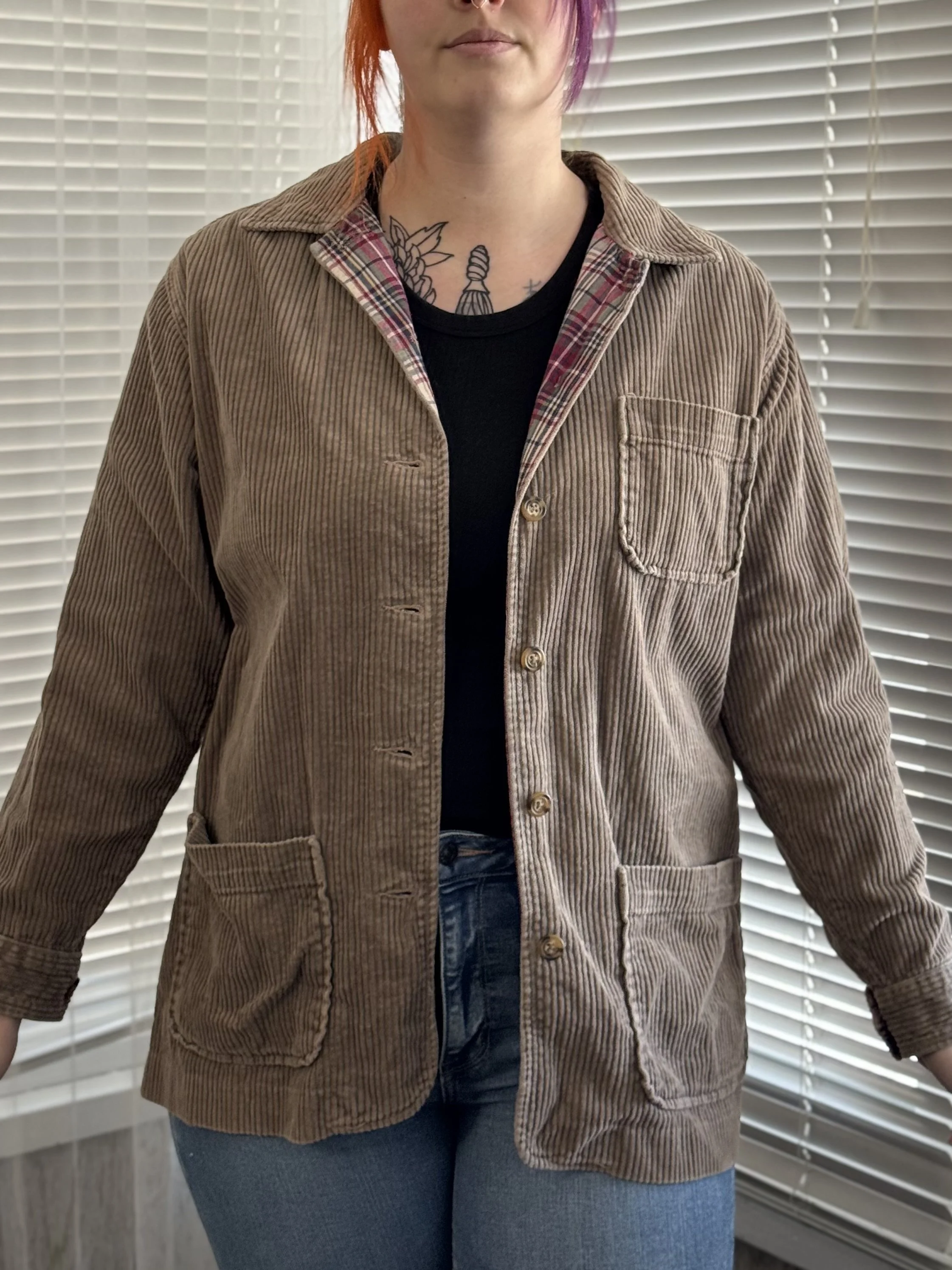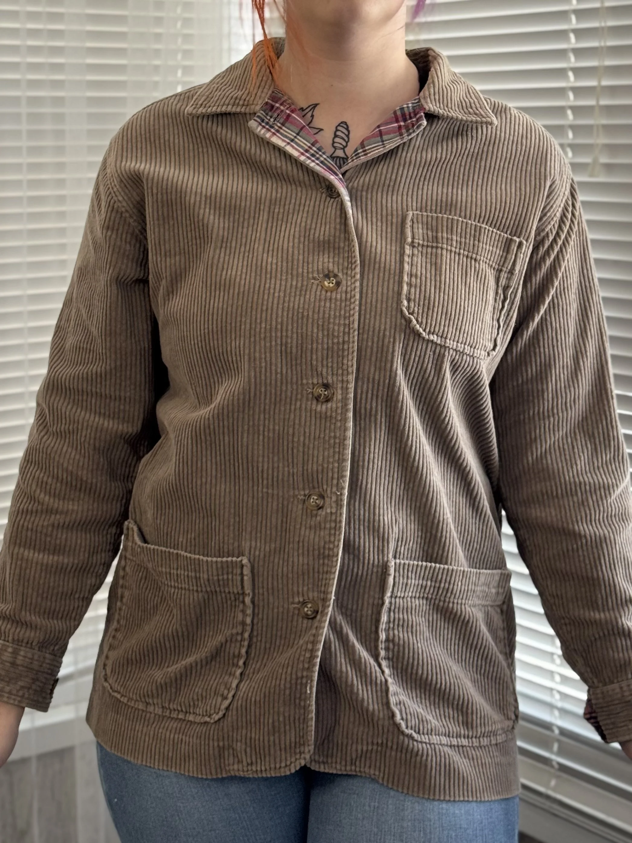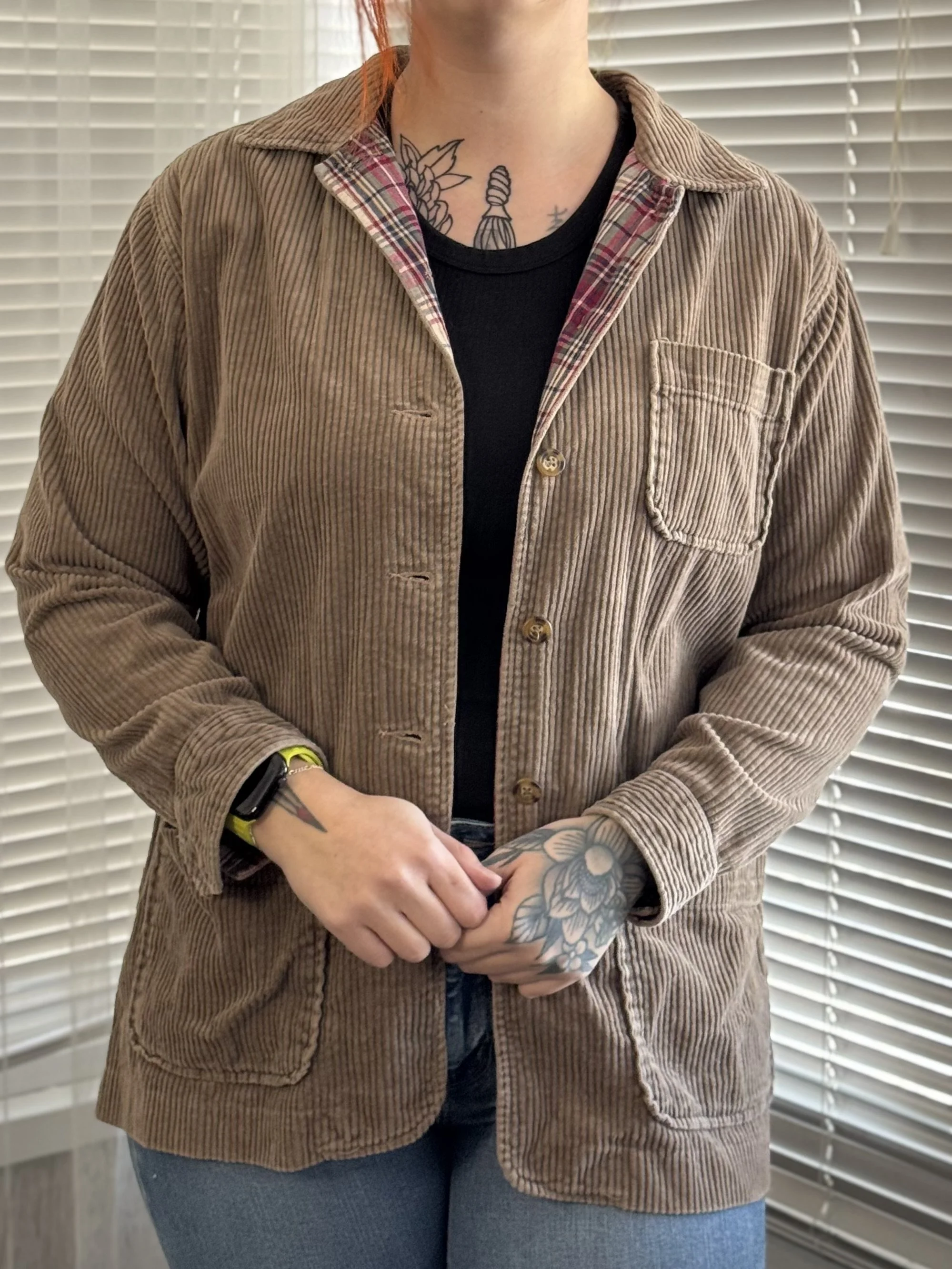 Vintage Cabin Creek tan corduroy jacket with plaid-print lining. Top-to-bottom front button closure, and button wrist closures. Features 3 fully-functional pockets, one on chest and two on bottom on left and right front.