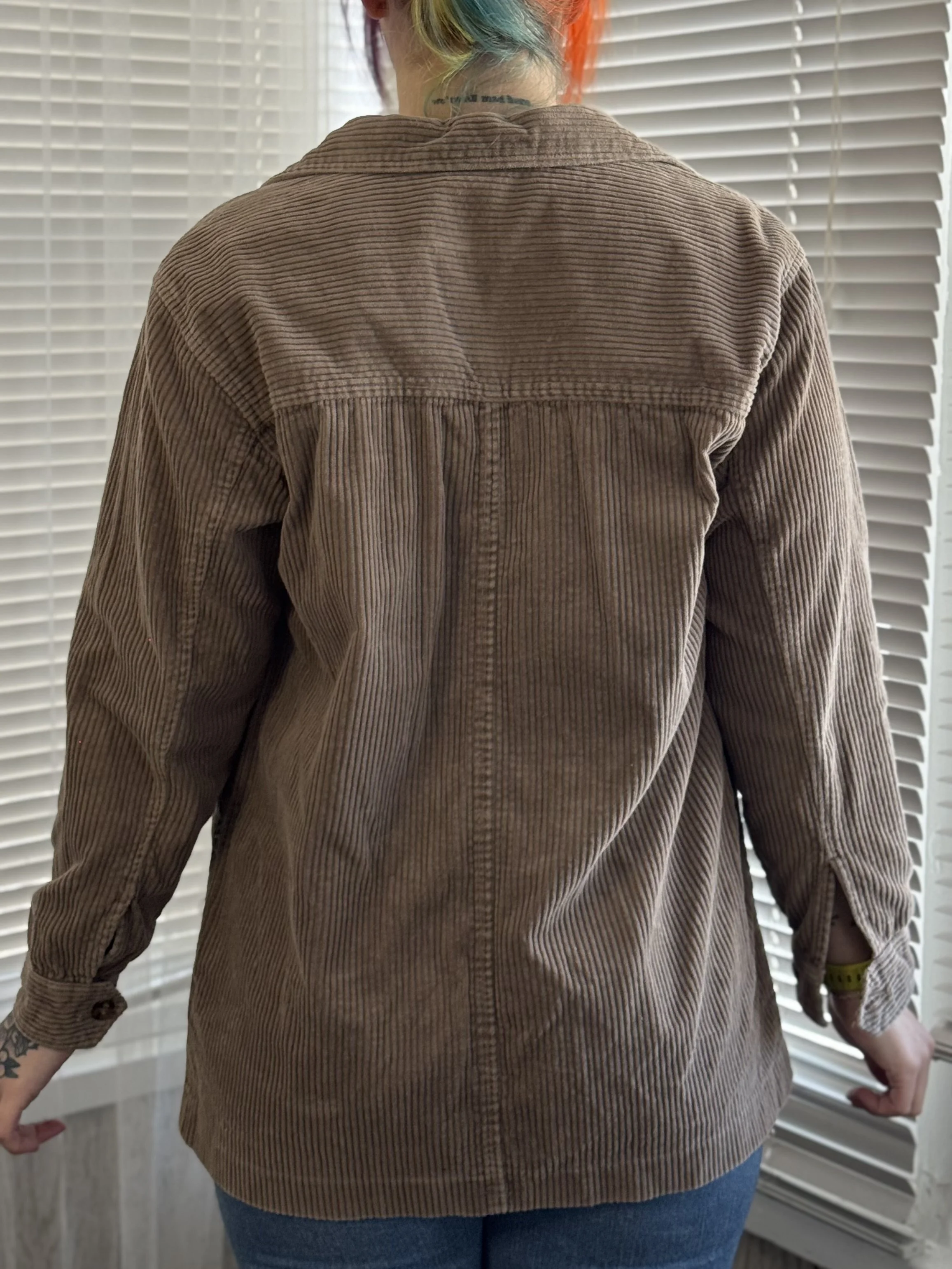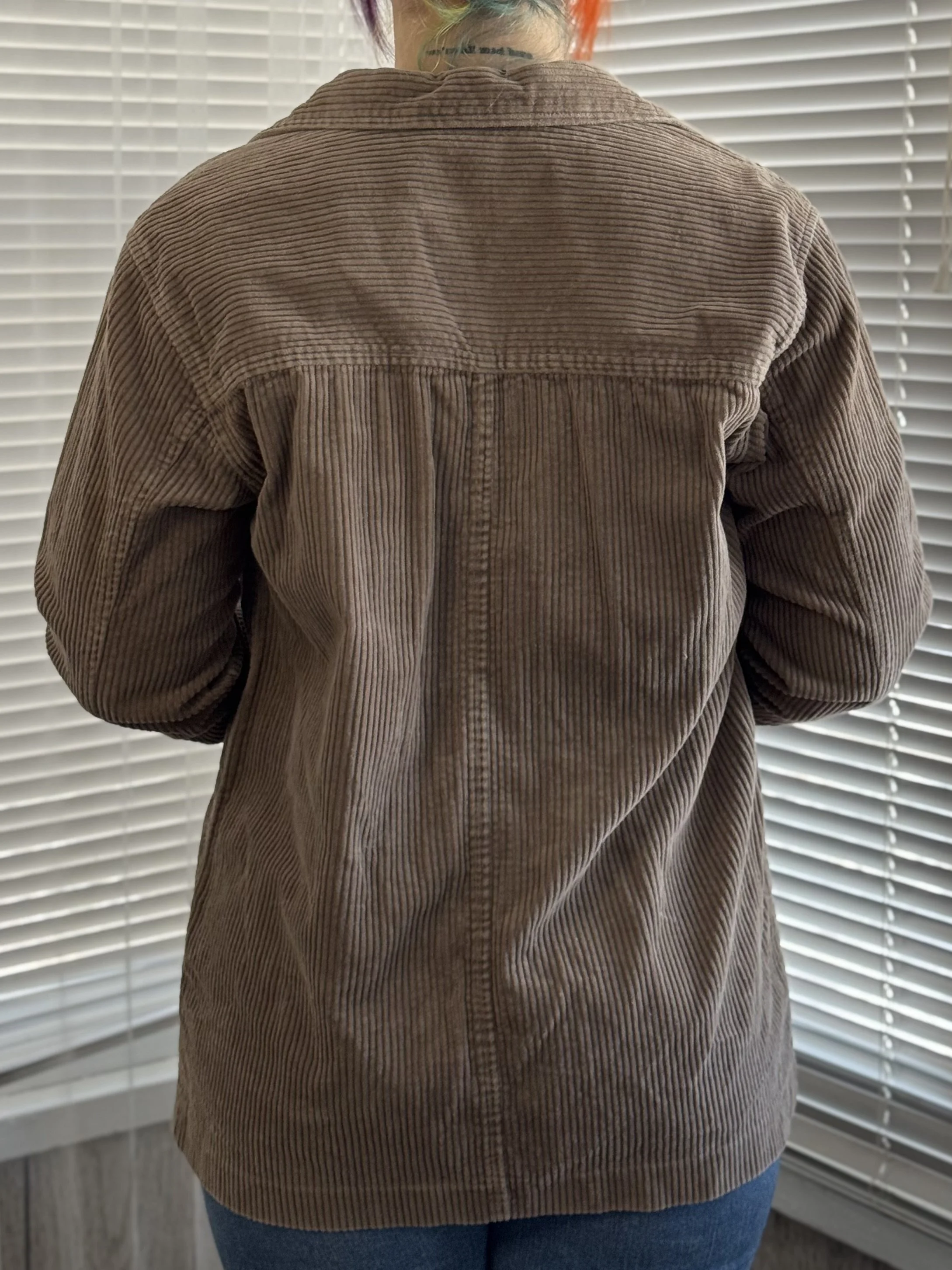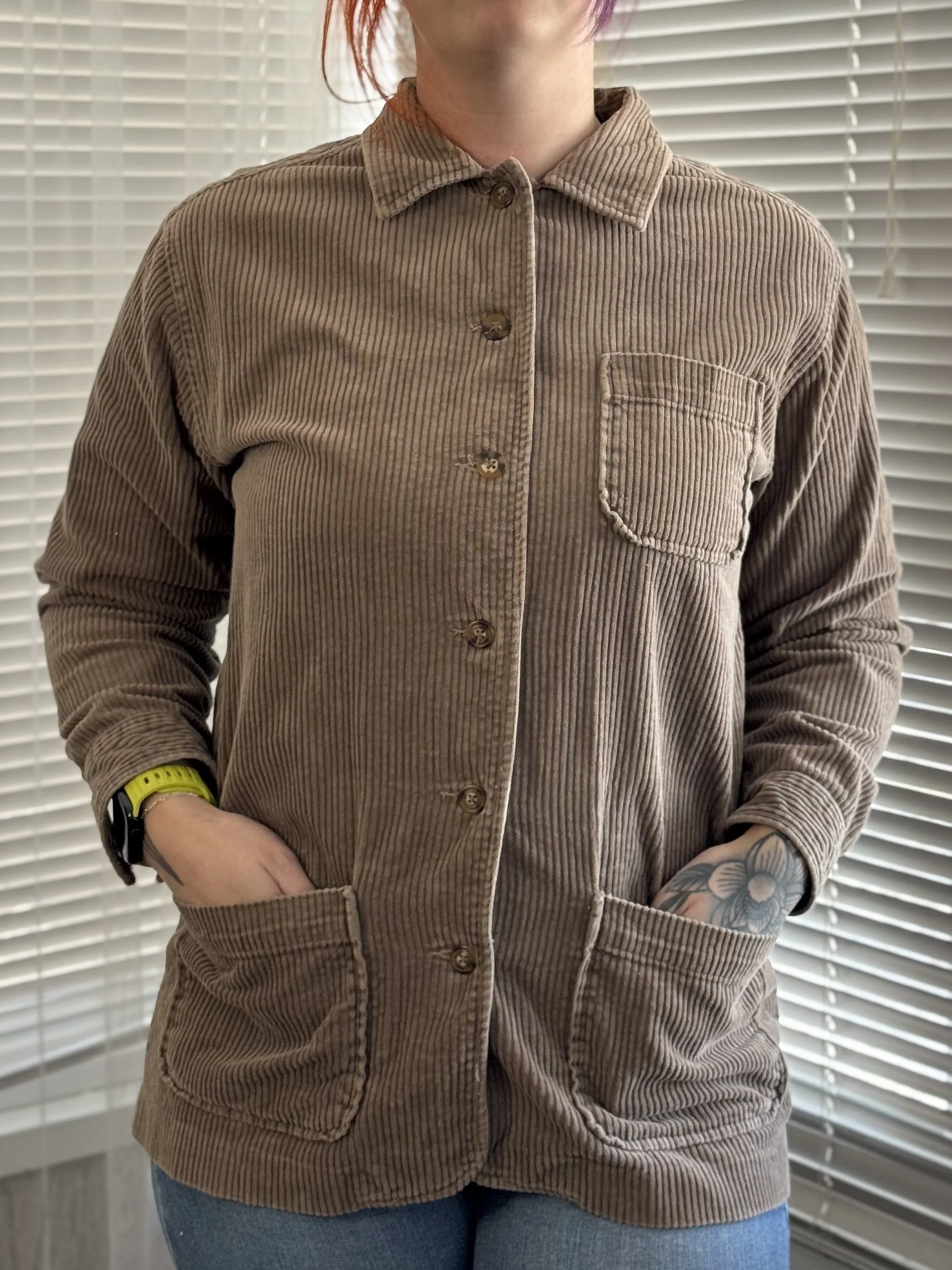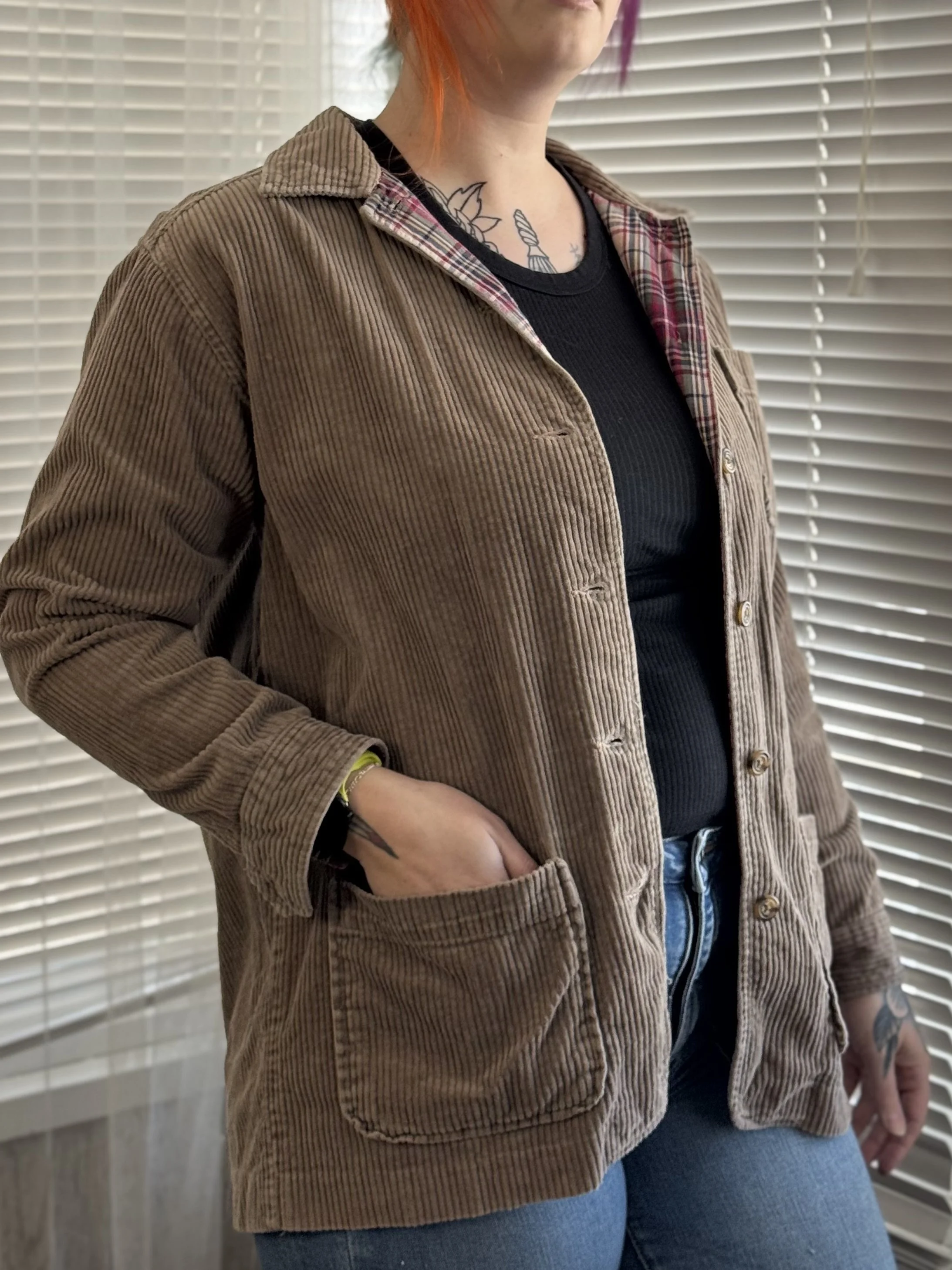 Vintage Cabin Creek tan corduroy jacket with plaid-print lining. Top-to-bottom front button closure, and button wrist closures. Features 3 fully-functional pockets, one on chest and two on bottom on left and right front.
