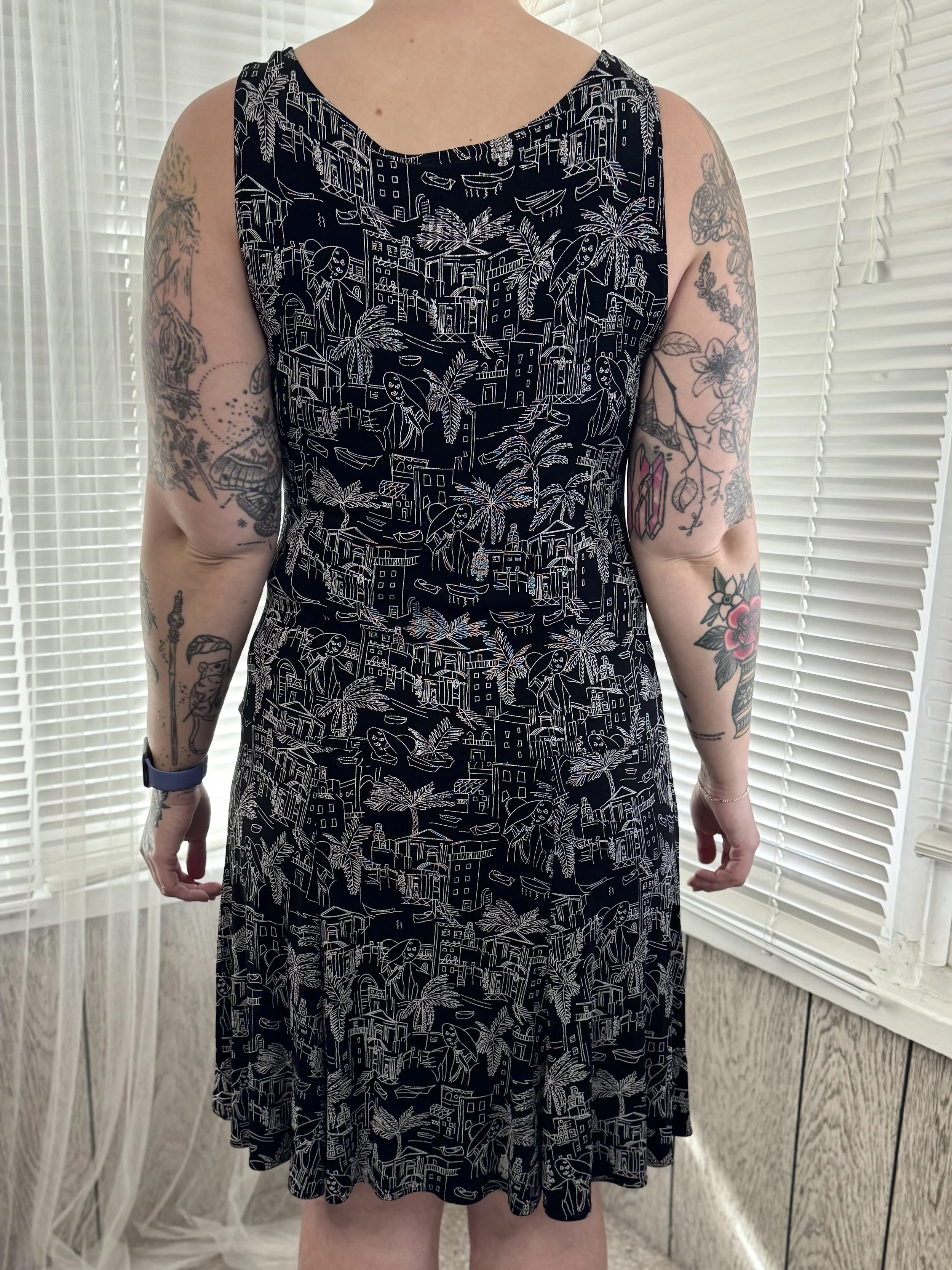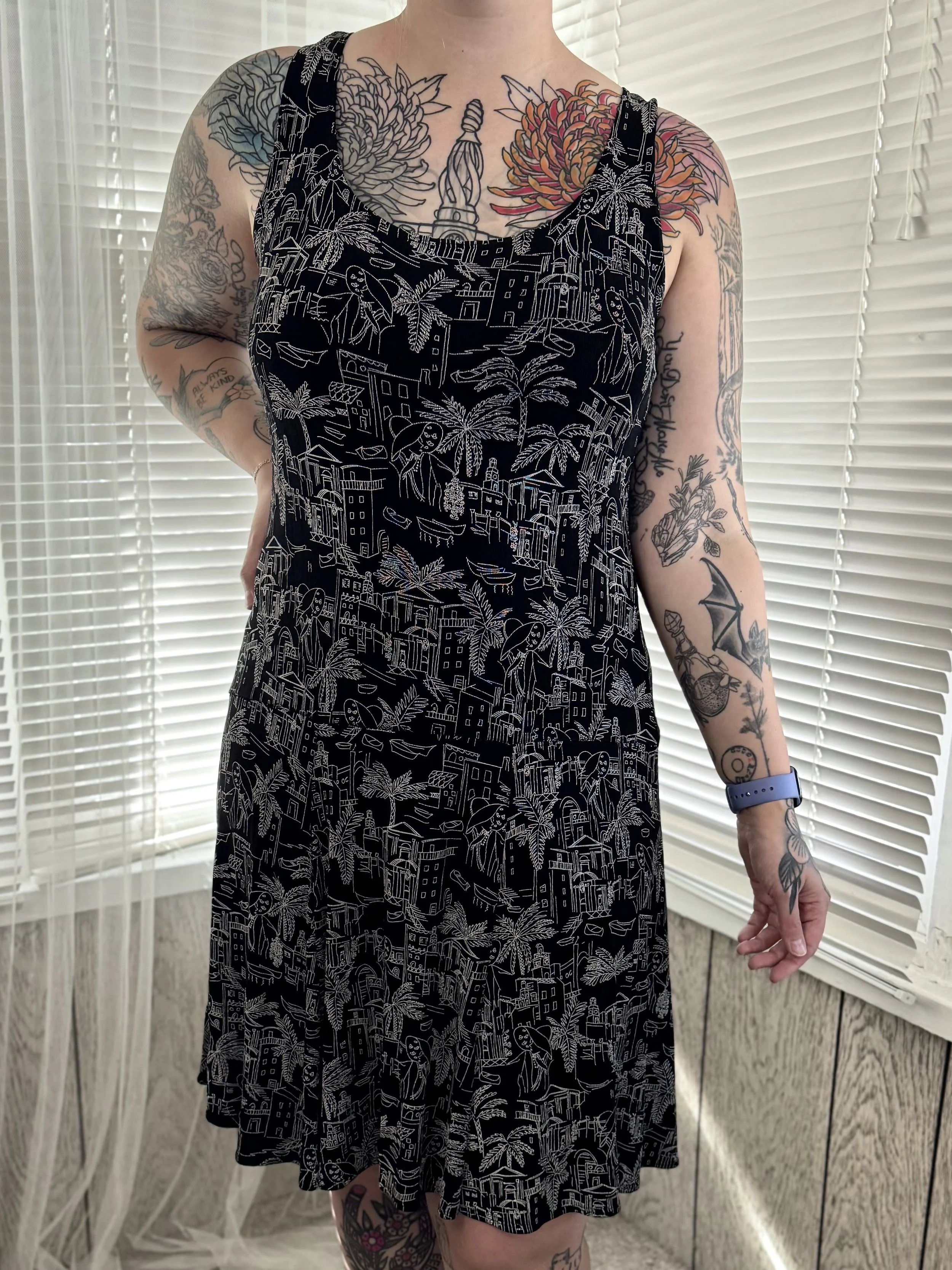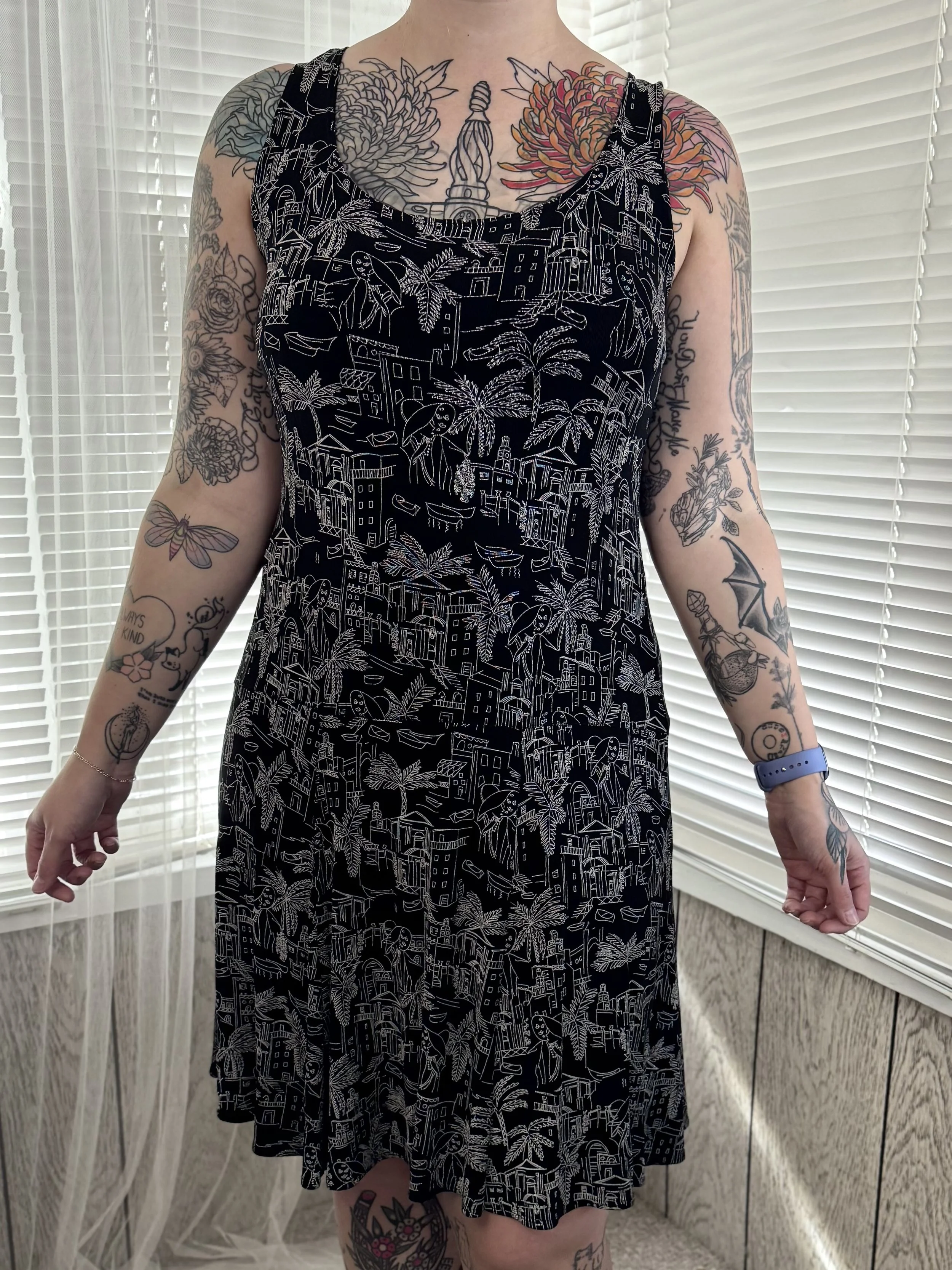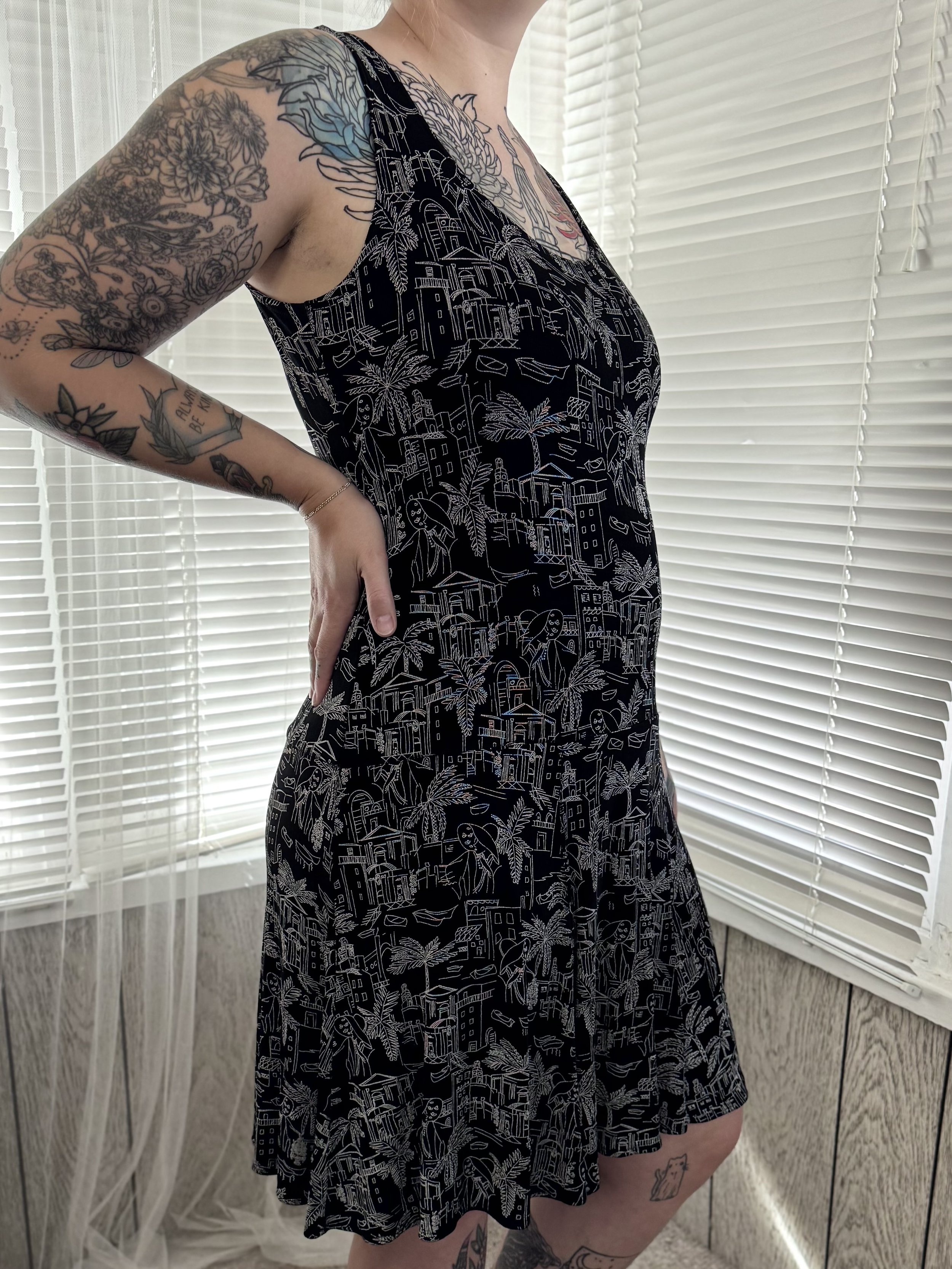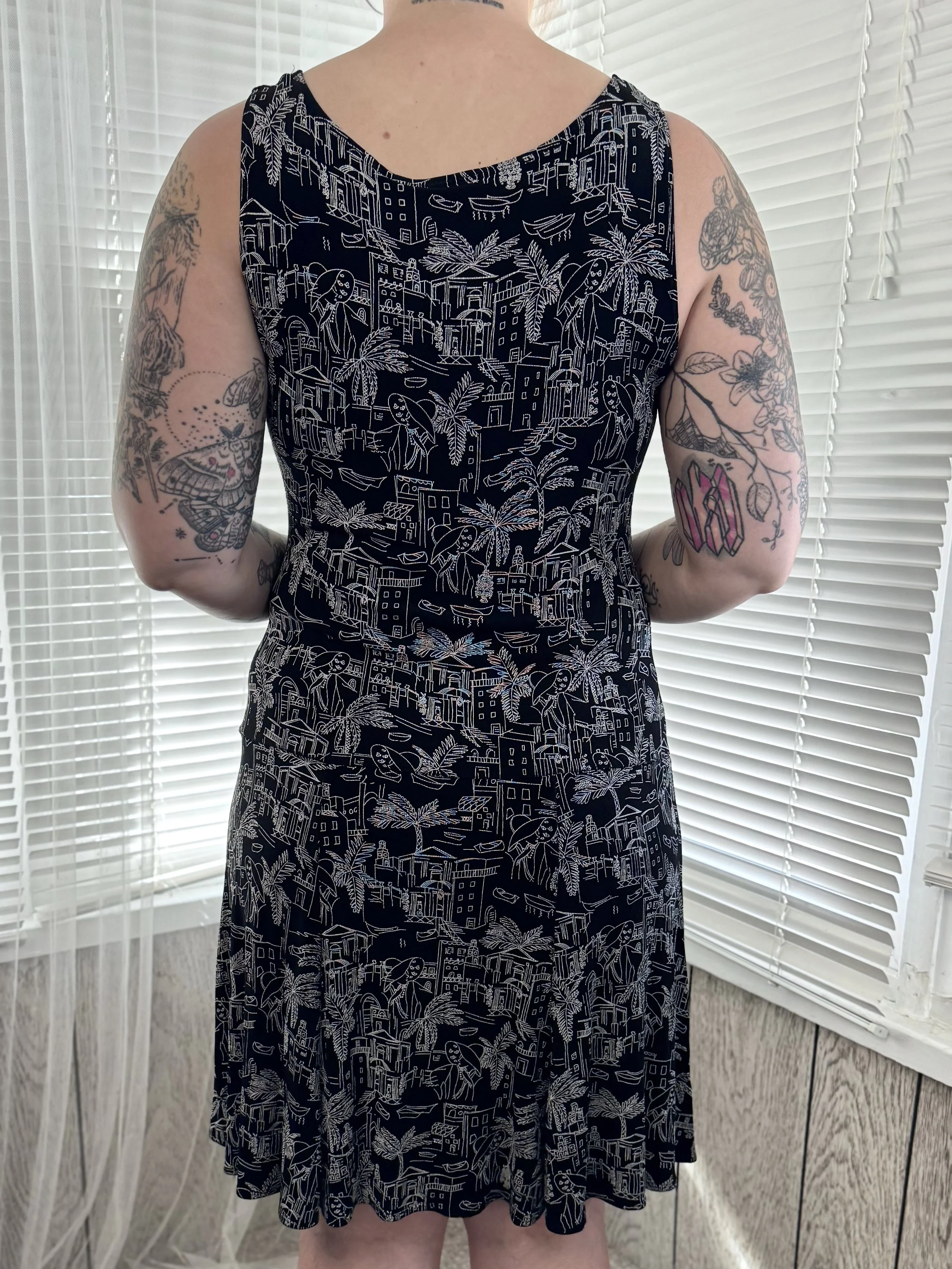 Thrifted Chico’s sleeveless black dress with white cityscape print. Slips on, no zipper or button closures.