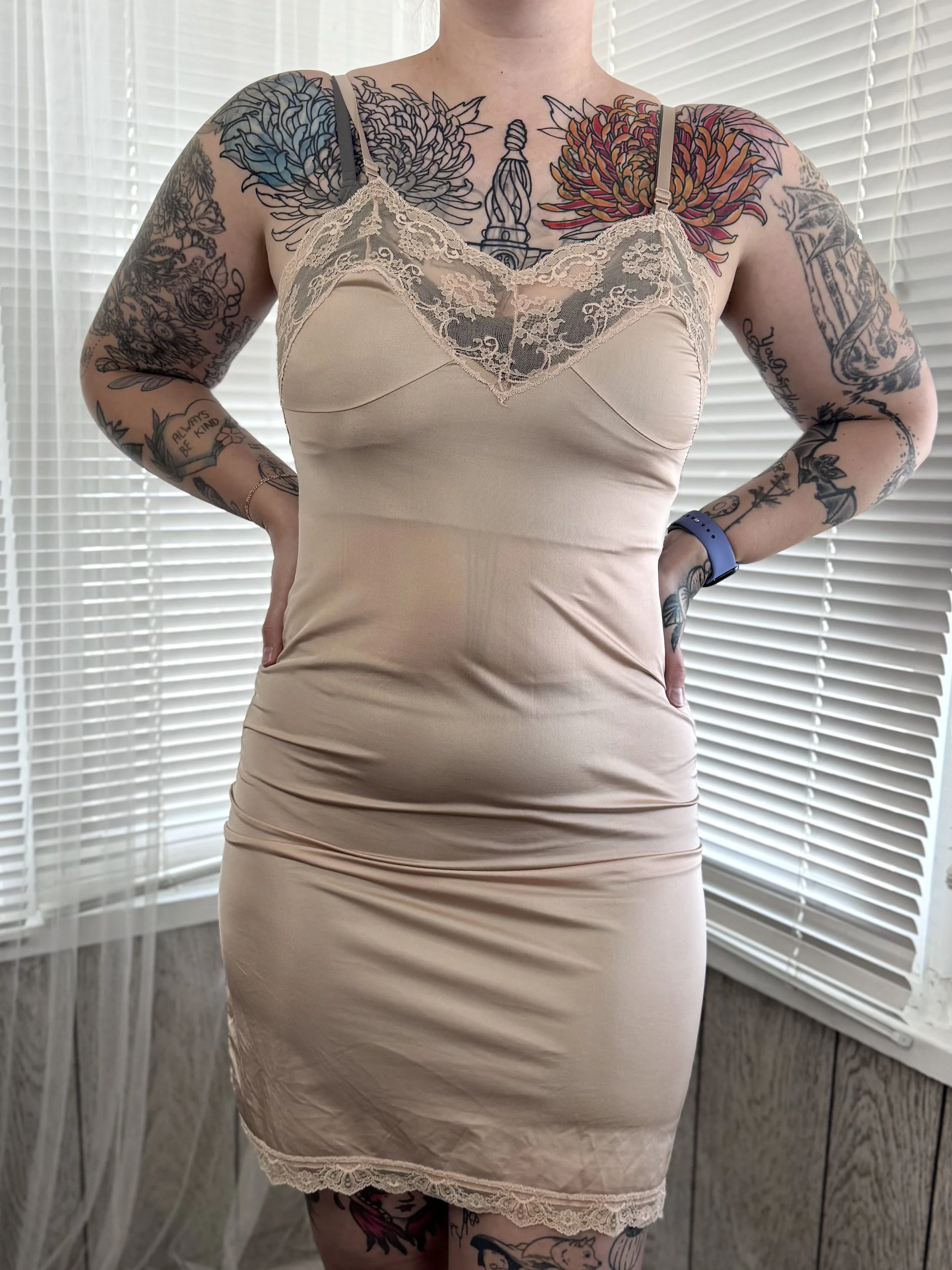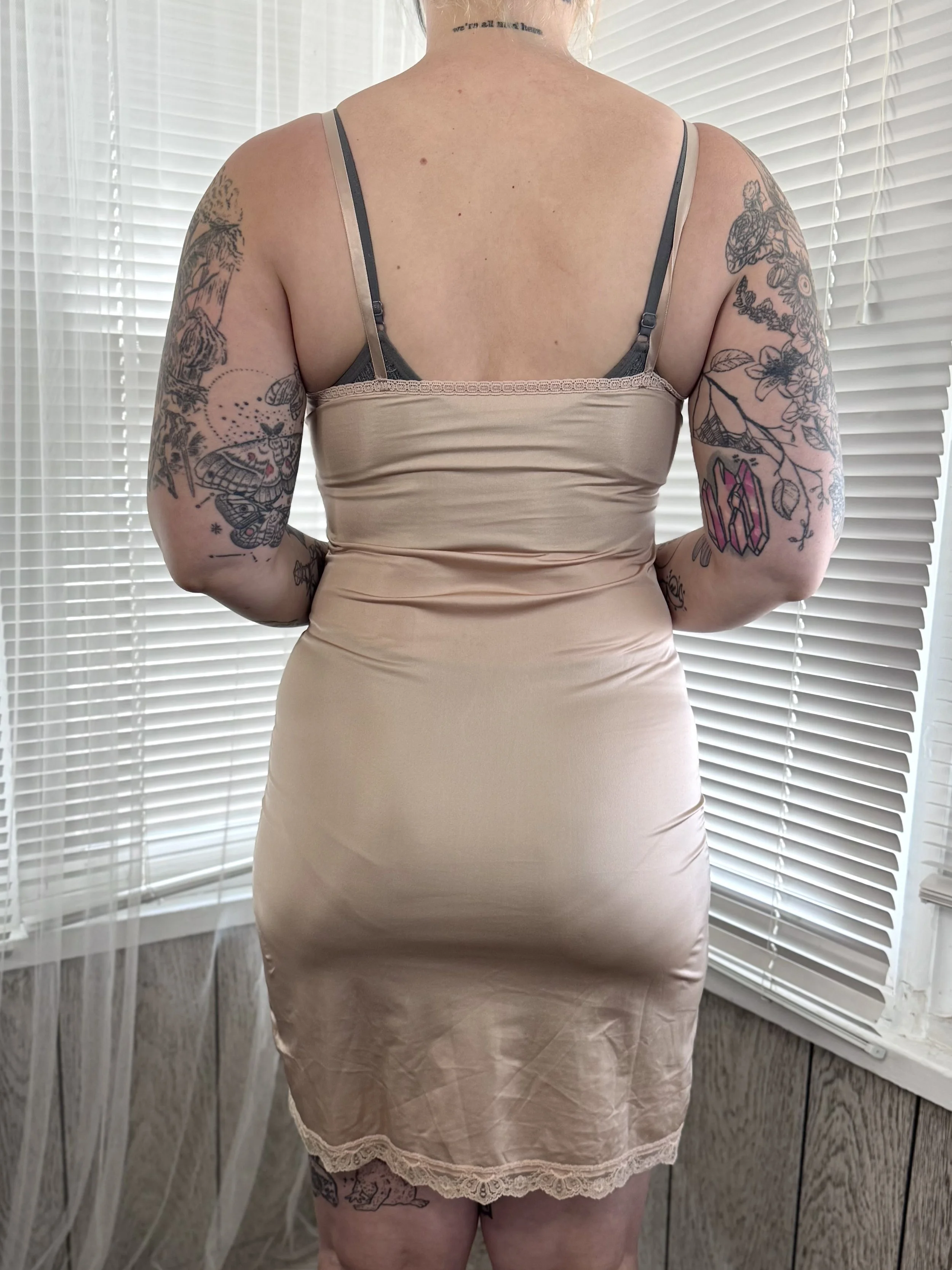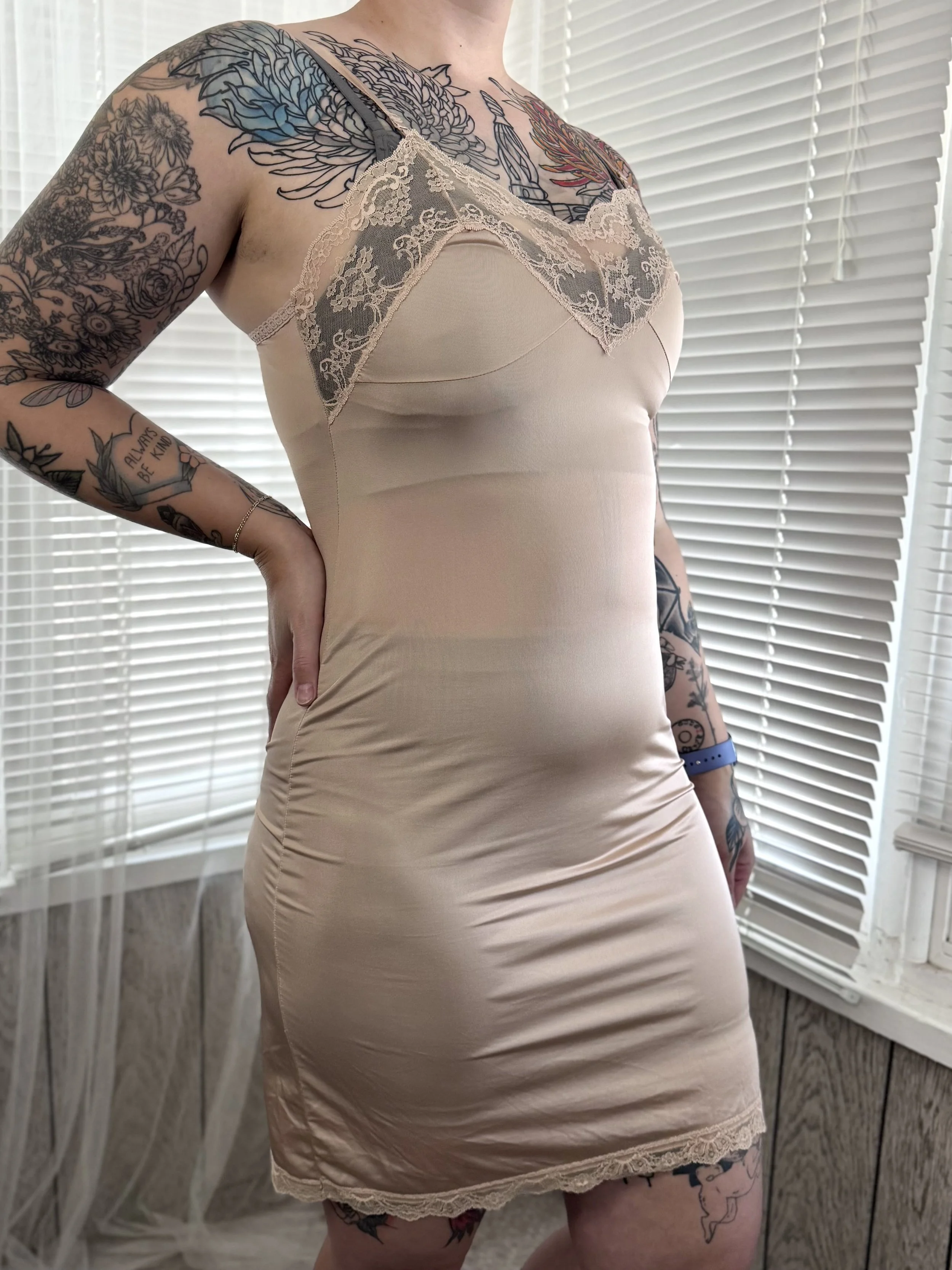Vintage Capri Collection beige slip dress. Material is semi-sheer. Features lace trim on neckline and bottom hem. Straps are adjustable. Slips on overhead, no button or zipper closures.