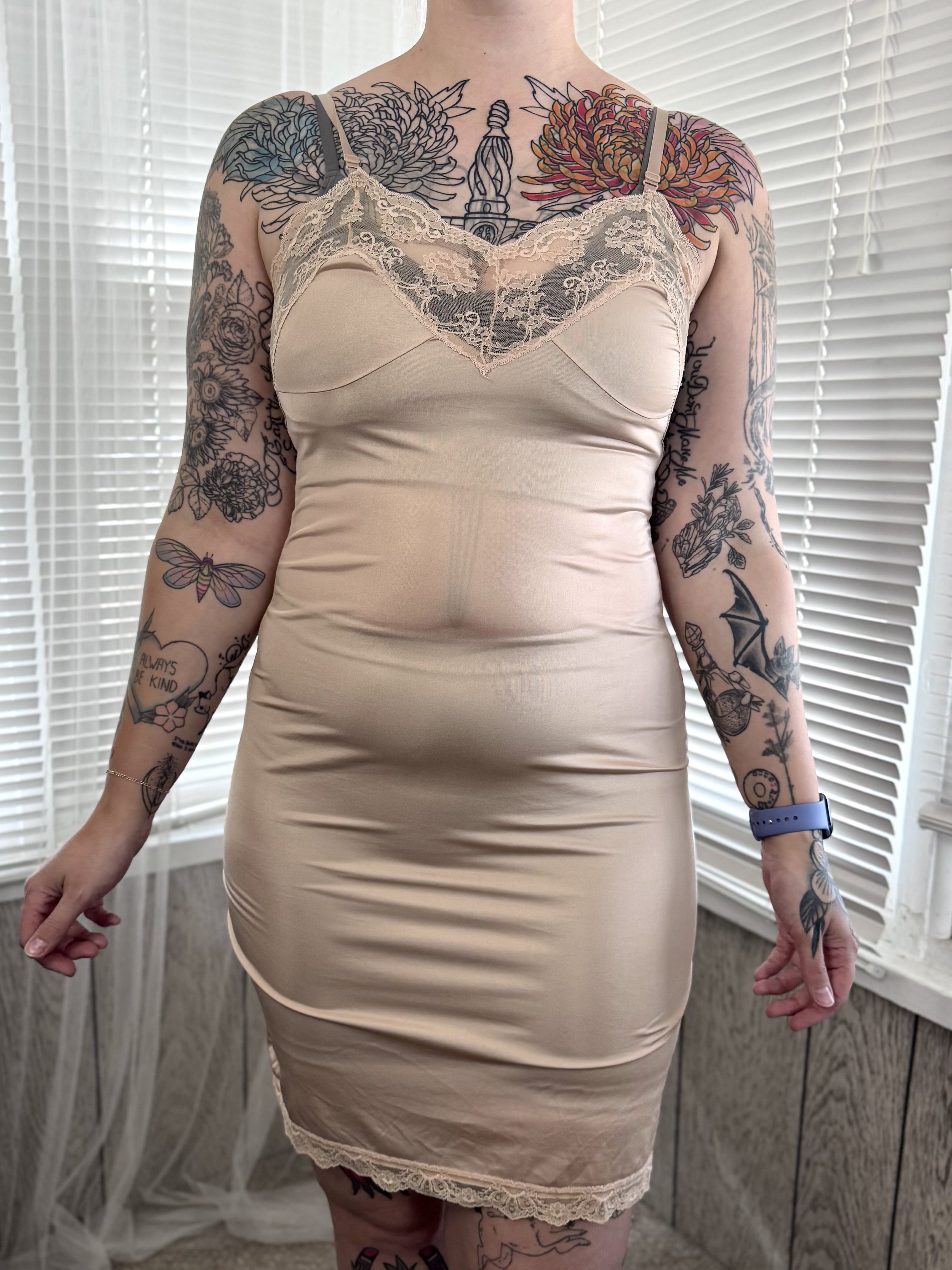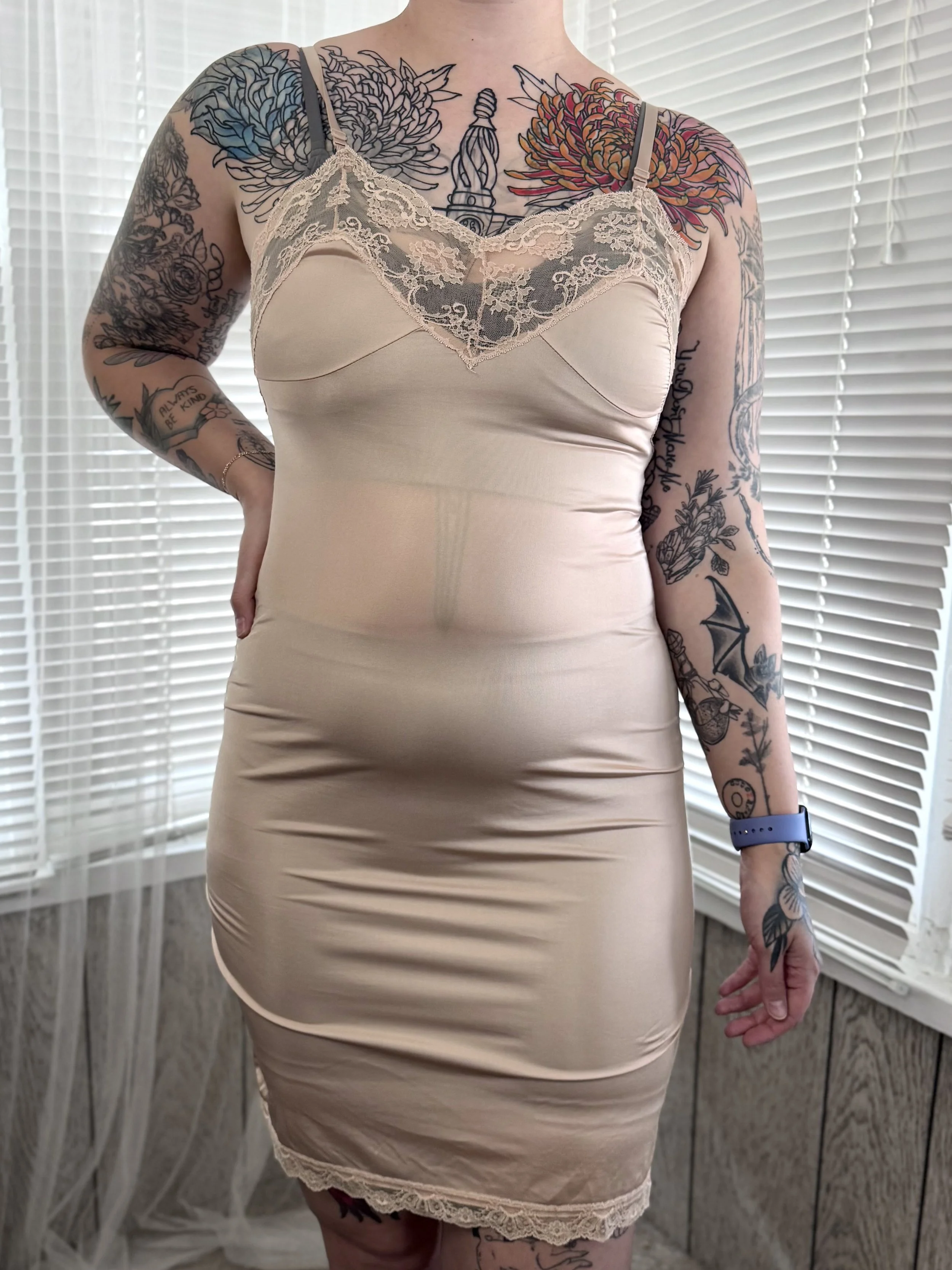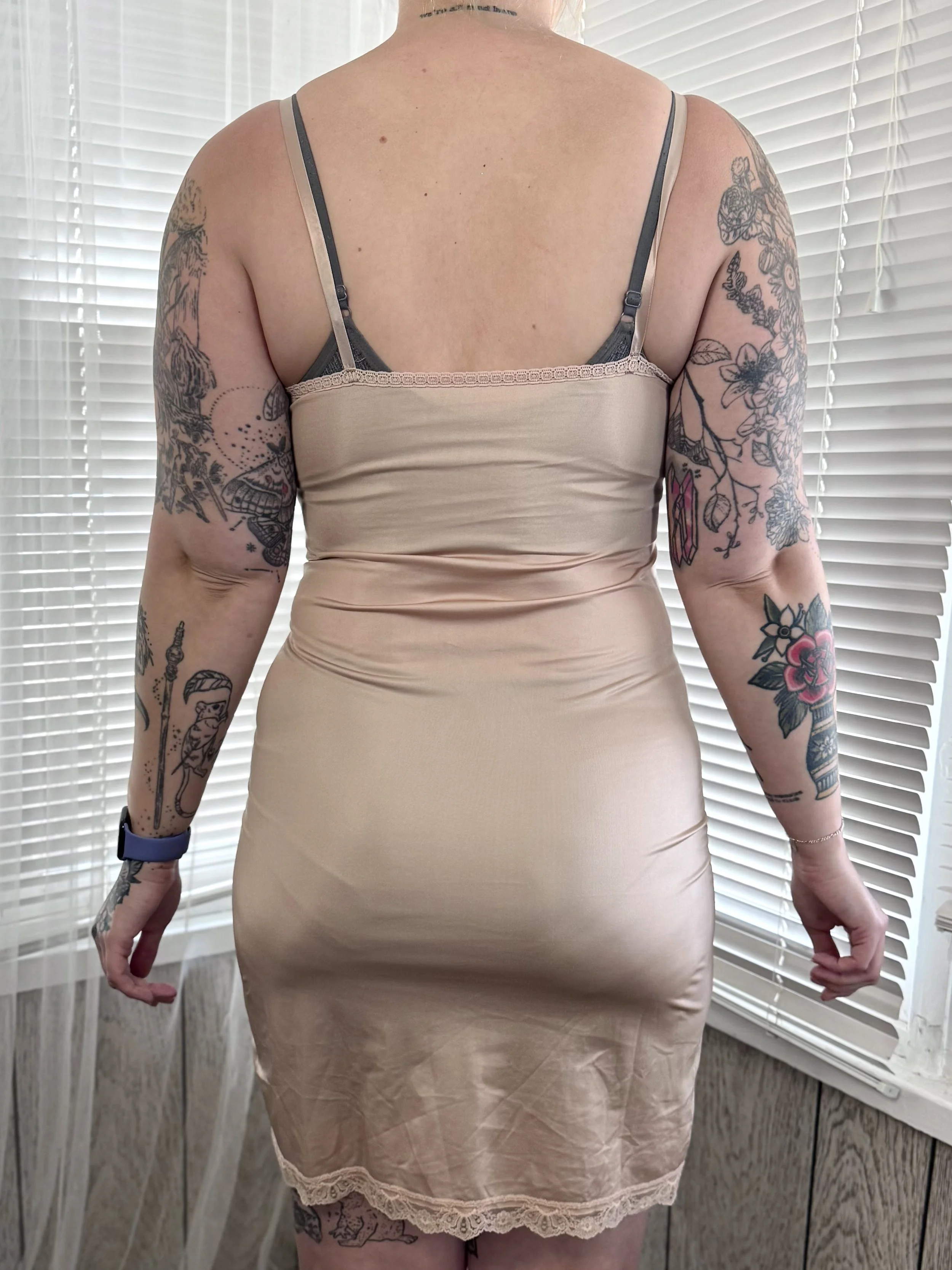 Vintage Capri Collection beige slip dress. Material is semi-sheer. Features lace trim on neckline and bottom hem. Straps are adjustable. Slips on overhead, no button or zipper closures.