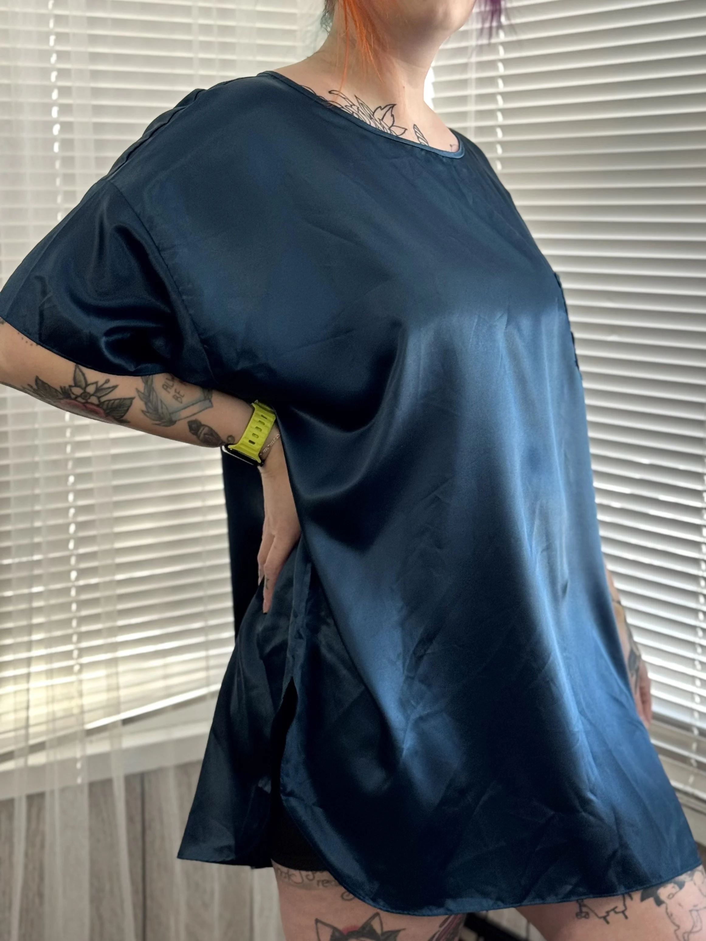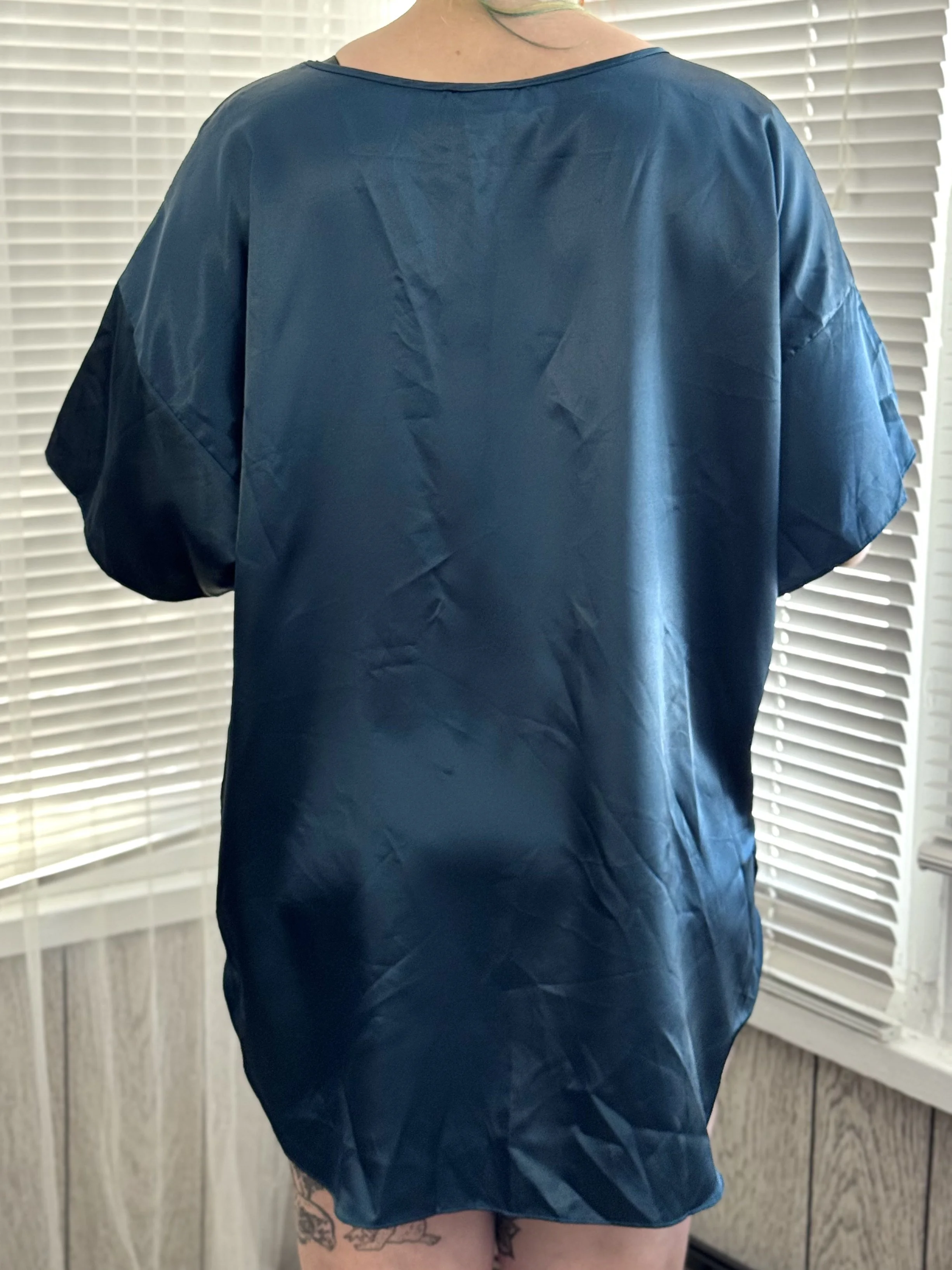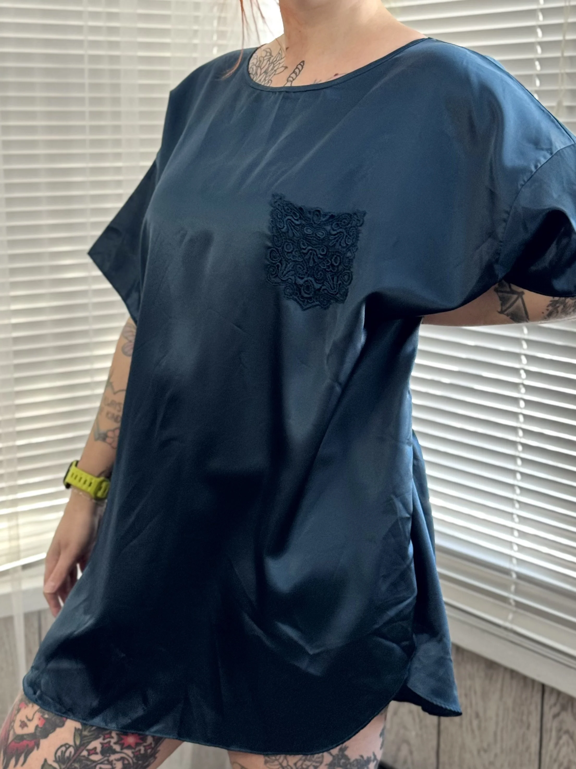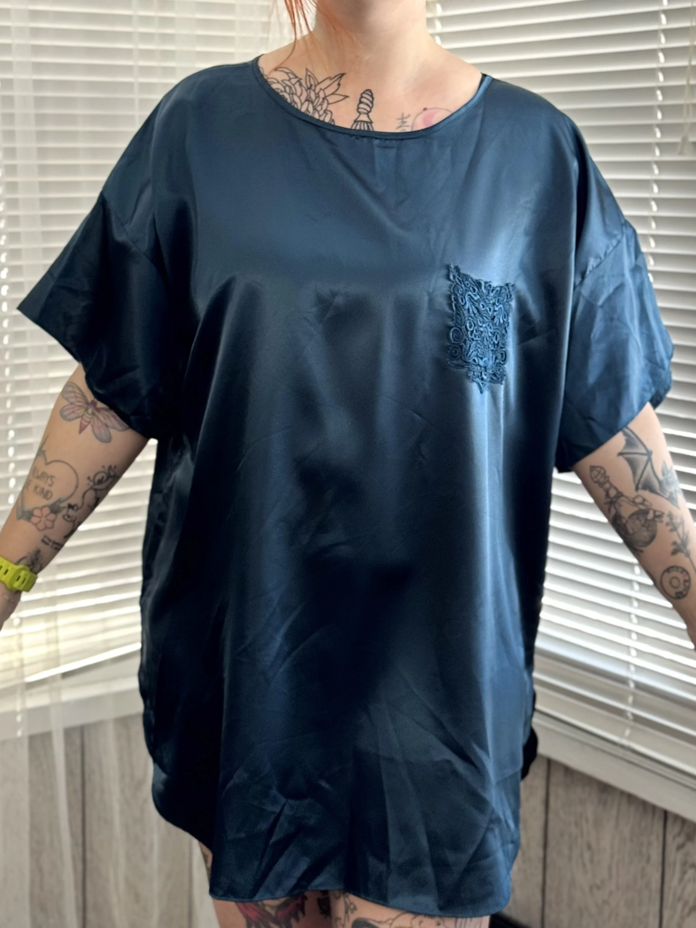 Vintage Sleep Solutions dark blue satin tee. Features small, functional, fully lace pocket on left chest. Slips on overhead, no zipper or button closures.