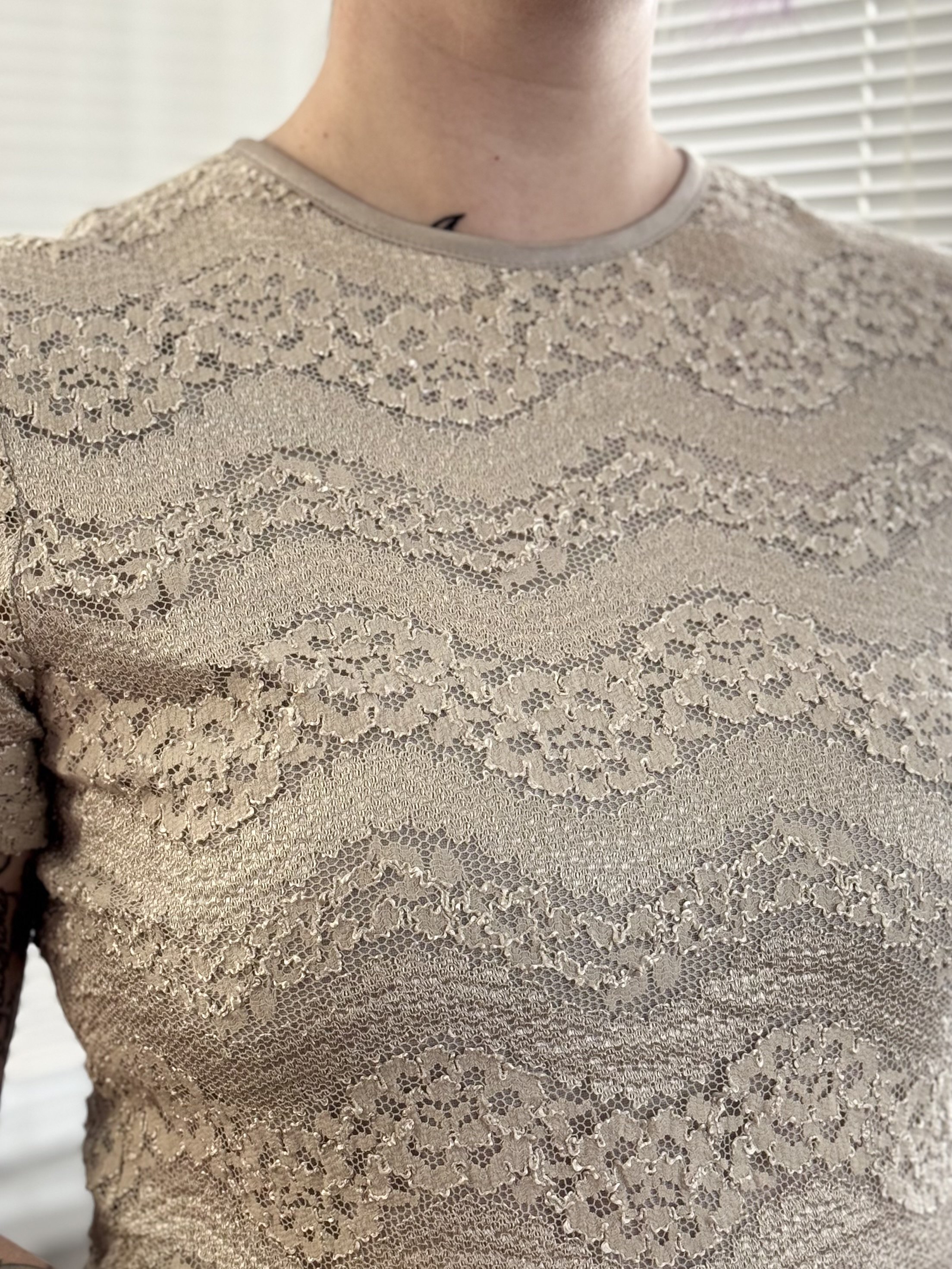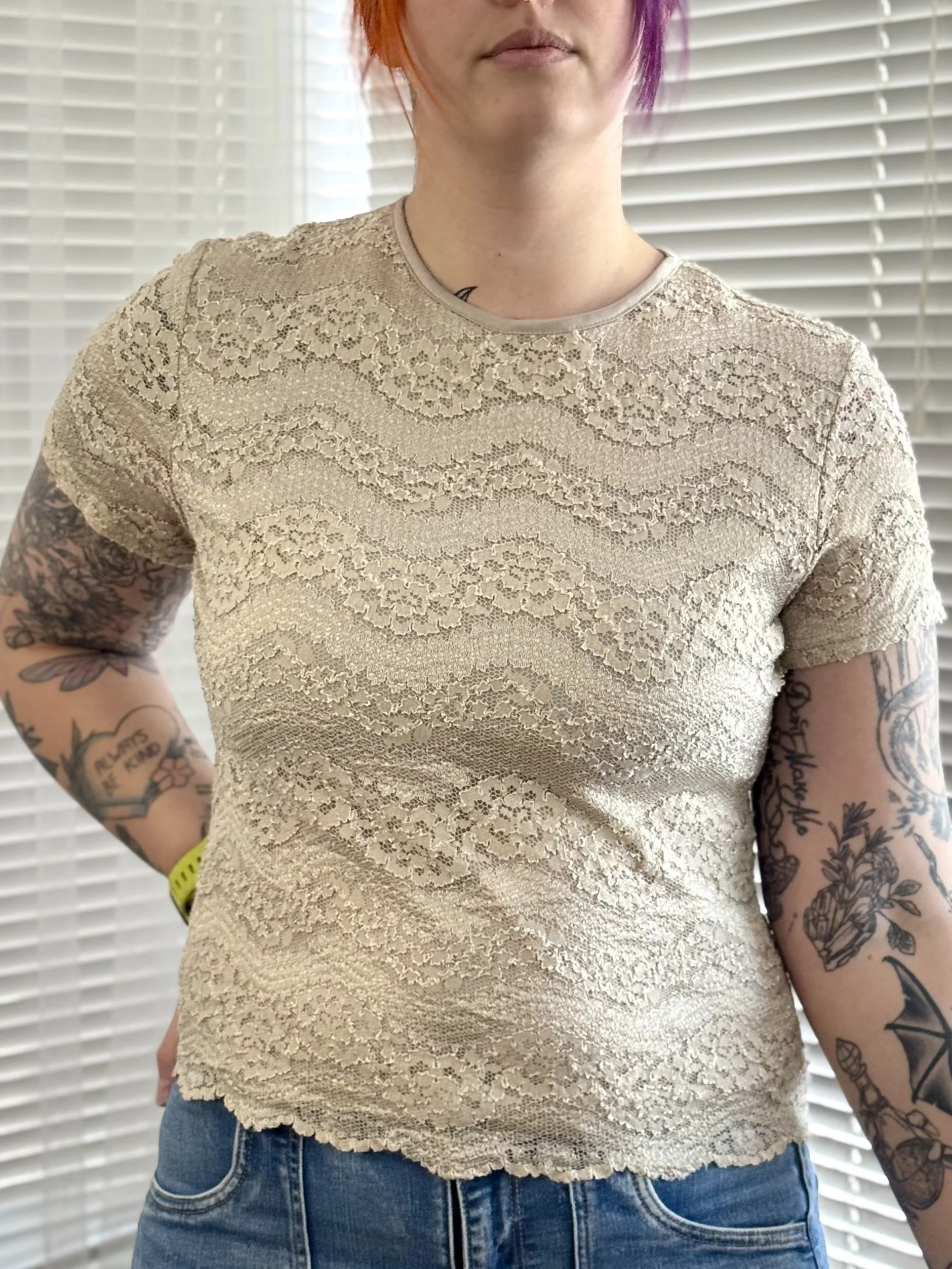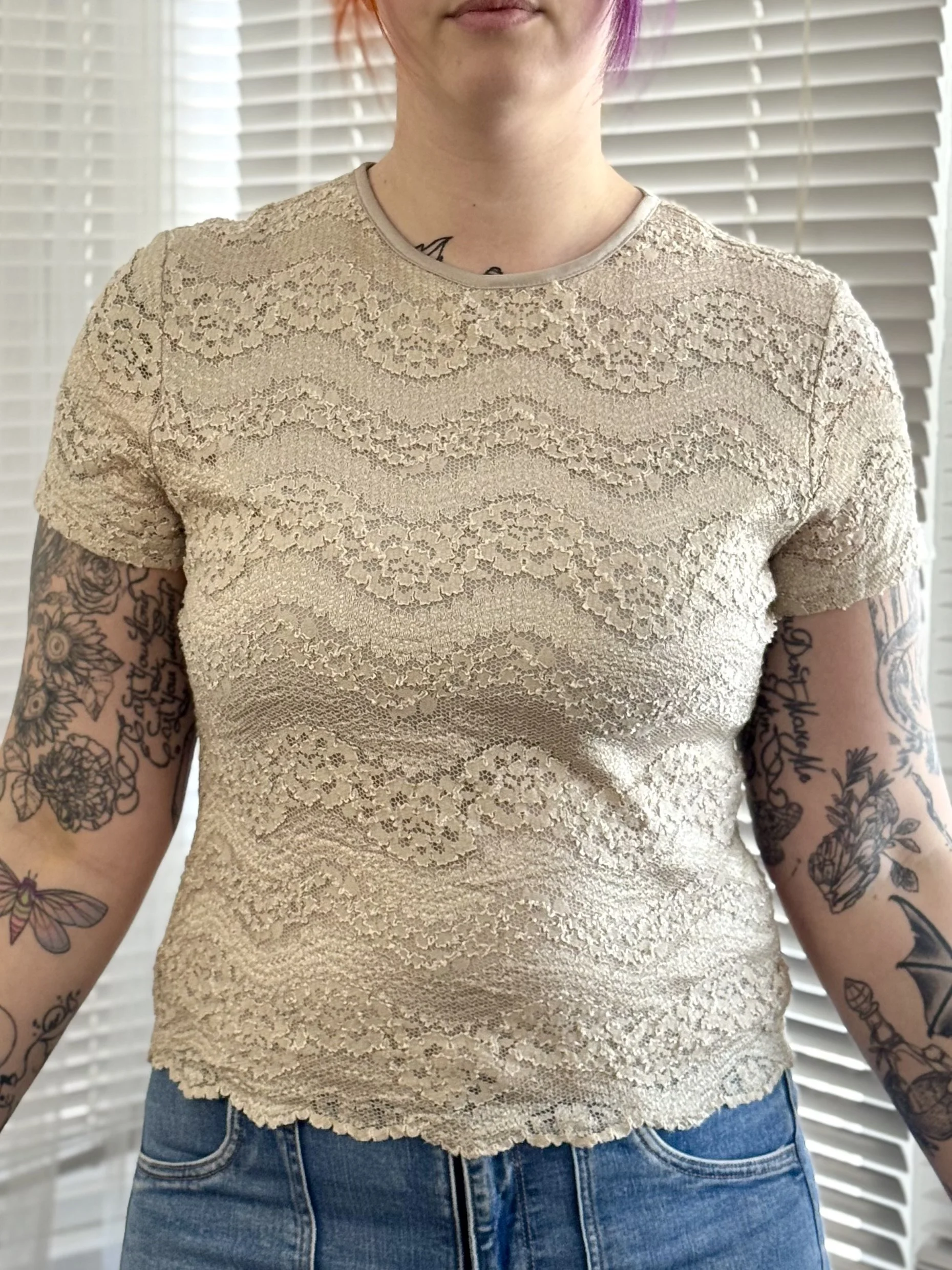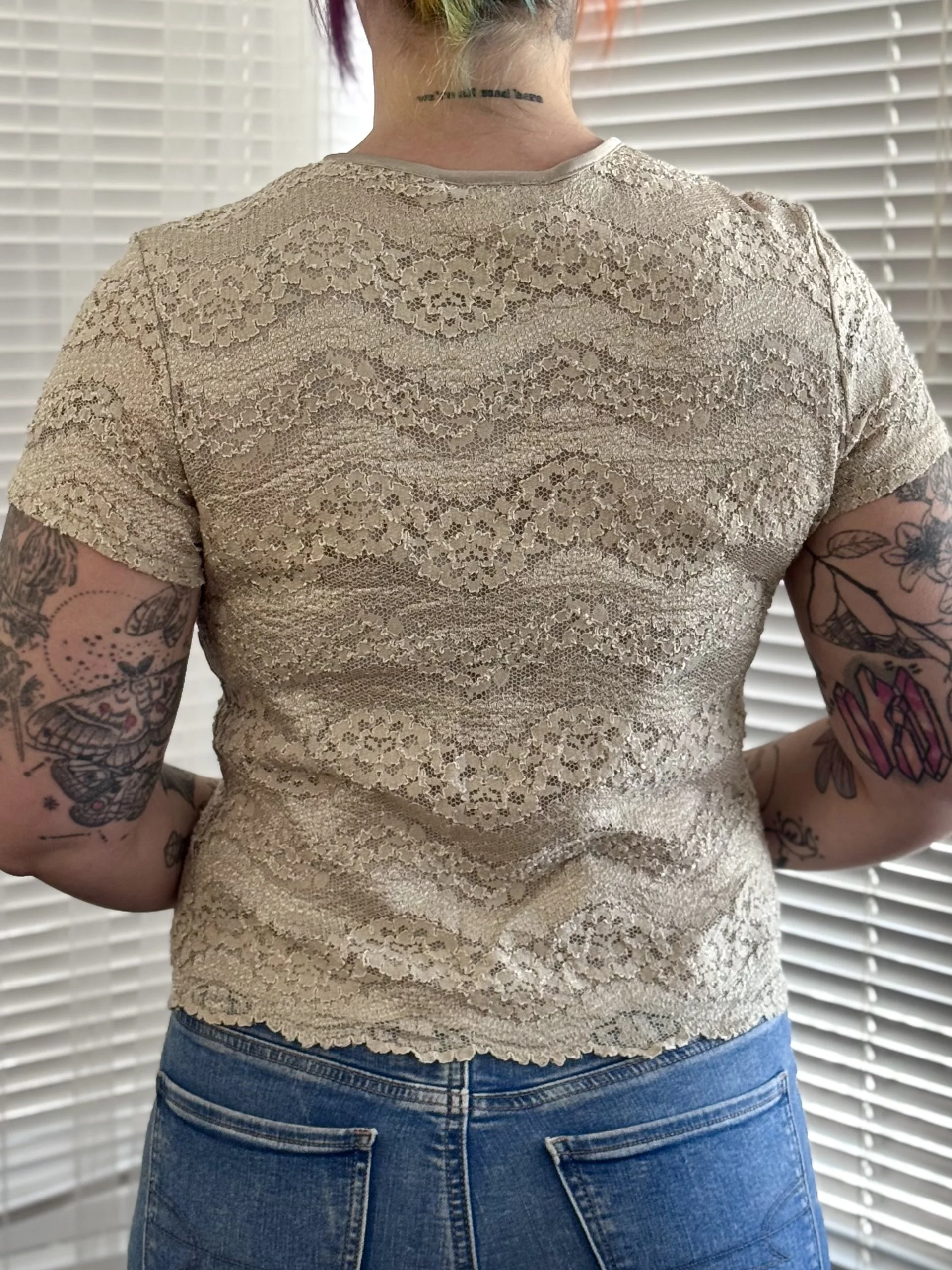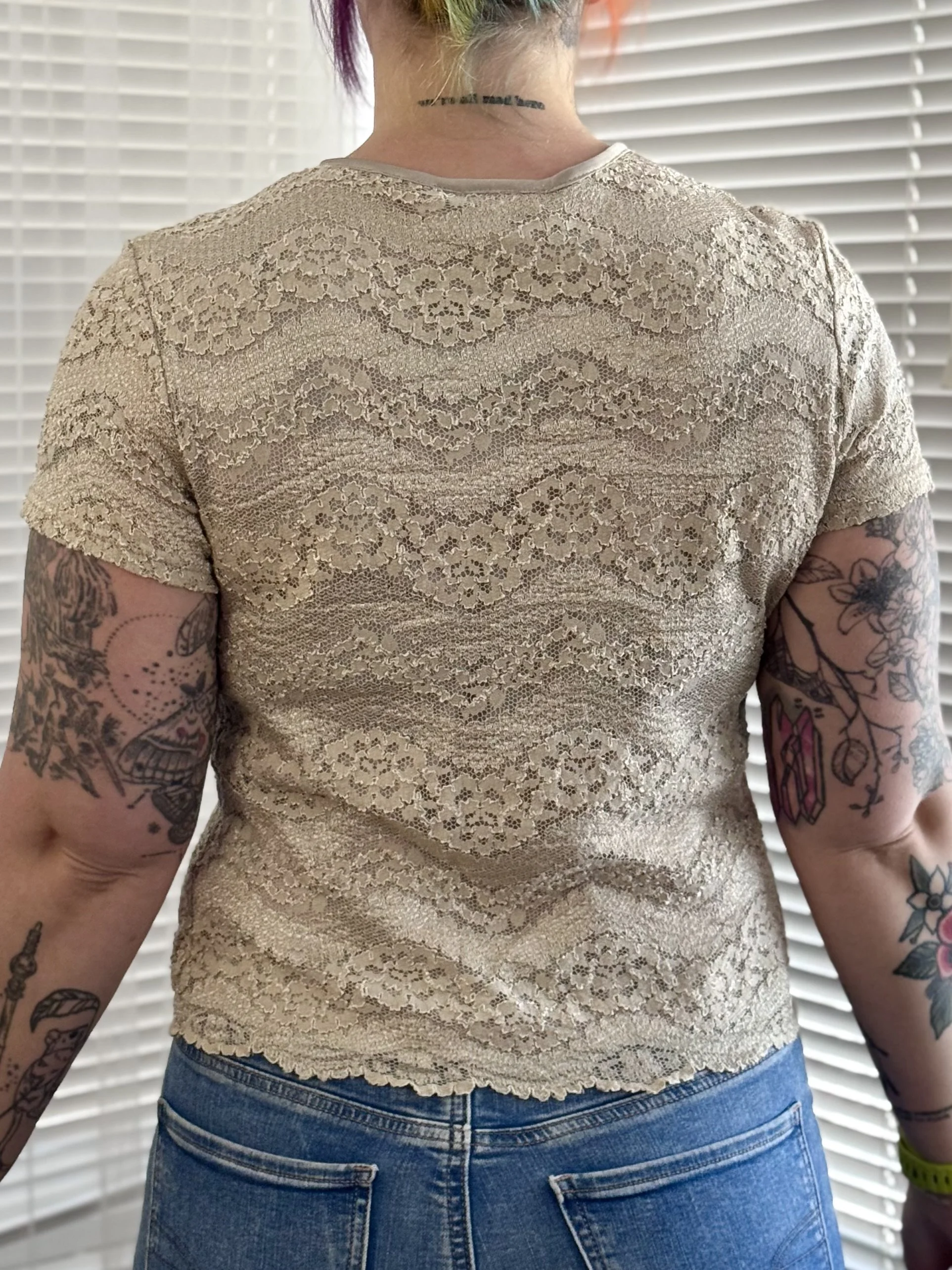 Vintage Gemilli tan lace tee. Striped lace over with sheer short sleeves. Slips on overhead, no zipper or button closures.