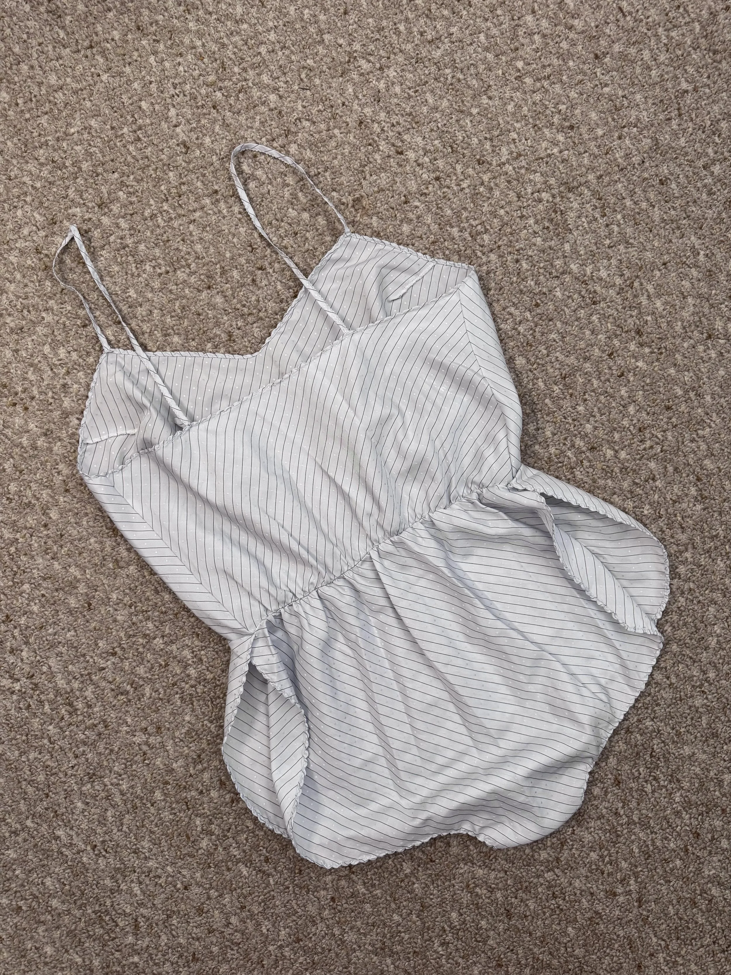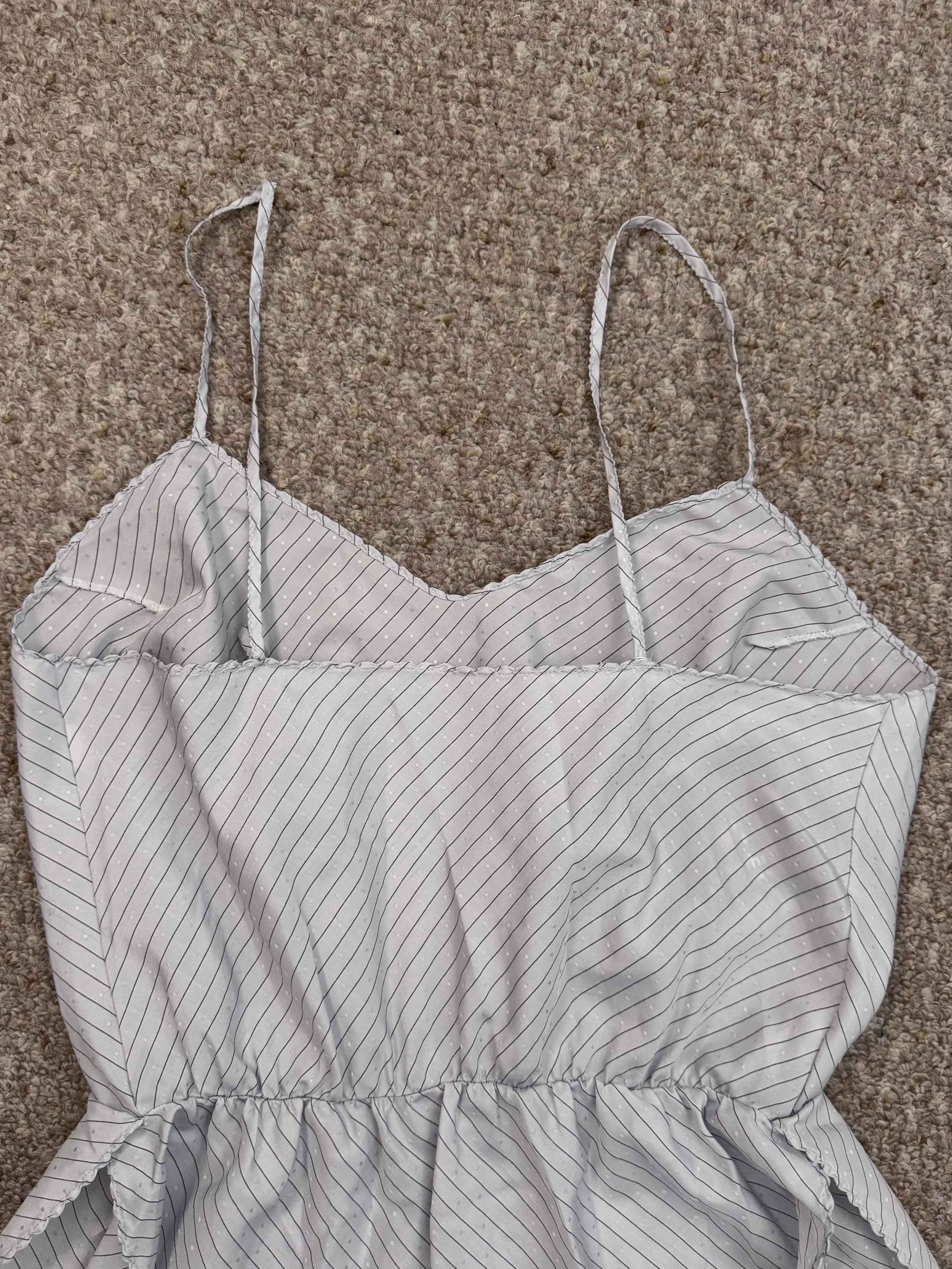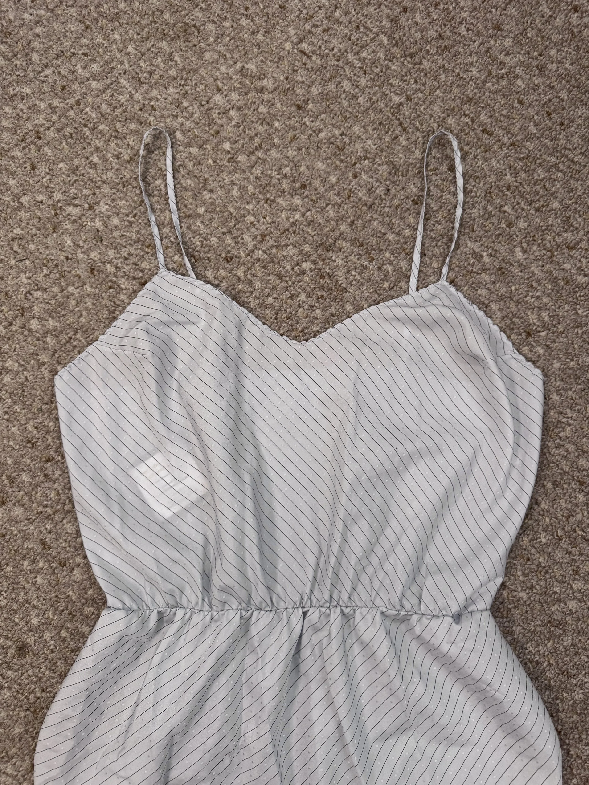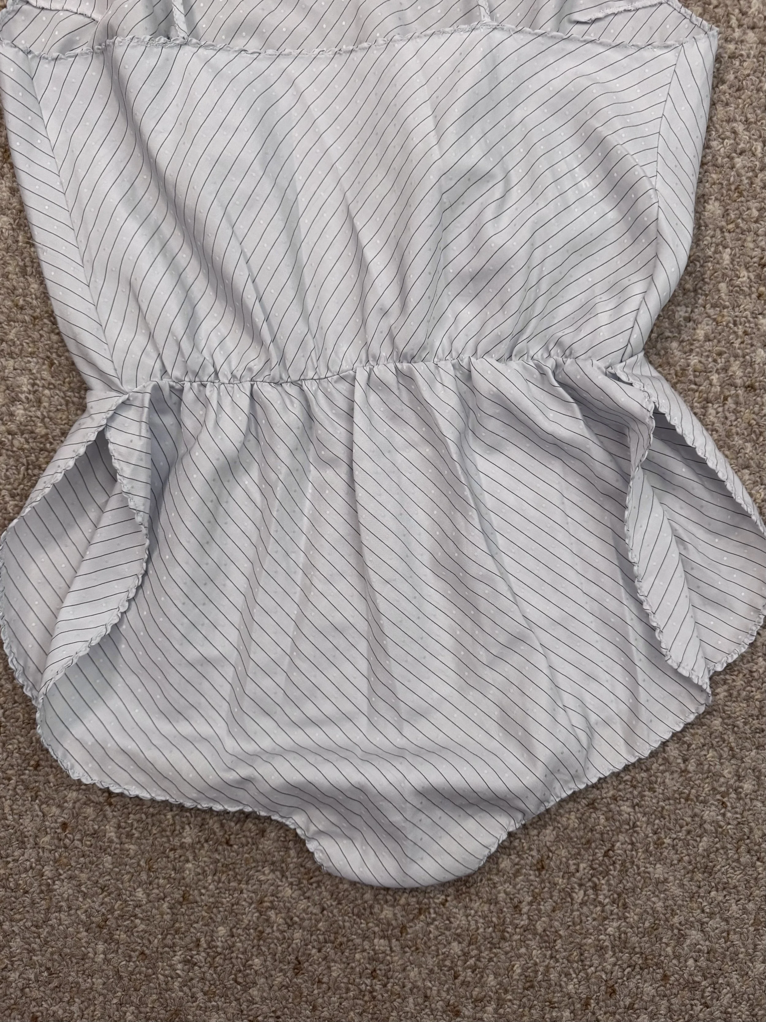 Vintage Kayser light blue bodysuit. Features small dot texture and thin striped pattern. Material is semi-sheer. Snap closure in crotch, no additional zipper or button closures, and light band elastic at waist. Straps are not adjustable. Slits on upper thigh area.