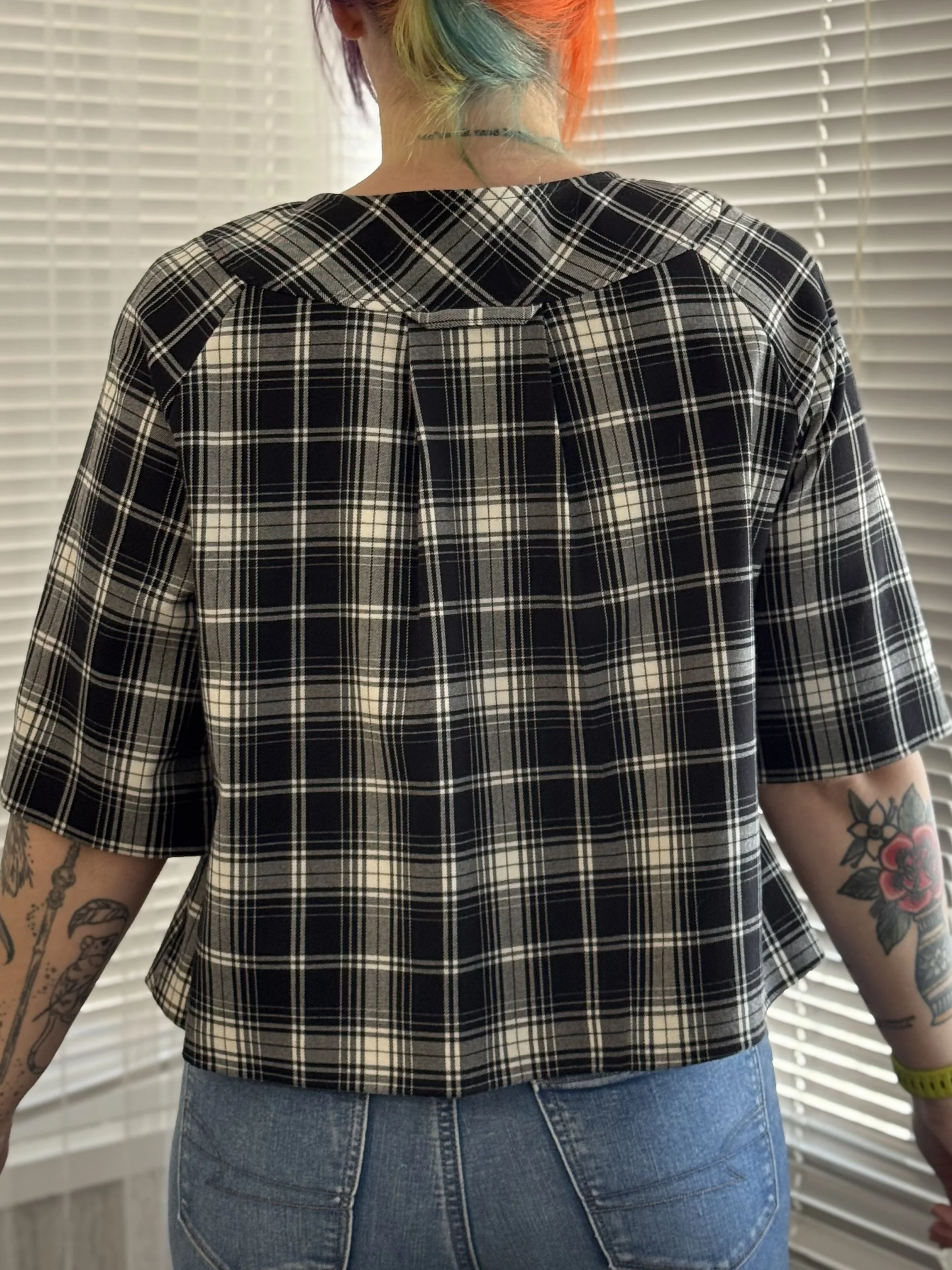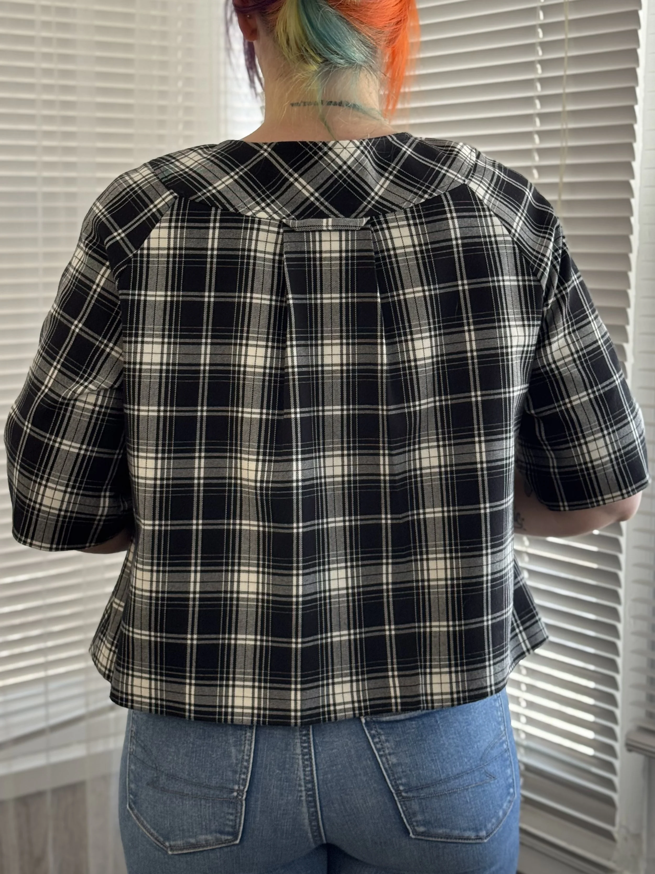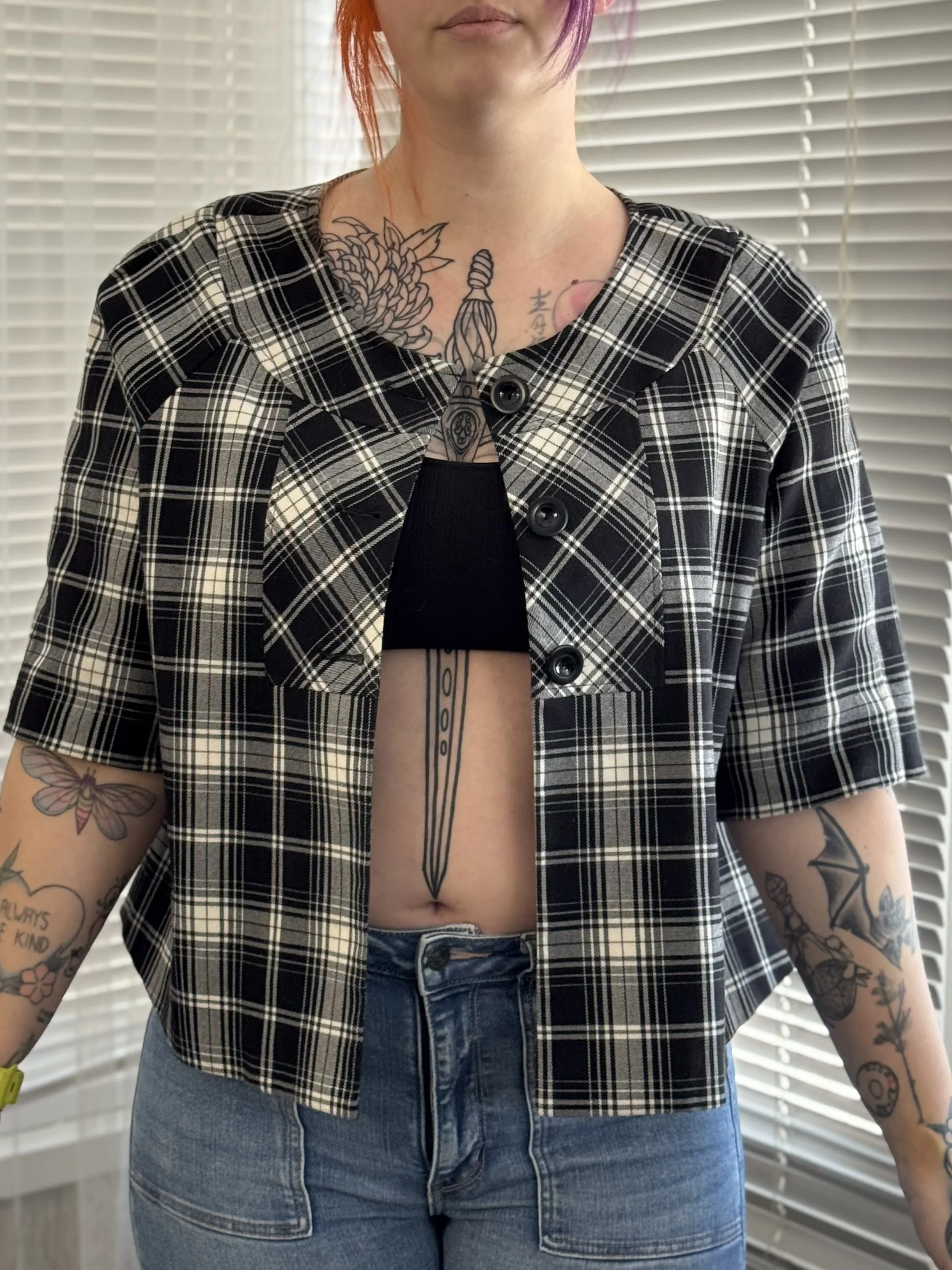 Thrifted Larry Levine short-sleeve, black and white plaid button-up cardigan. Features 3 button halfway closure in front (buttons do not go all the way down for full frontal closure). Comes with light internal shoulder pads.