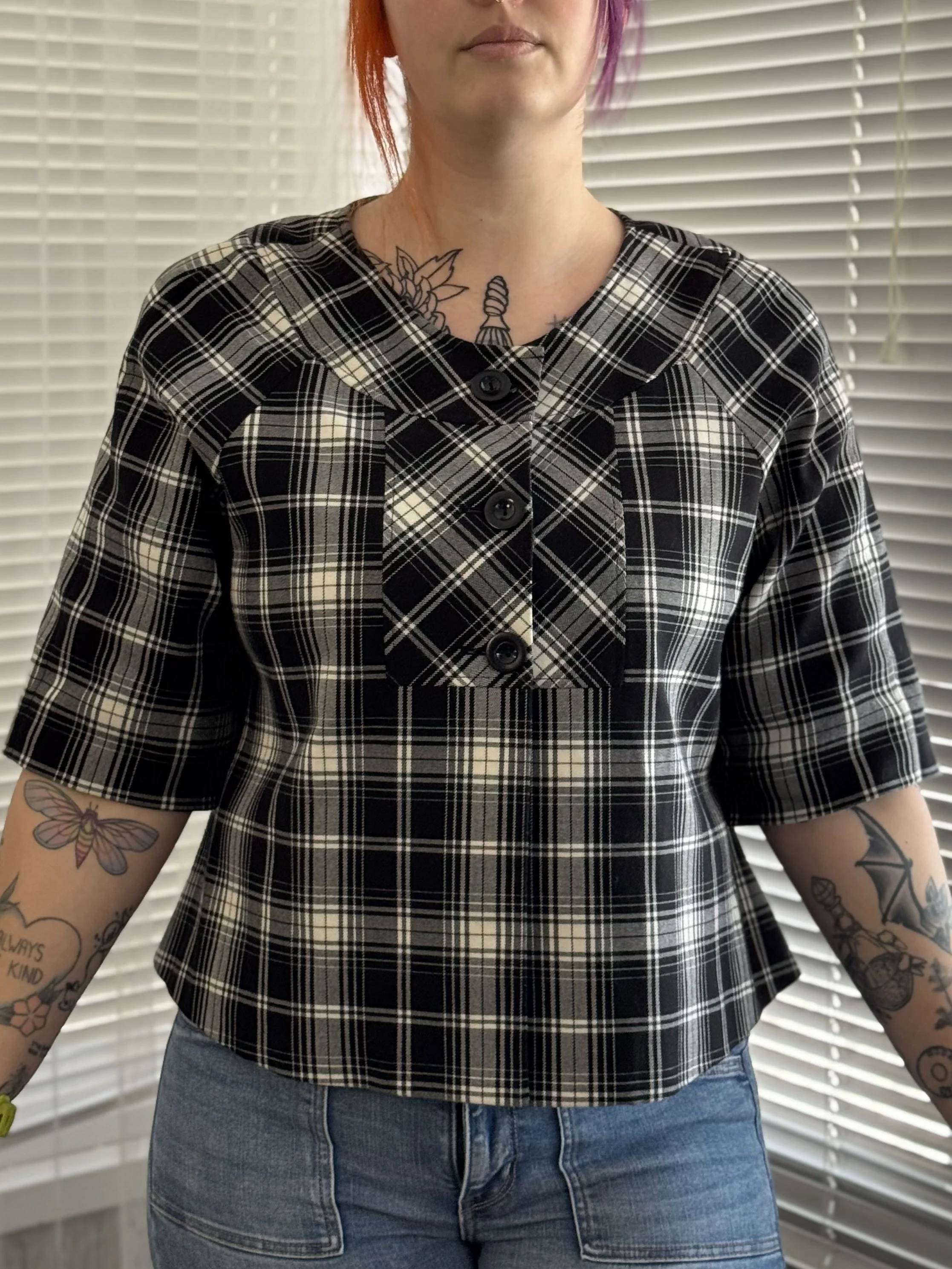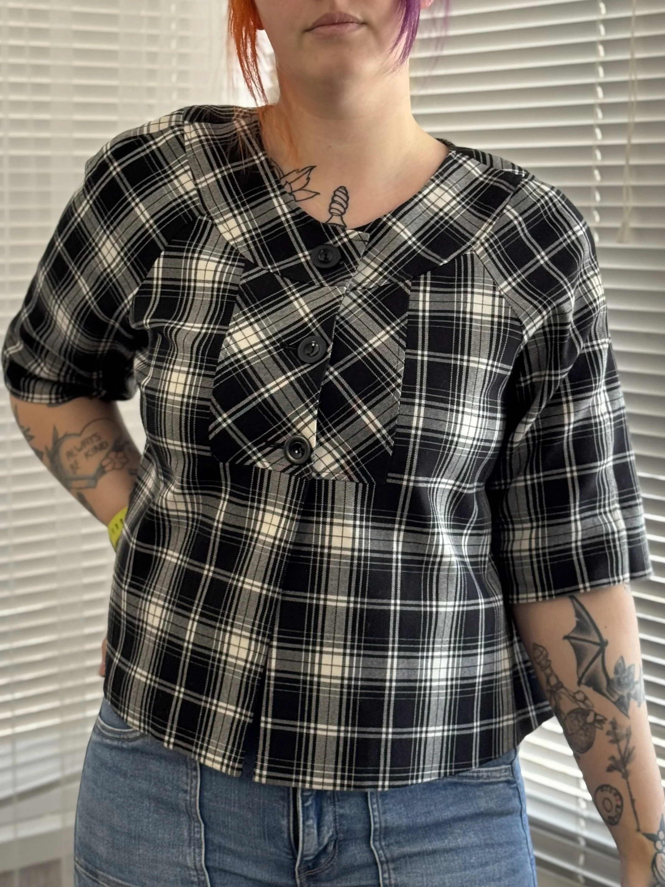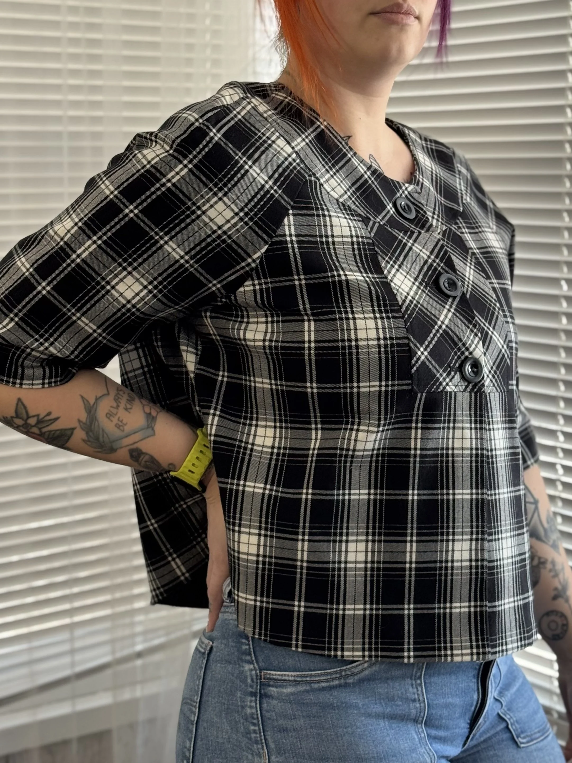 Thrifted Larry Levine short-sleeve, black and white plaid button-up cardigan. Features 3 button halfway closure in front (buttons do not go all the way down for full frontal closure). Comes with light internal shoulder pads.