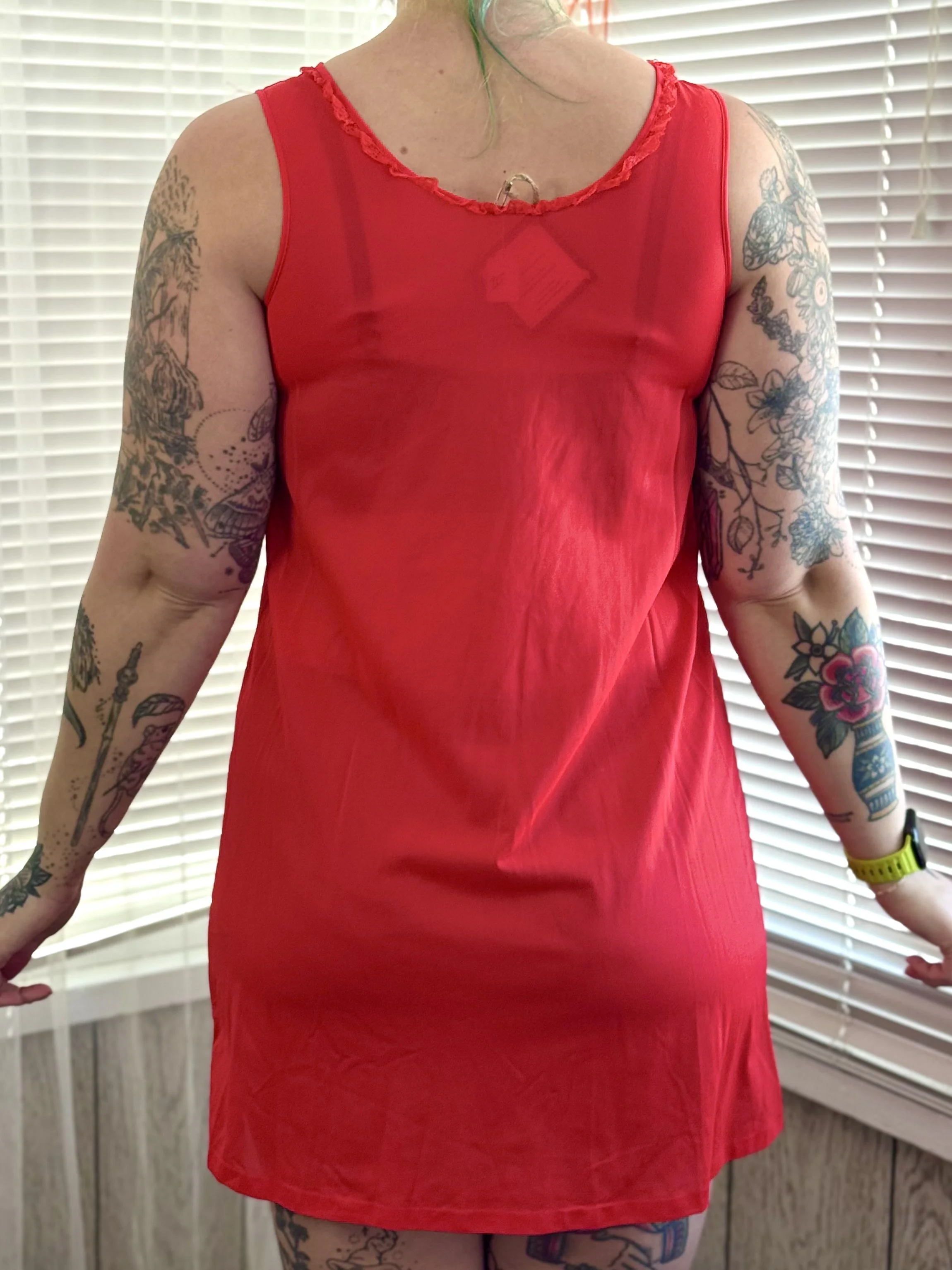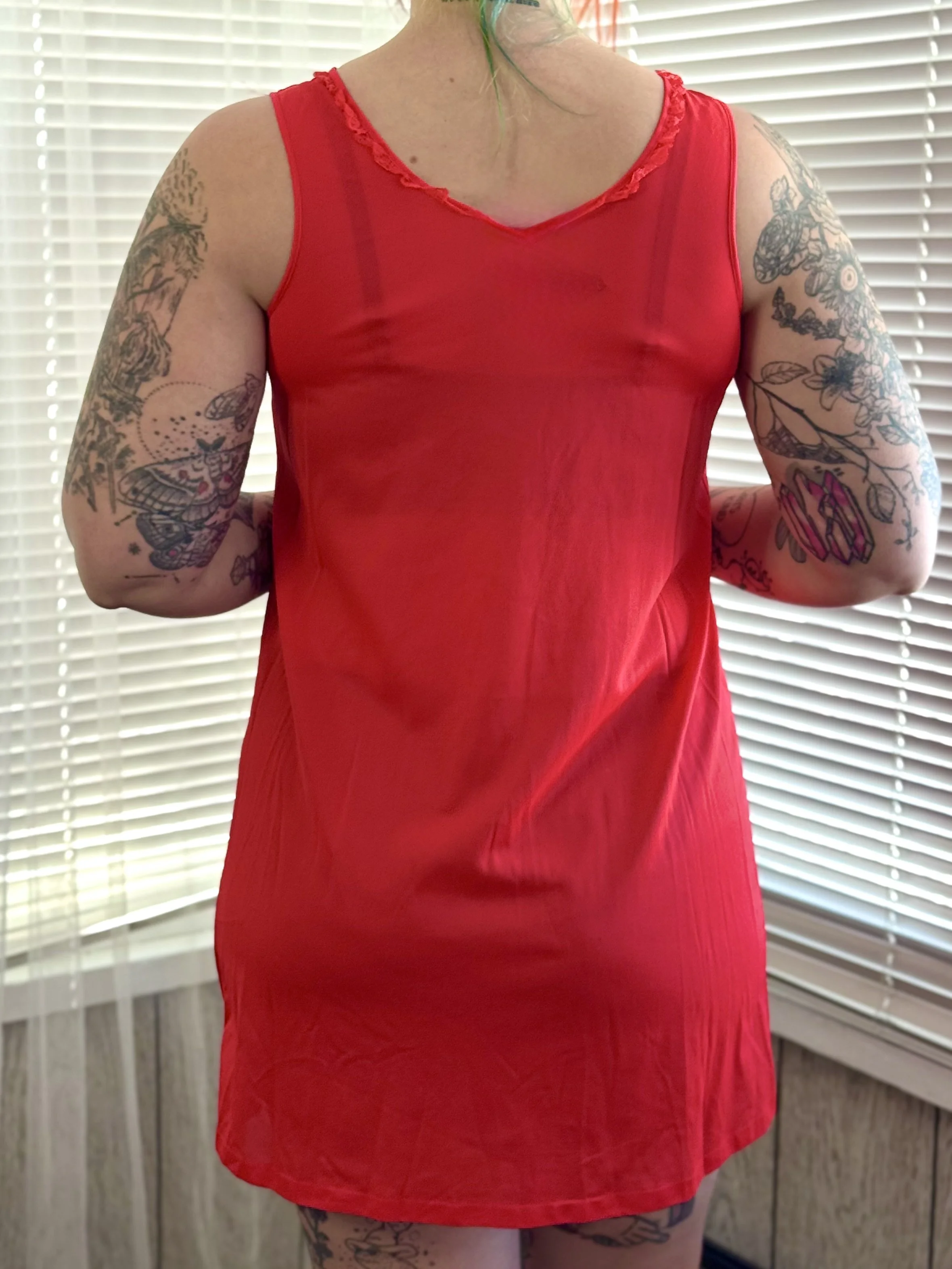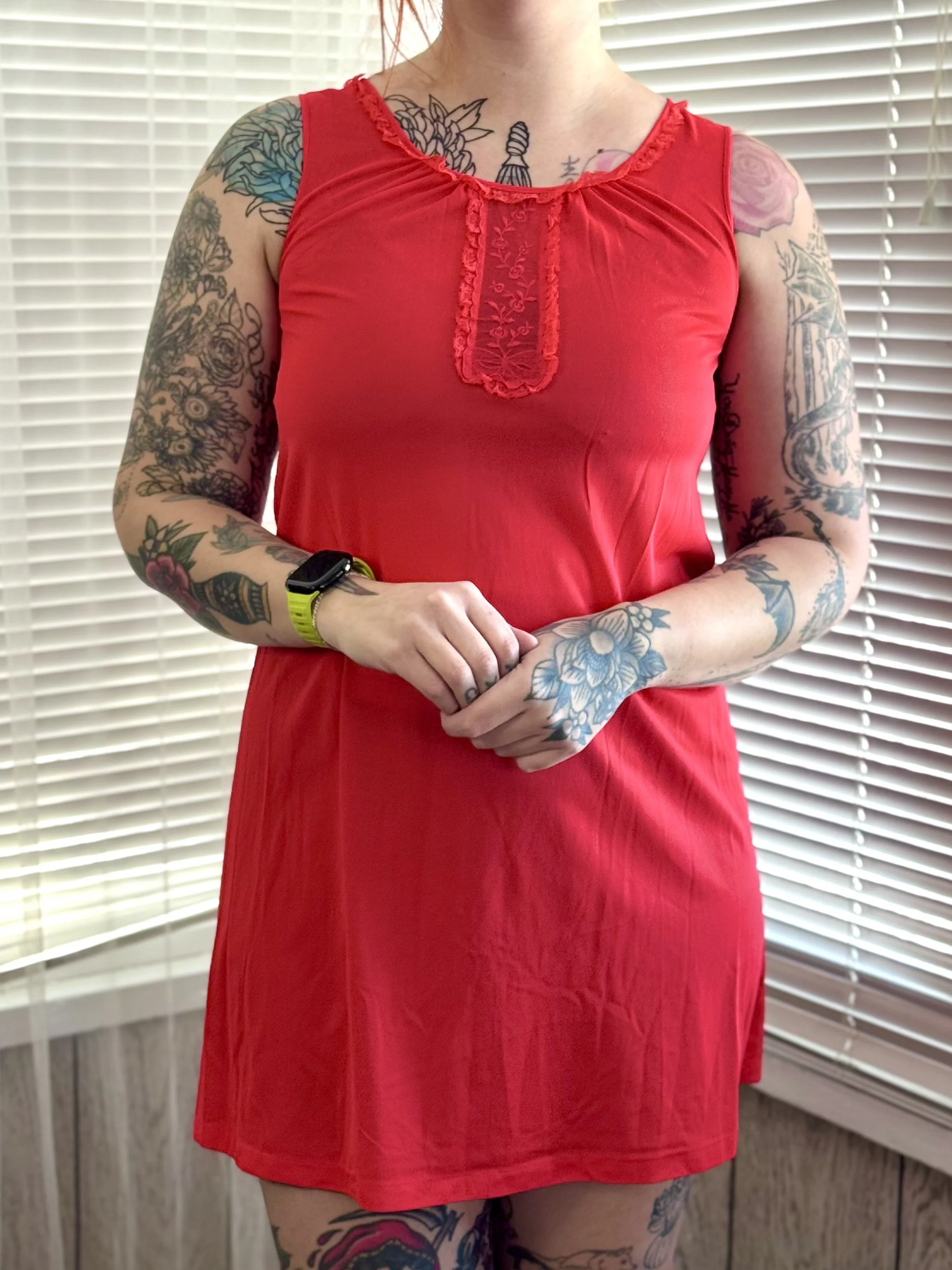 Vintage Lorraine bright red slip dress. Material is semi-sheer. Features lace detail at neck and sheer panel with floral embroidery in center chest. Slips on, no zipper or button closures.