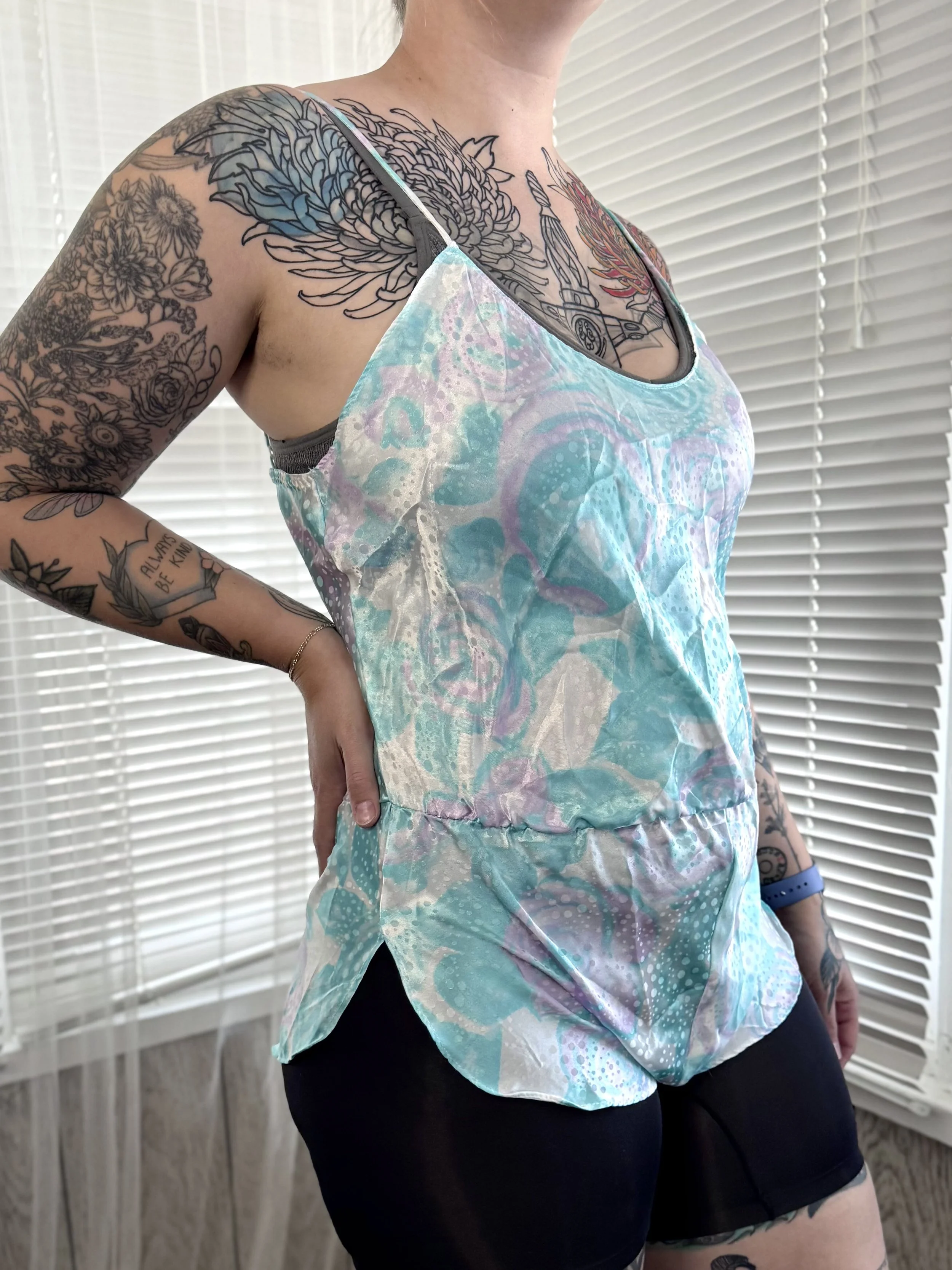 Measurements laying flat: 21“ chest, 18-22“ elastic waist, 23“ hips, 37“ length