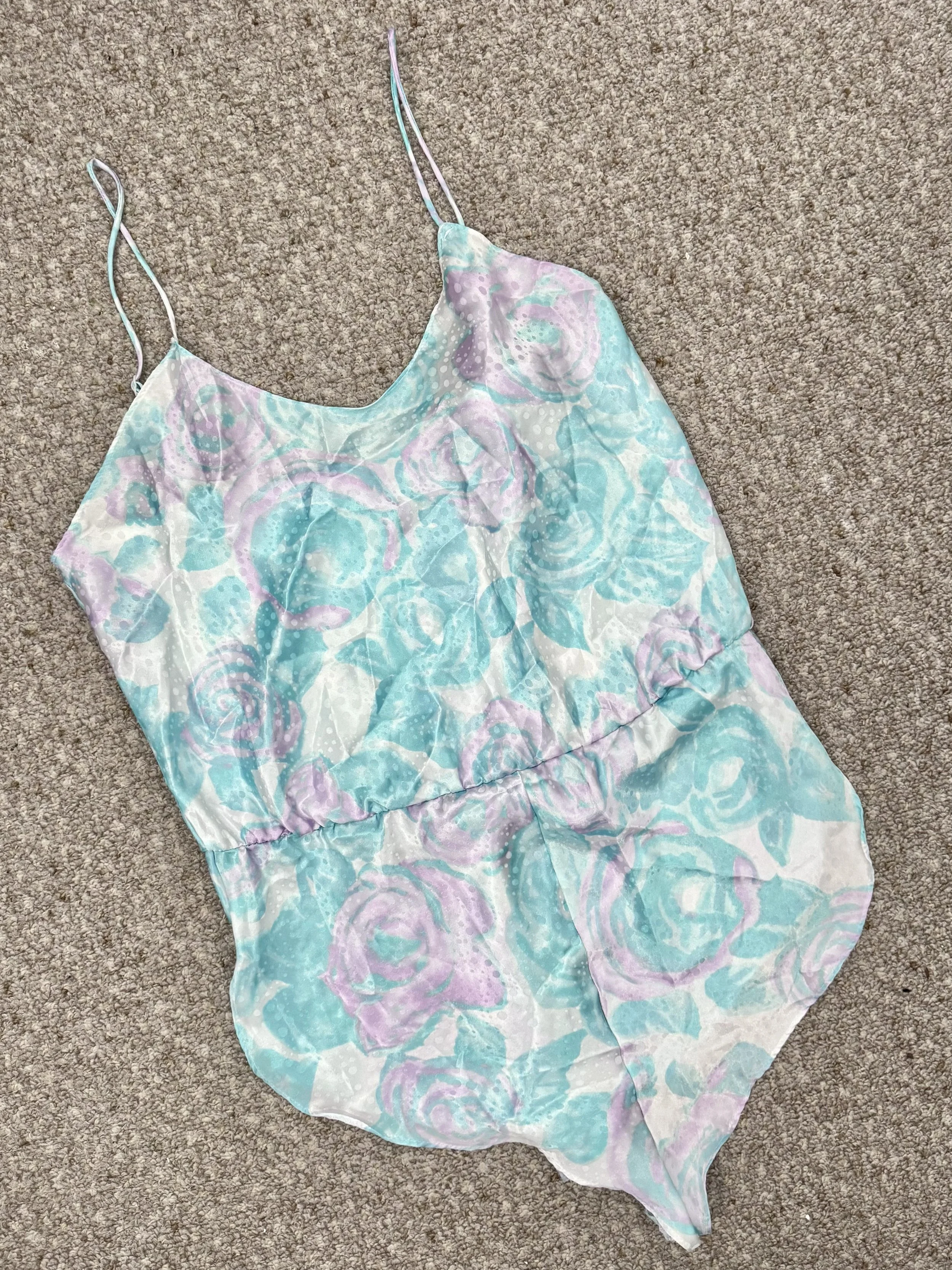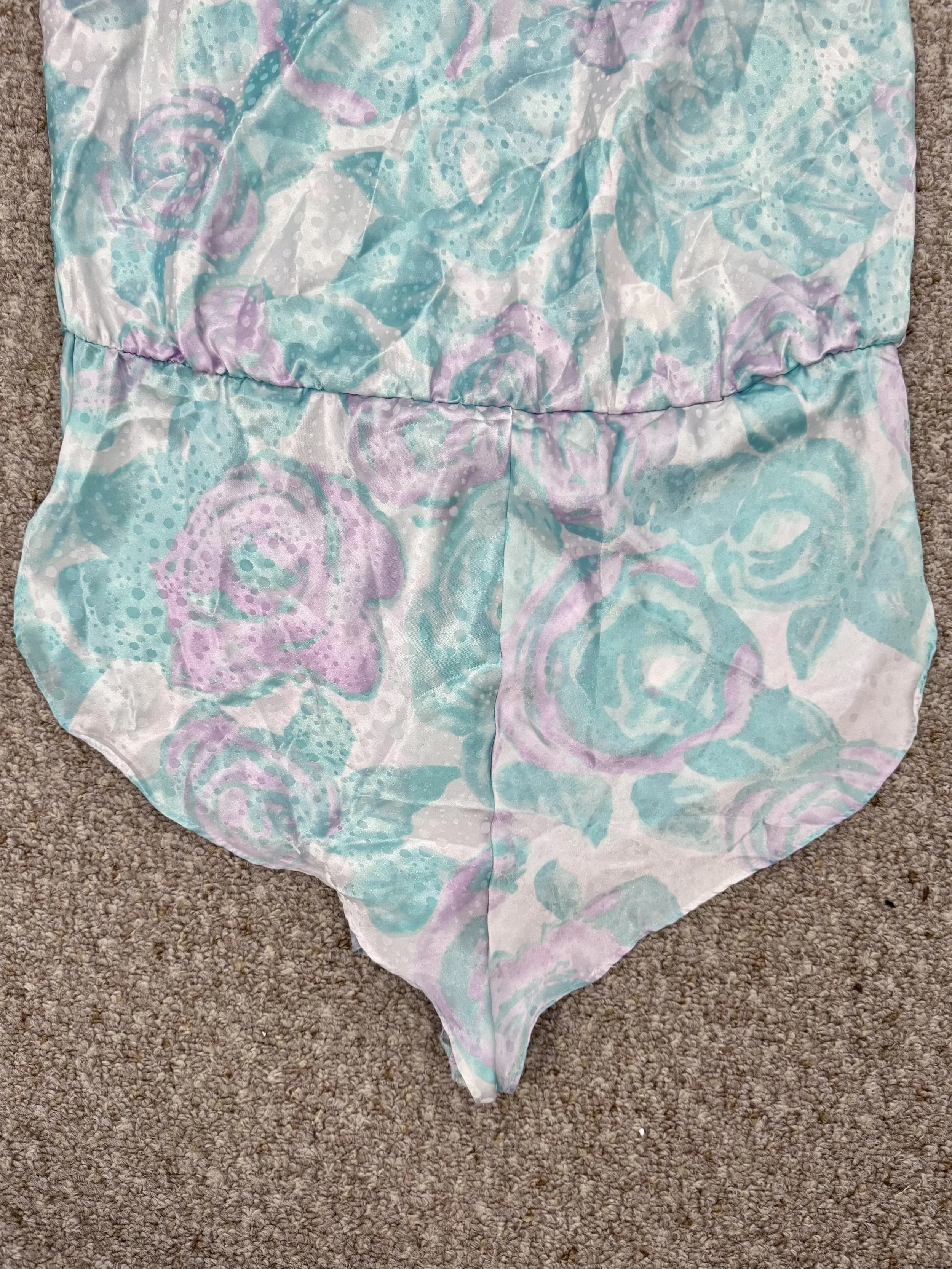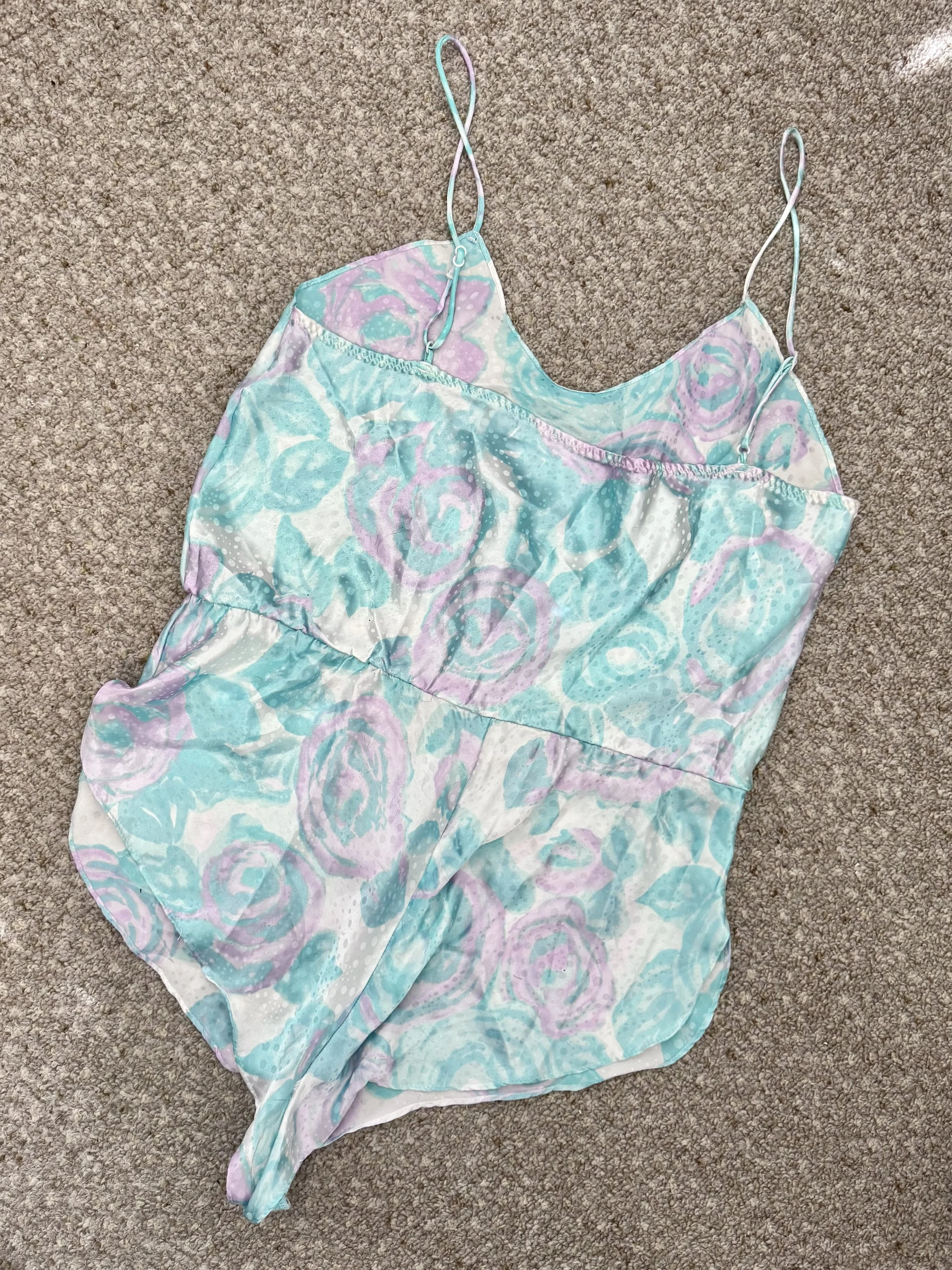 Vintage pastel floral print bodysuit. Material is opaque. Features pastel pink and teal floral print with polka-dot print overlay. Straps are adjustable. Slips on, no zipper or button closures.