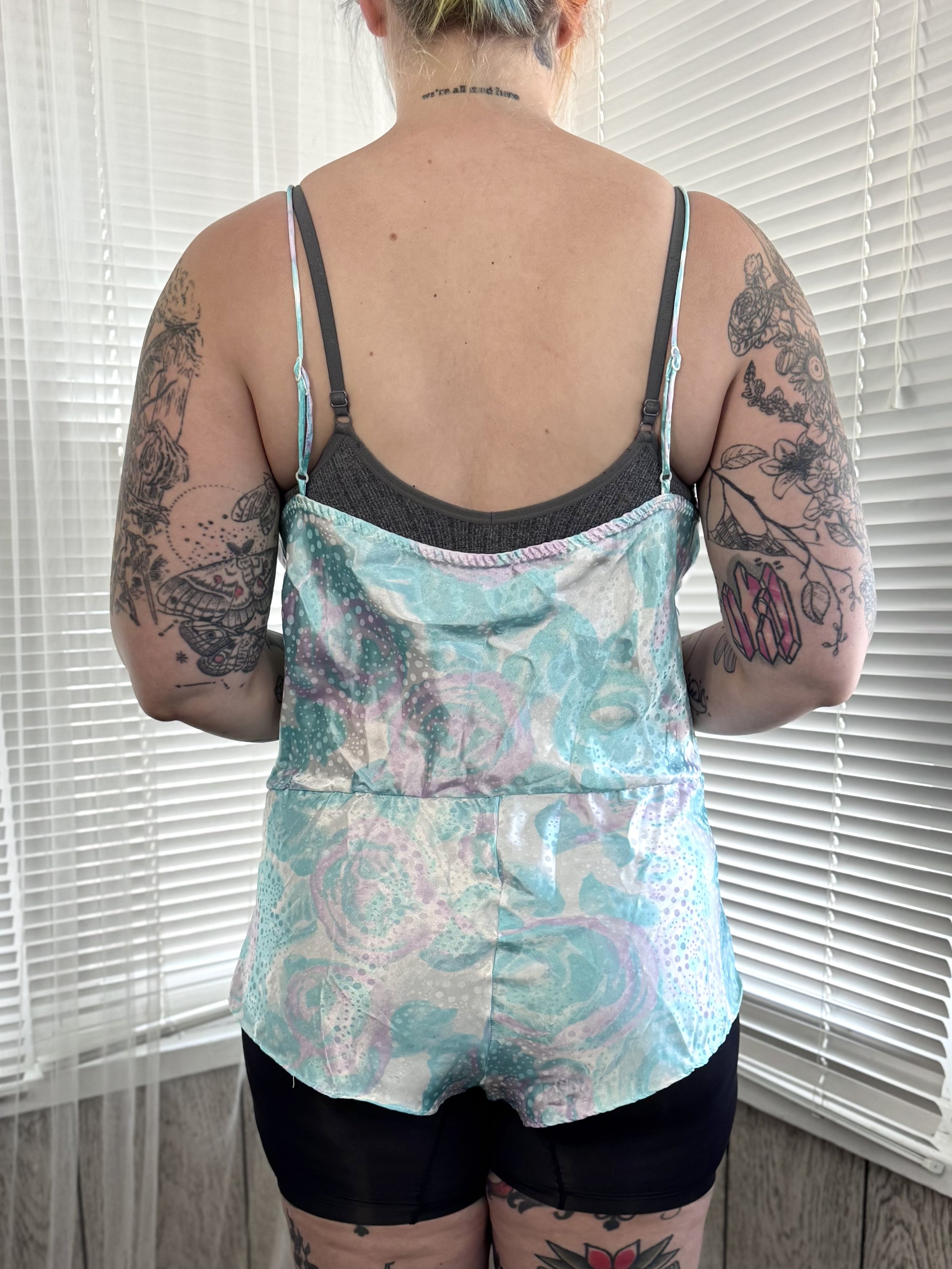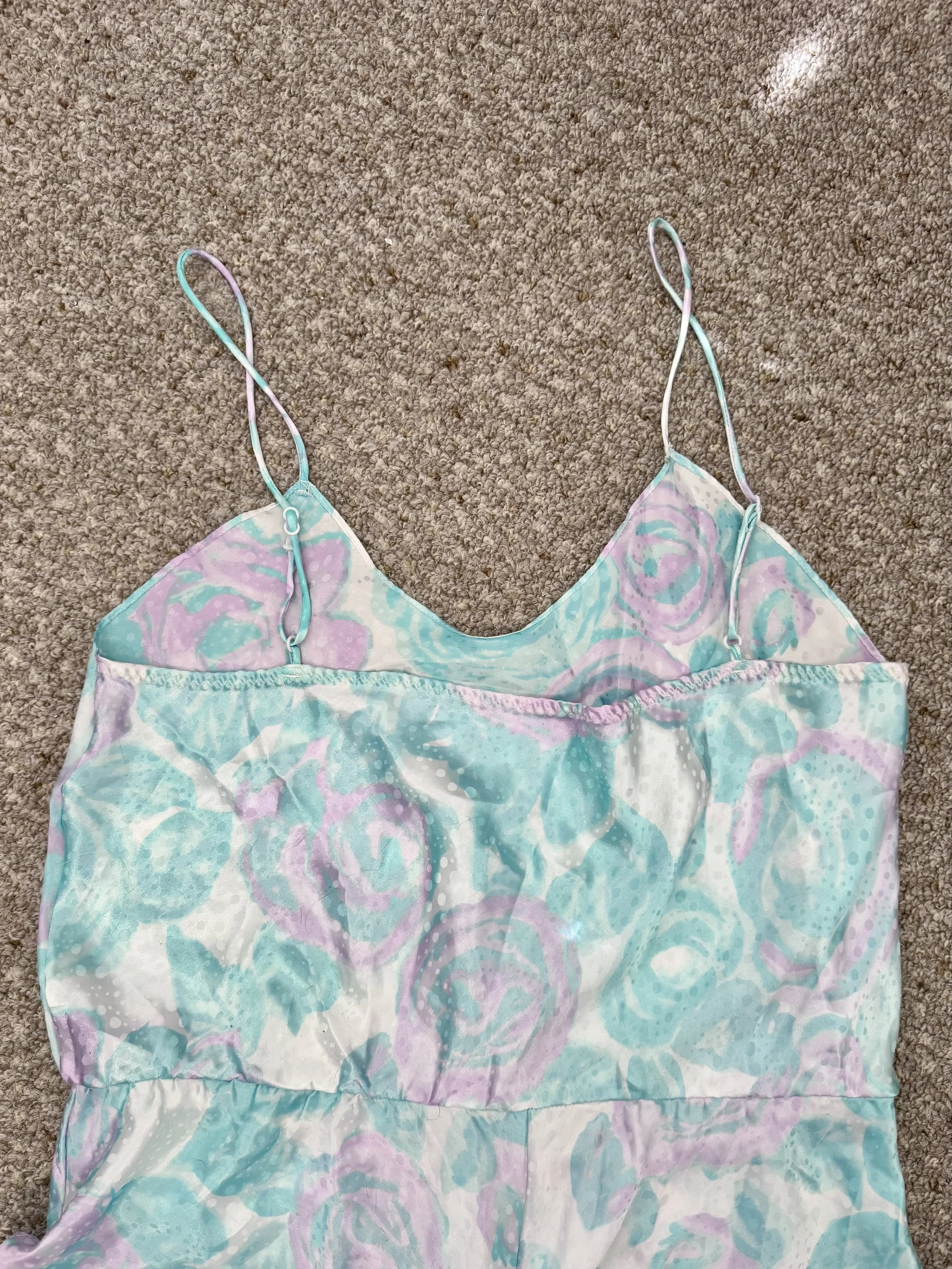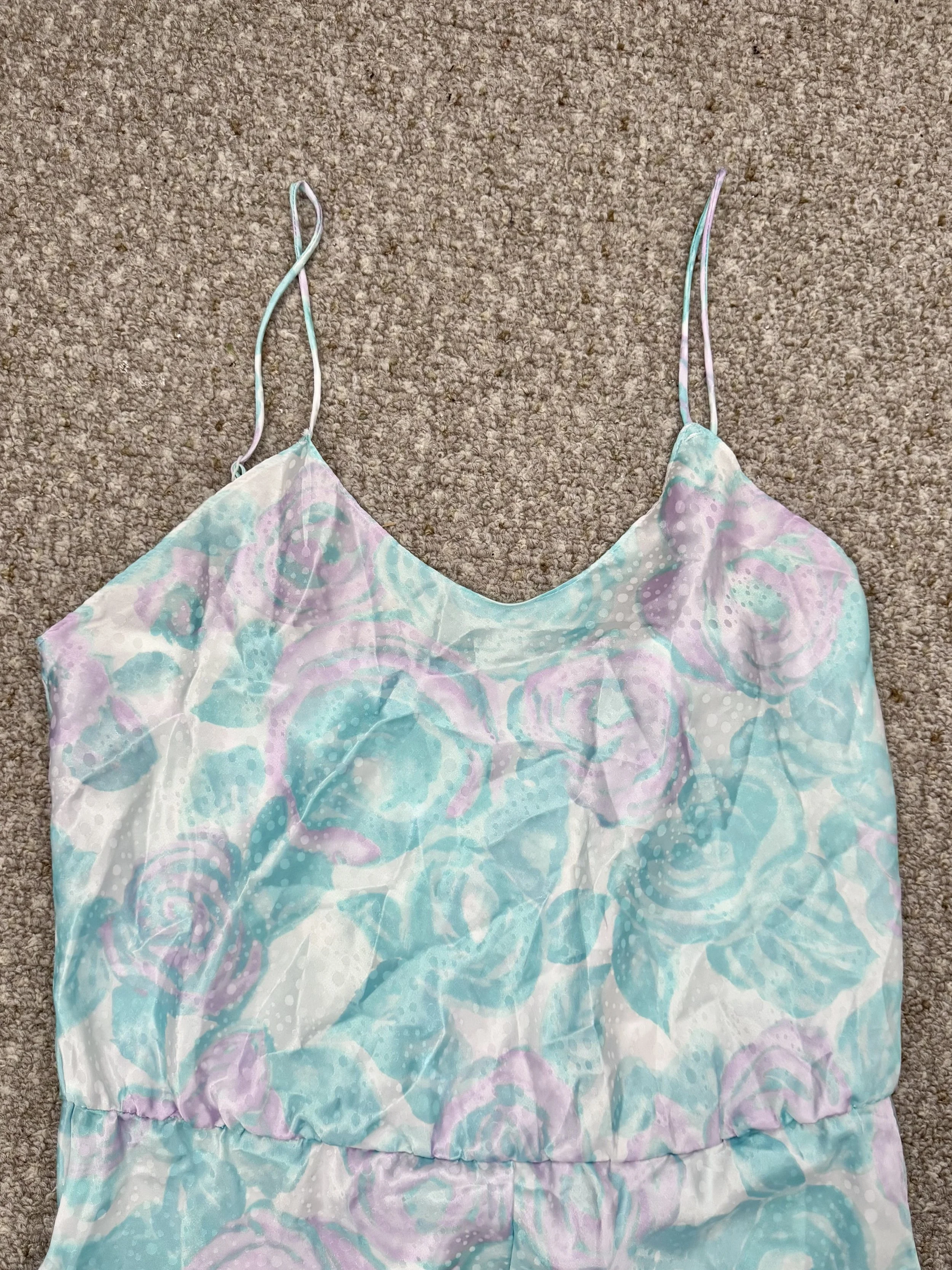 Vintage pastel floral print bodysuit. Material is opaque. Features pastel pink and teal floral print with polka-dot print overlay. Straps are adjustable. Slips on, no zipper or button closures.