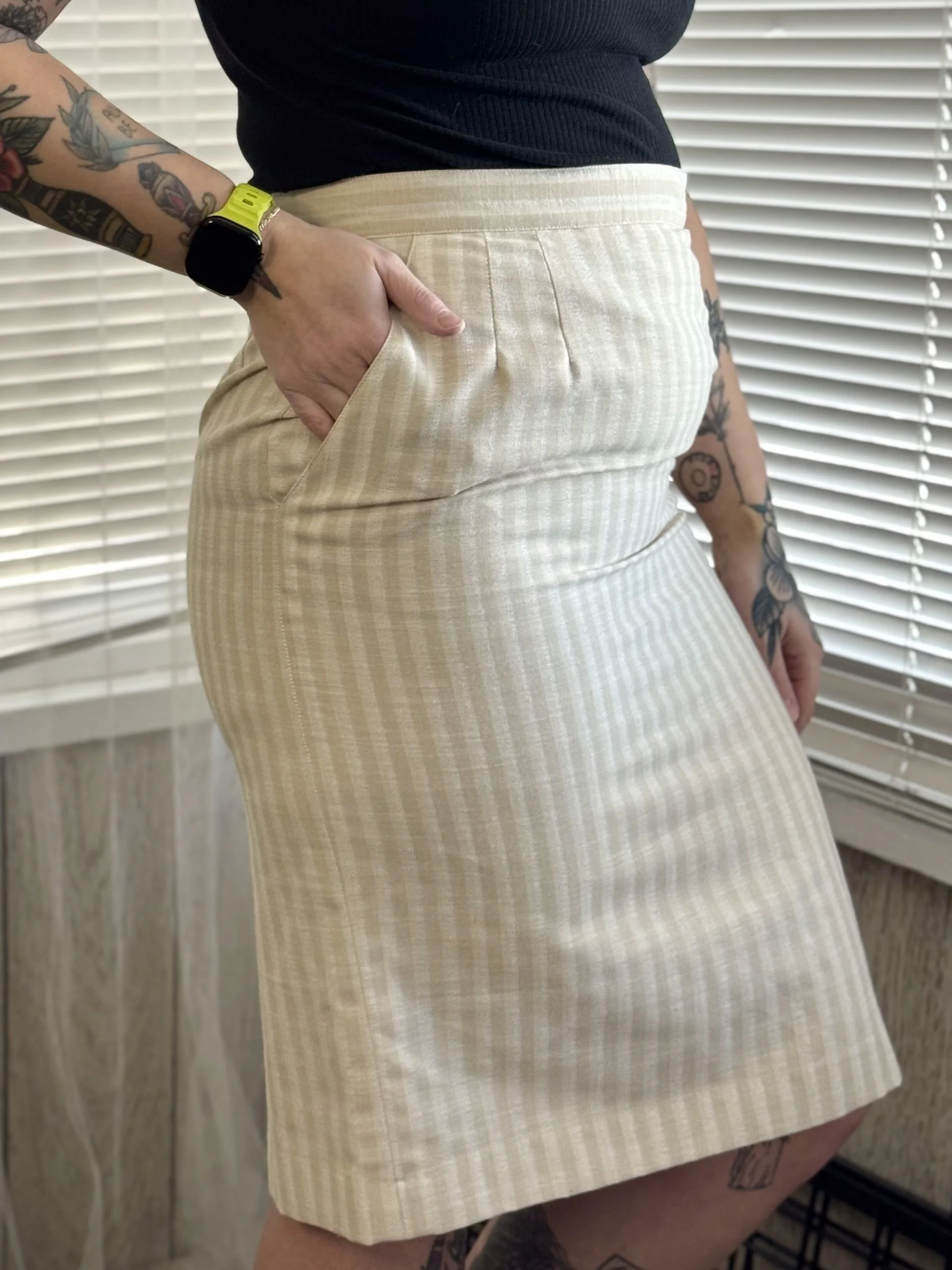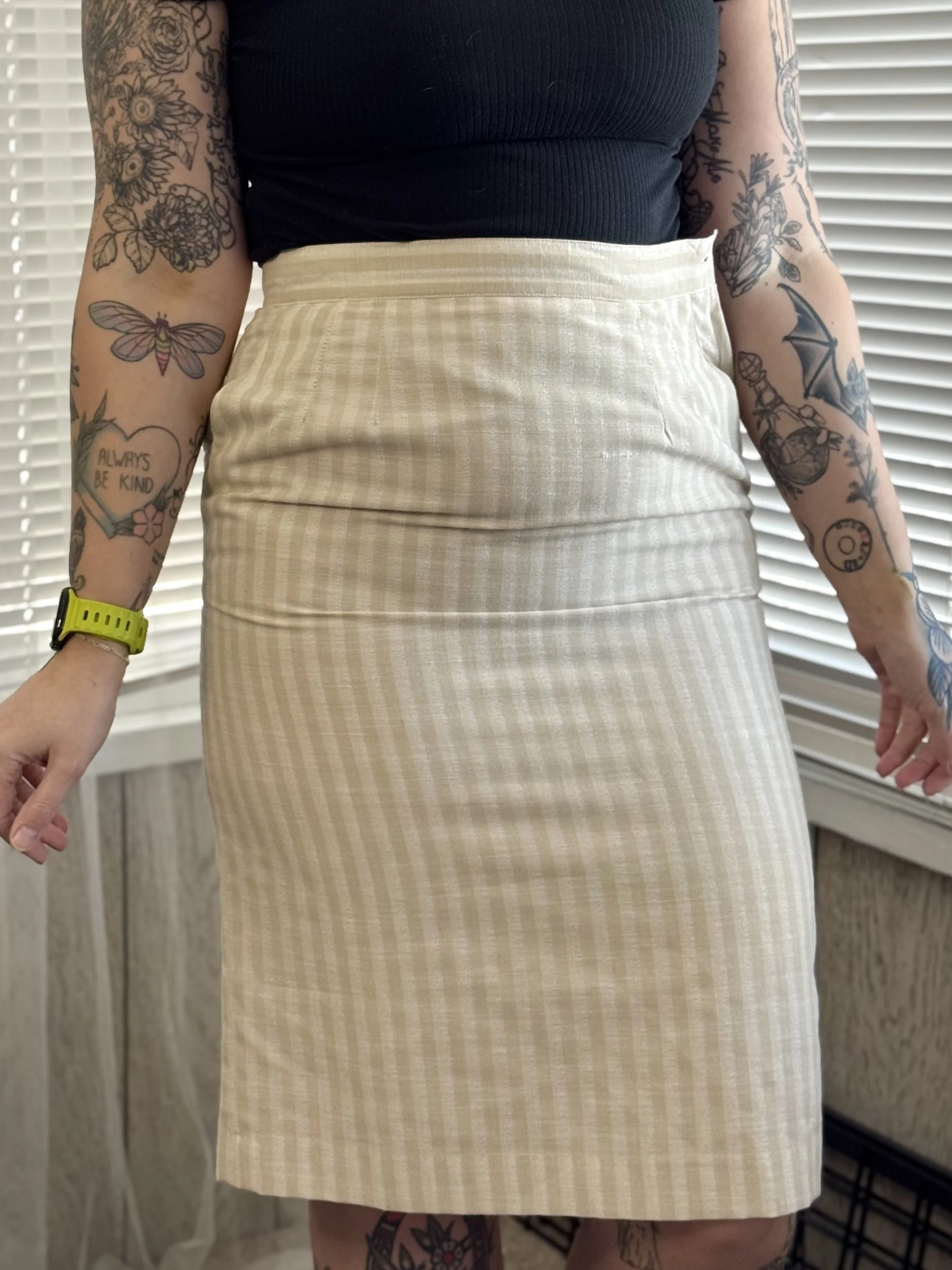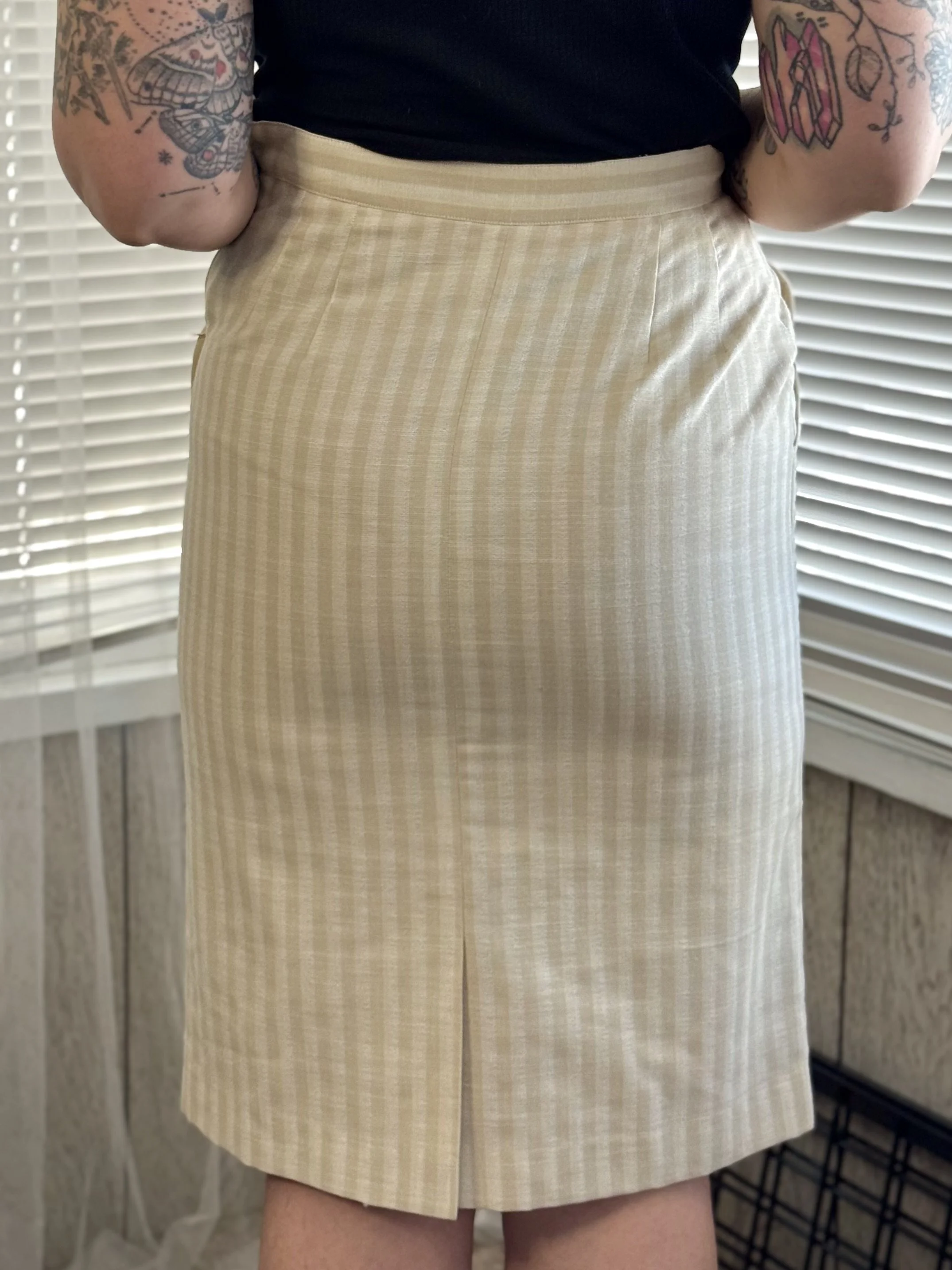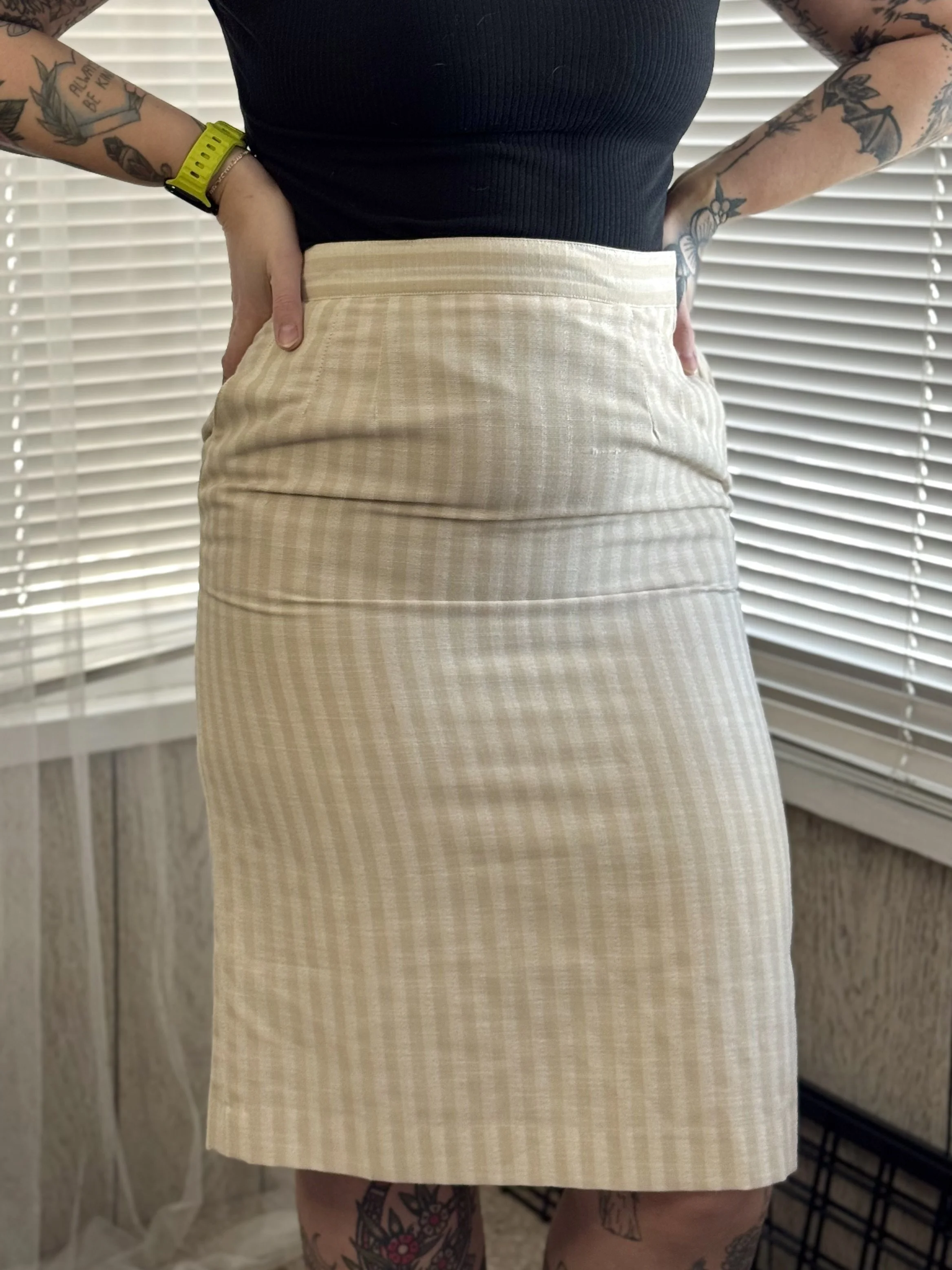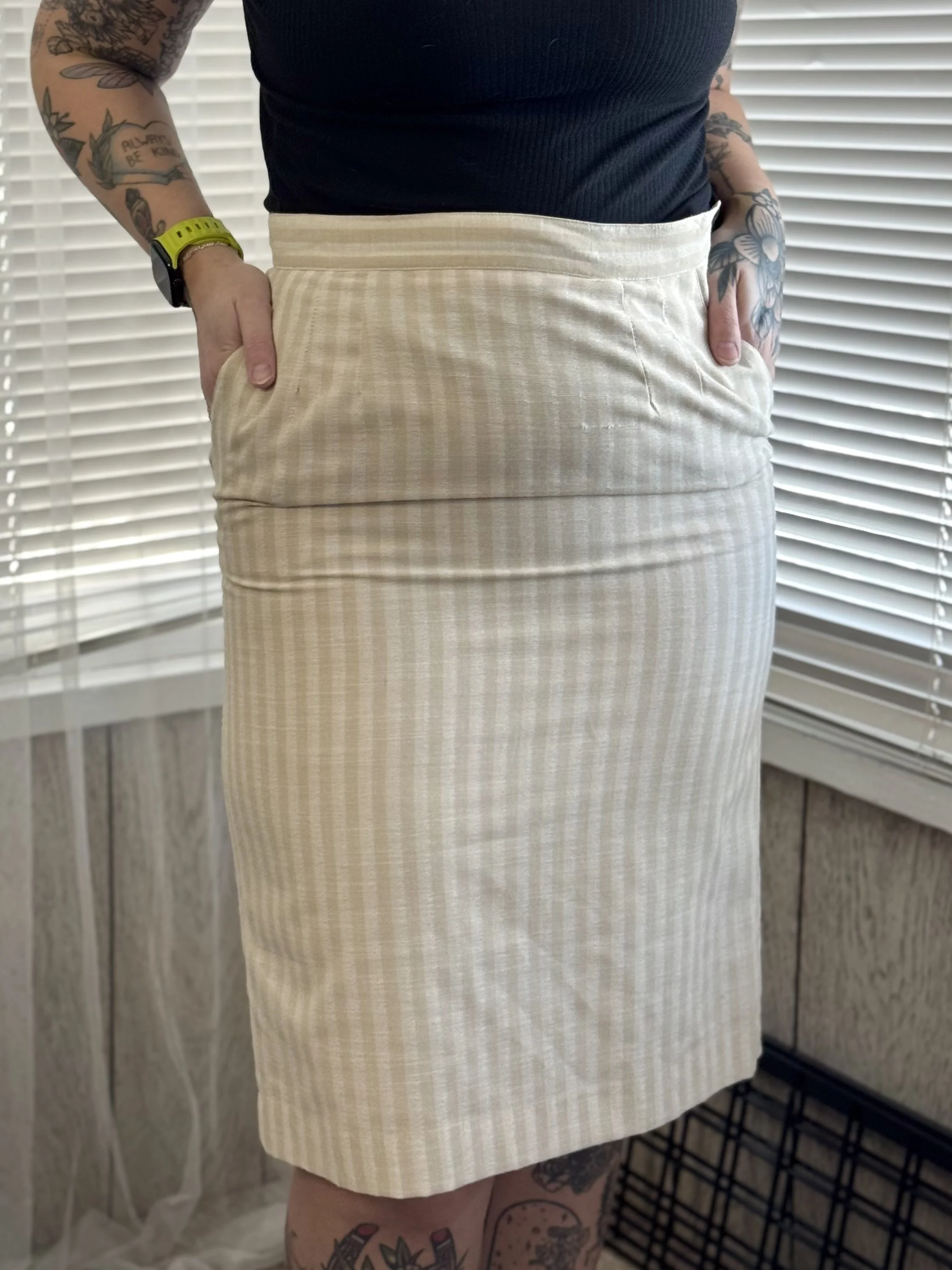 Vintage Peabody tan and white striped, knee-length skirt. Features zipper and top button closure on left side. Two fully-functional pockets.