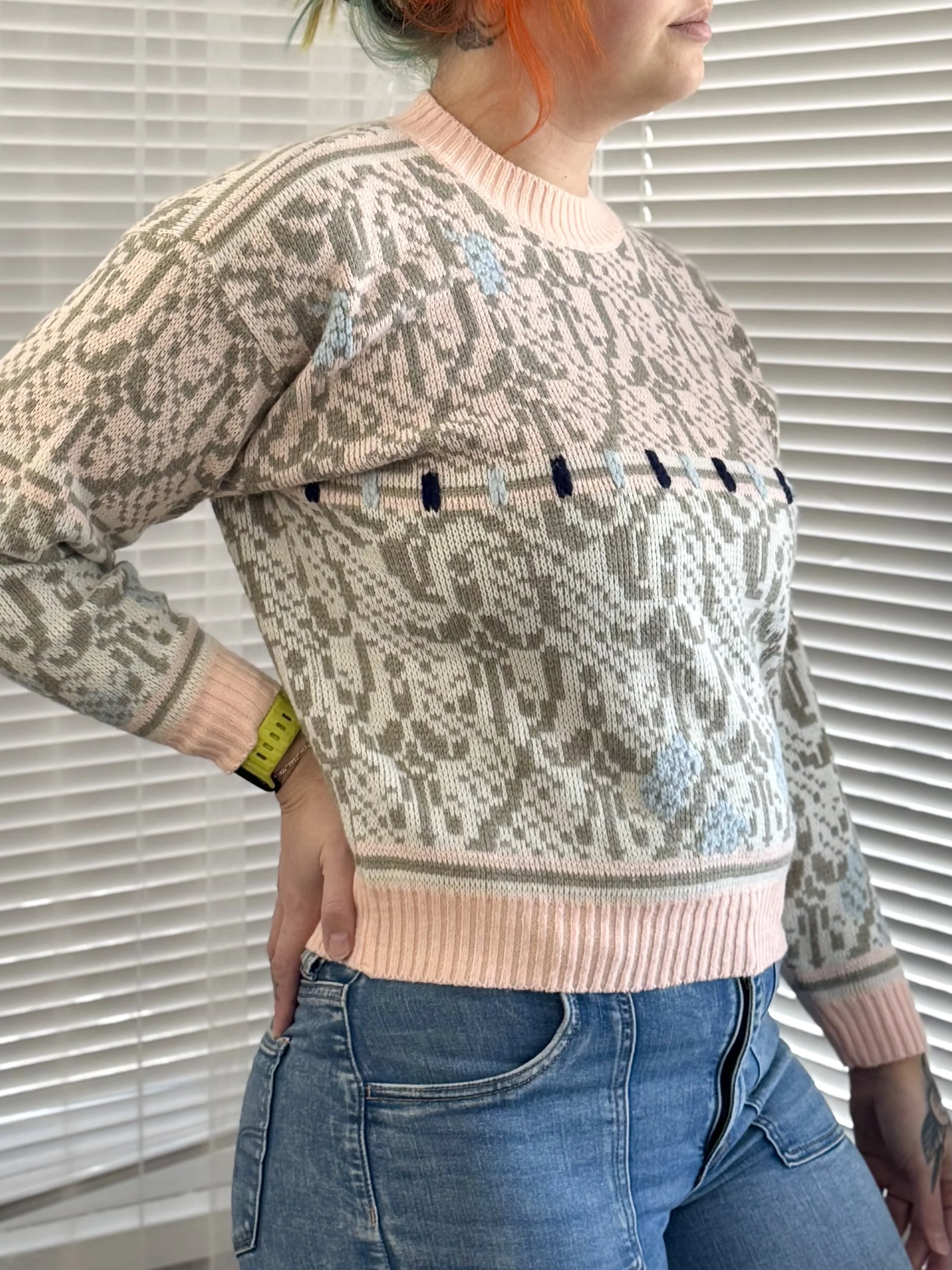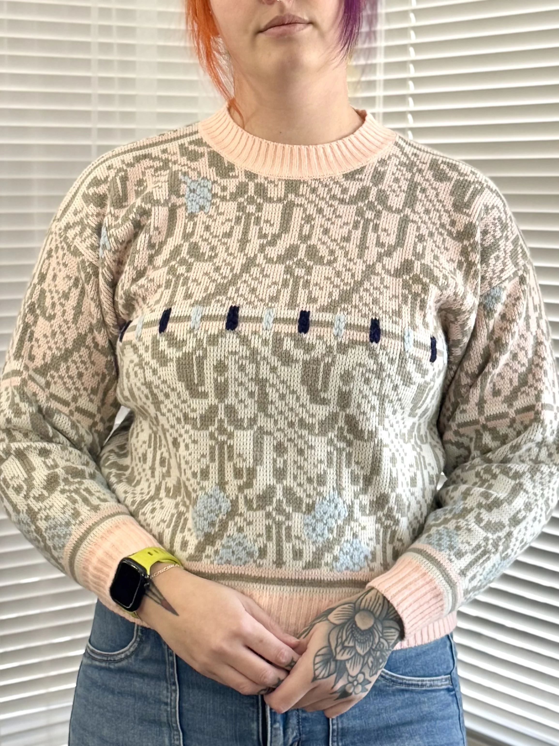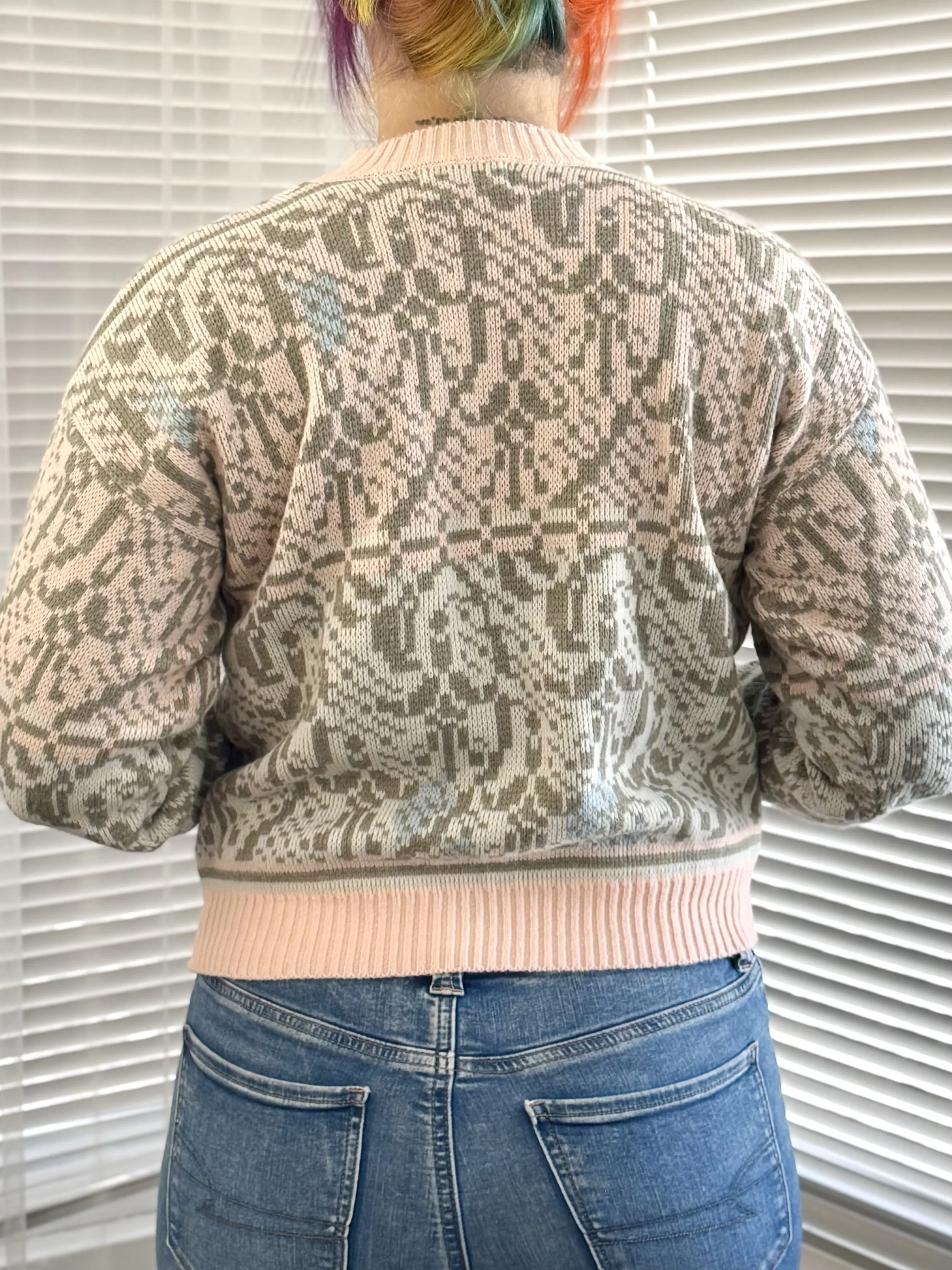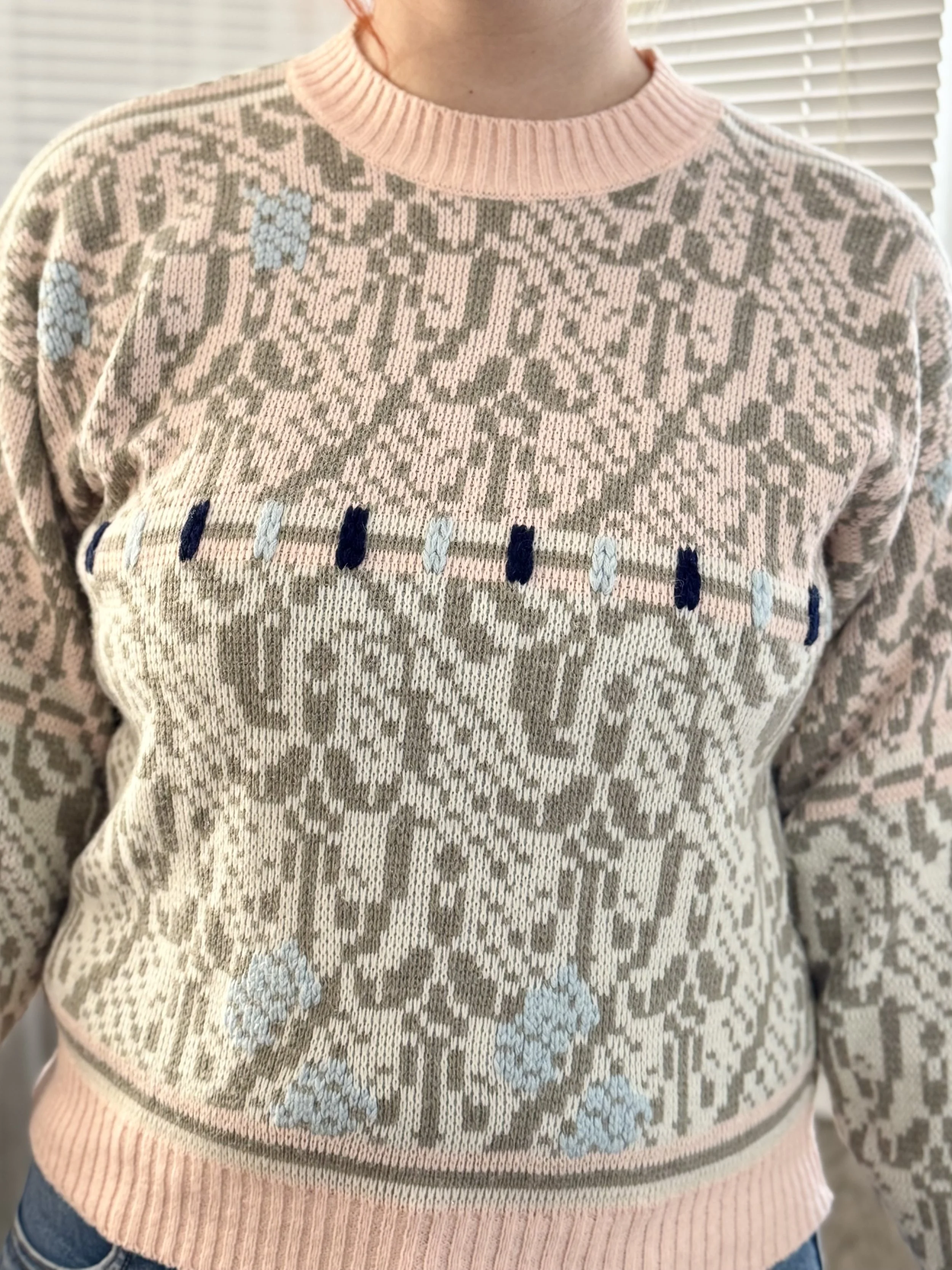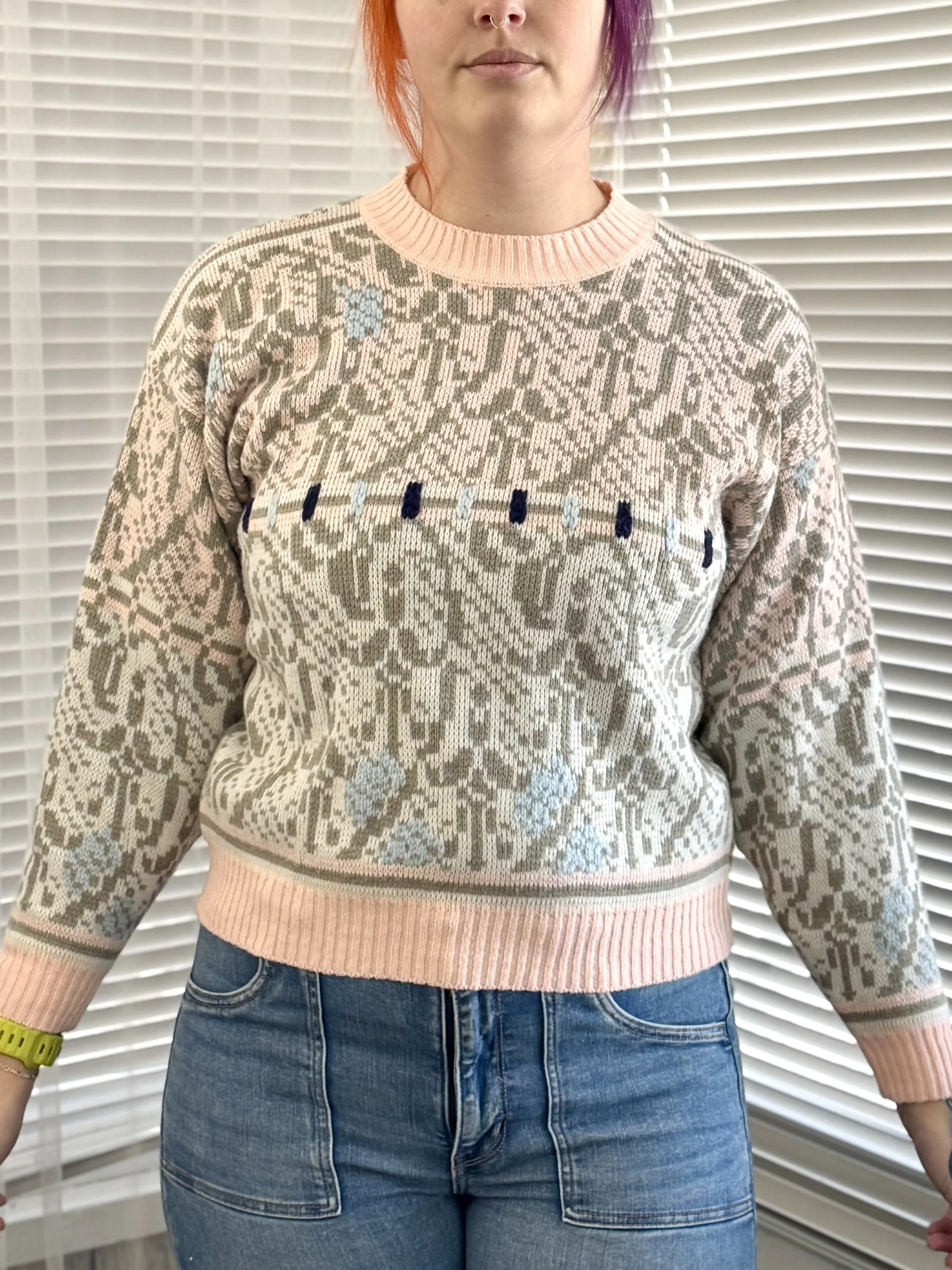 Vintage 62 East sweater. Features light pink, light grey, and white pattern with light blue and navy scattered squares. Slips on, no zipper or button closures.
