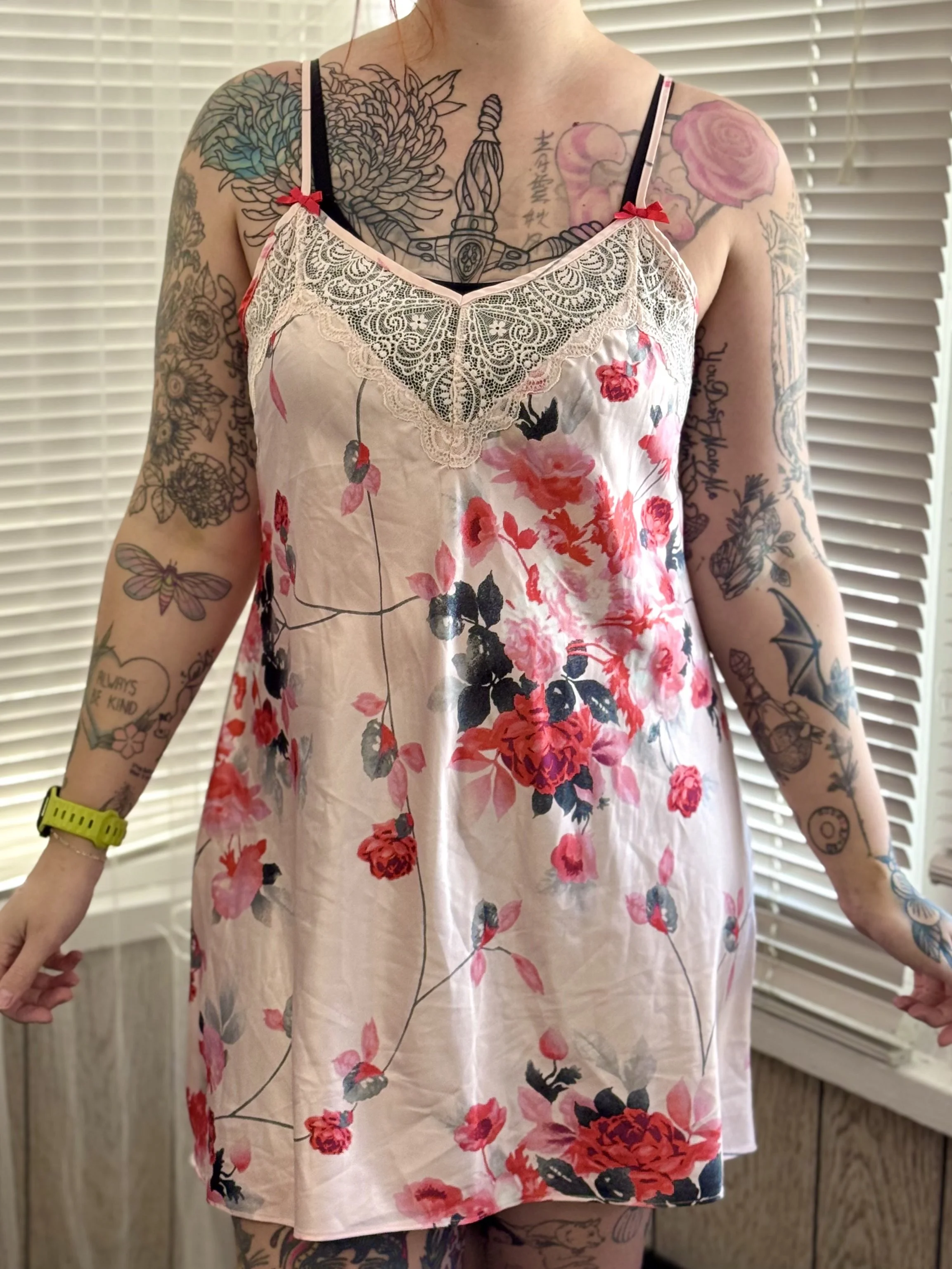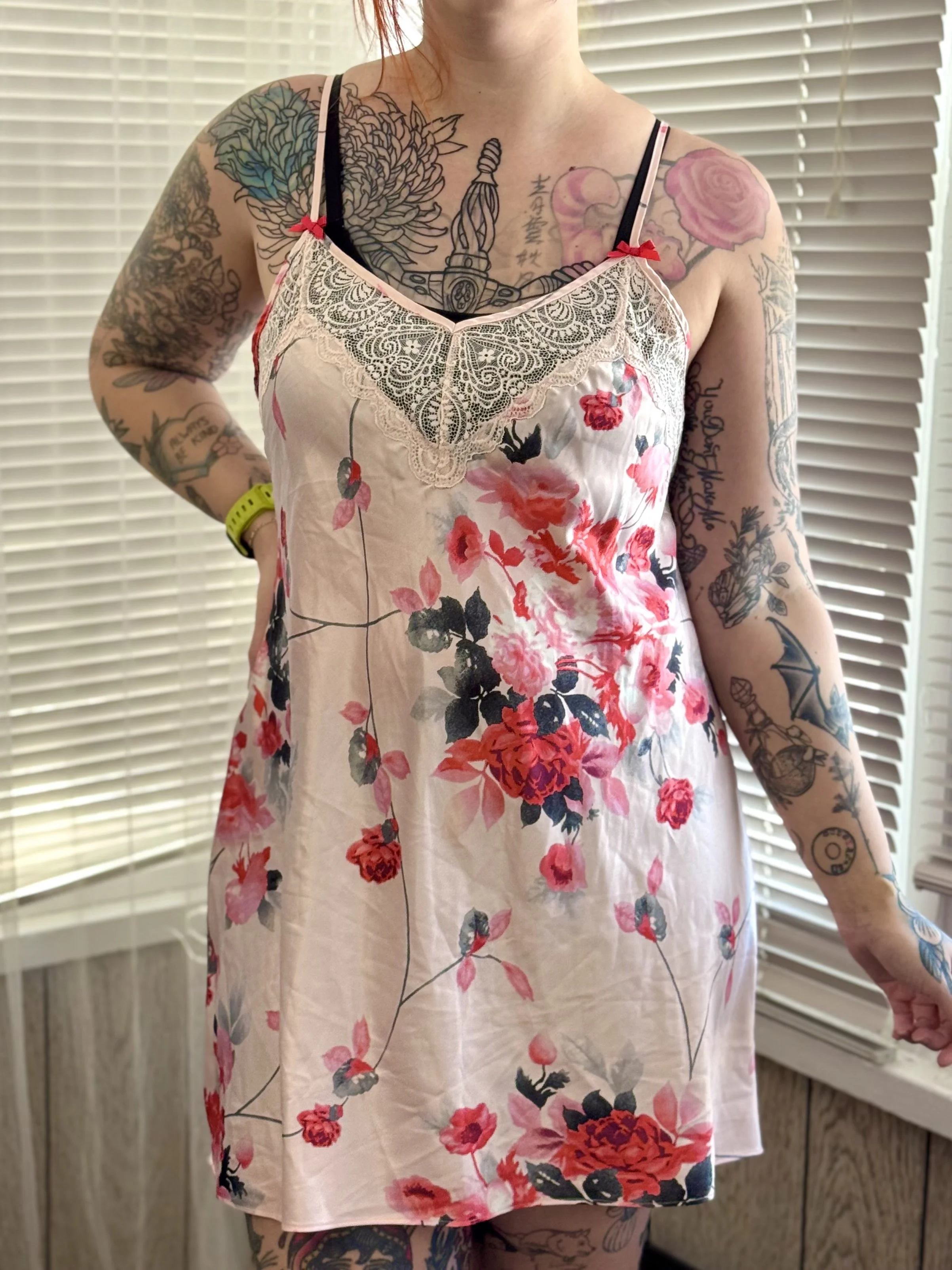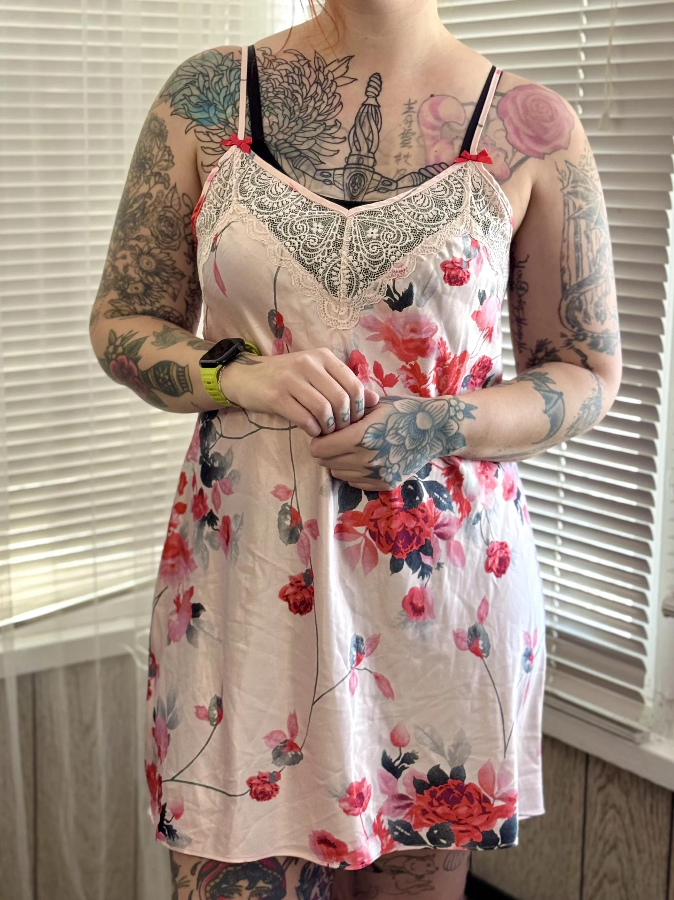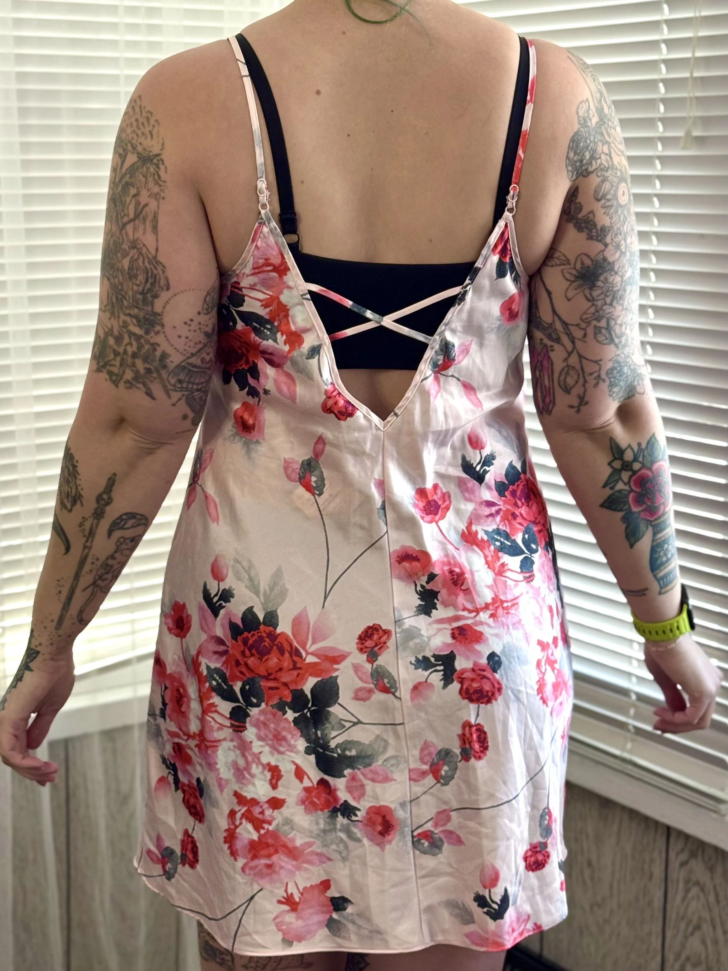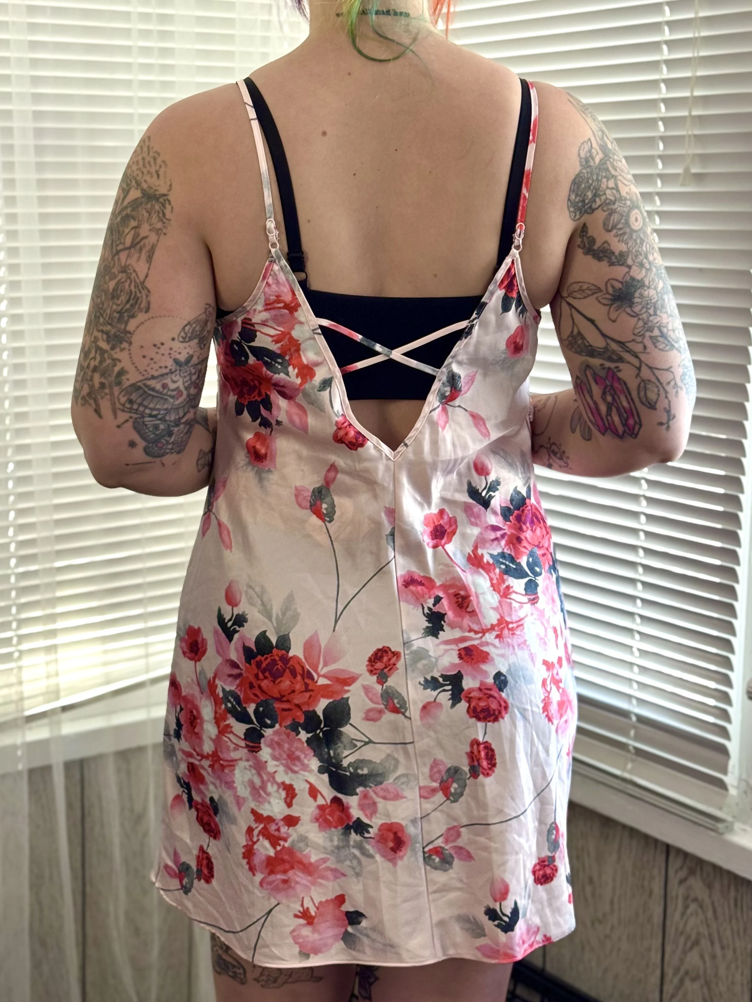 Thrifted Apt 9 pink floral-print slip dress. Material is semi-sheer. Features lace detail on front neckline and criss-cross detail in back cutout. Straps are adjustable. Slips on, no zipper or button closures.