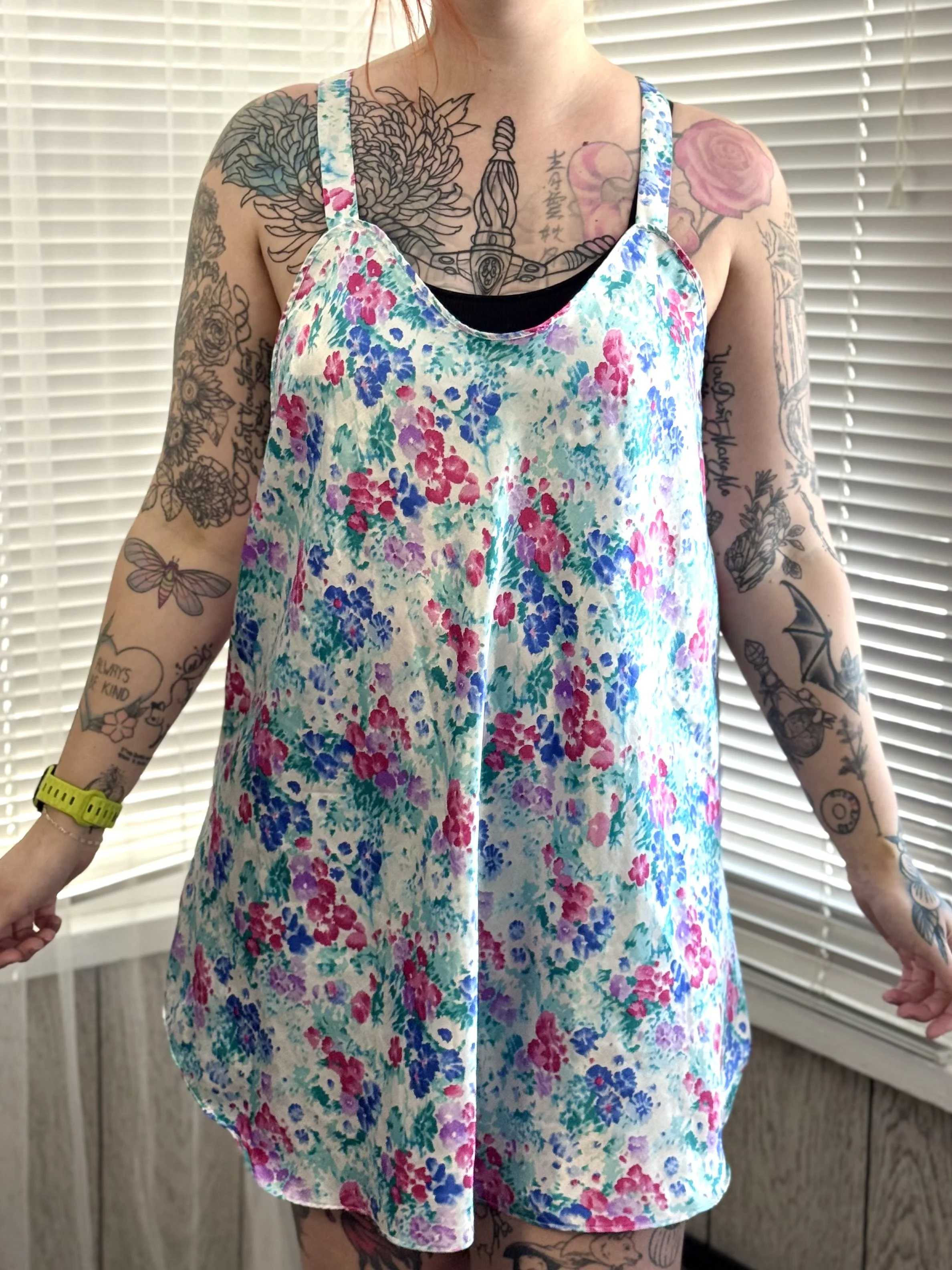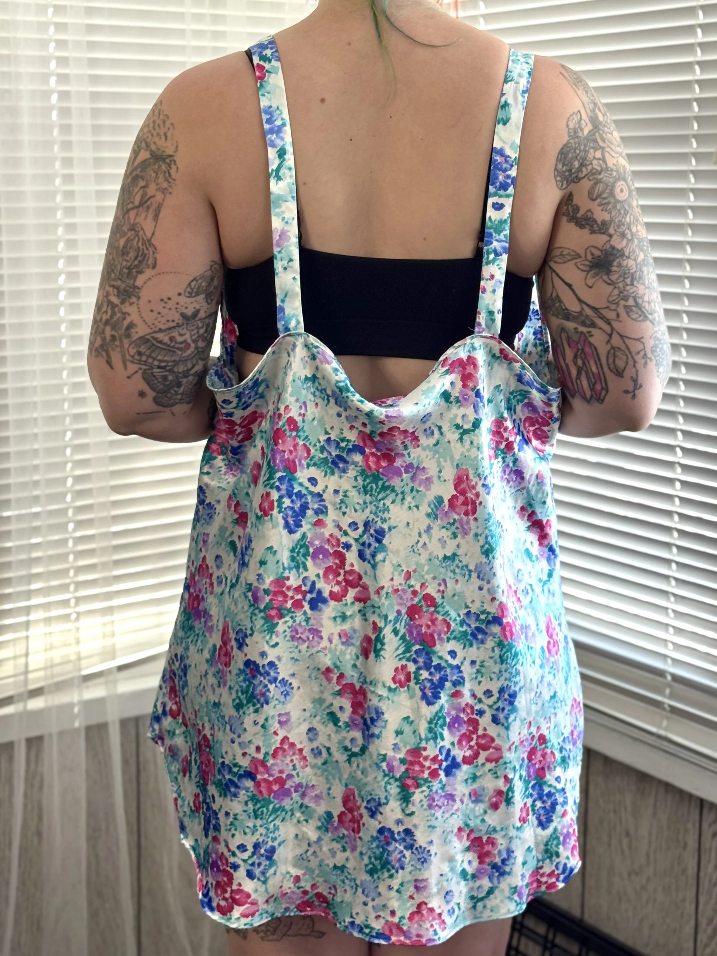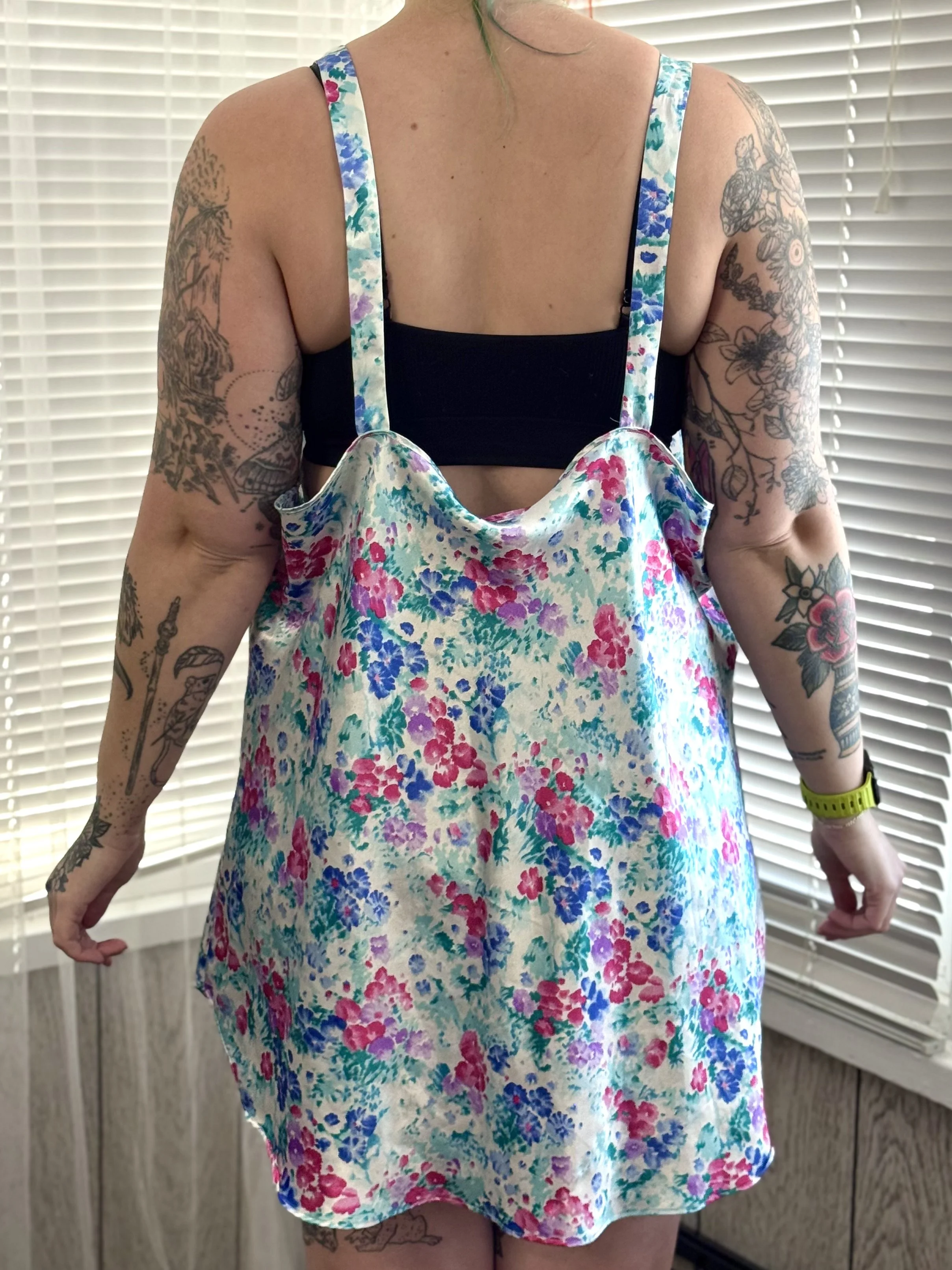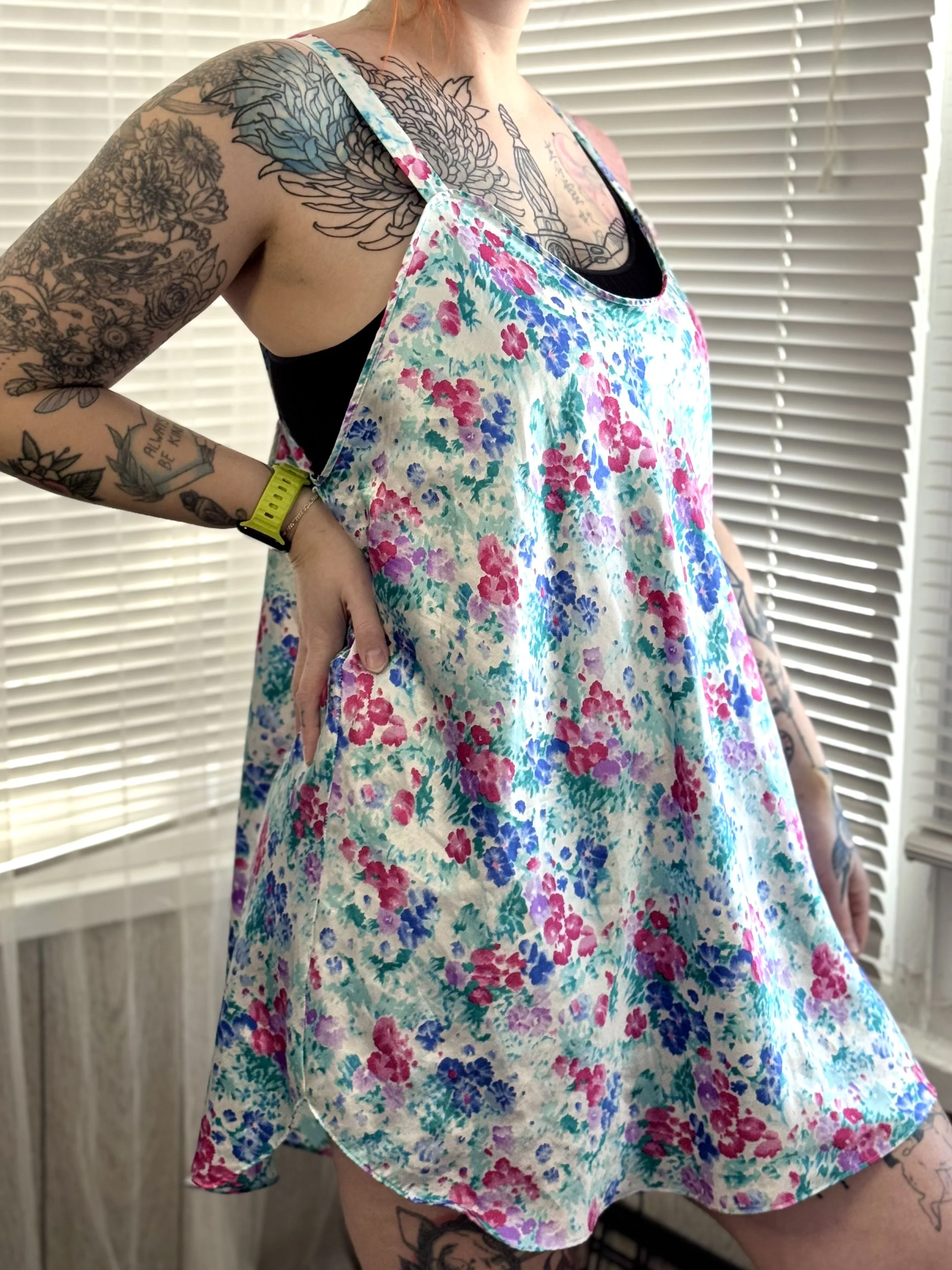 Vintage Pinx floral print slip dress. Material is opaque. Features pink, teal, purple, and dark blue small floral print. Straps are not adjustable. Slips on, no zipper or button closures.