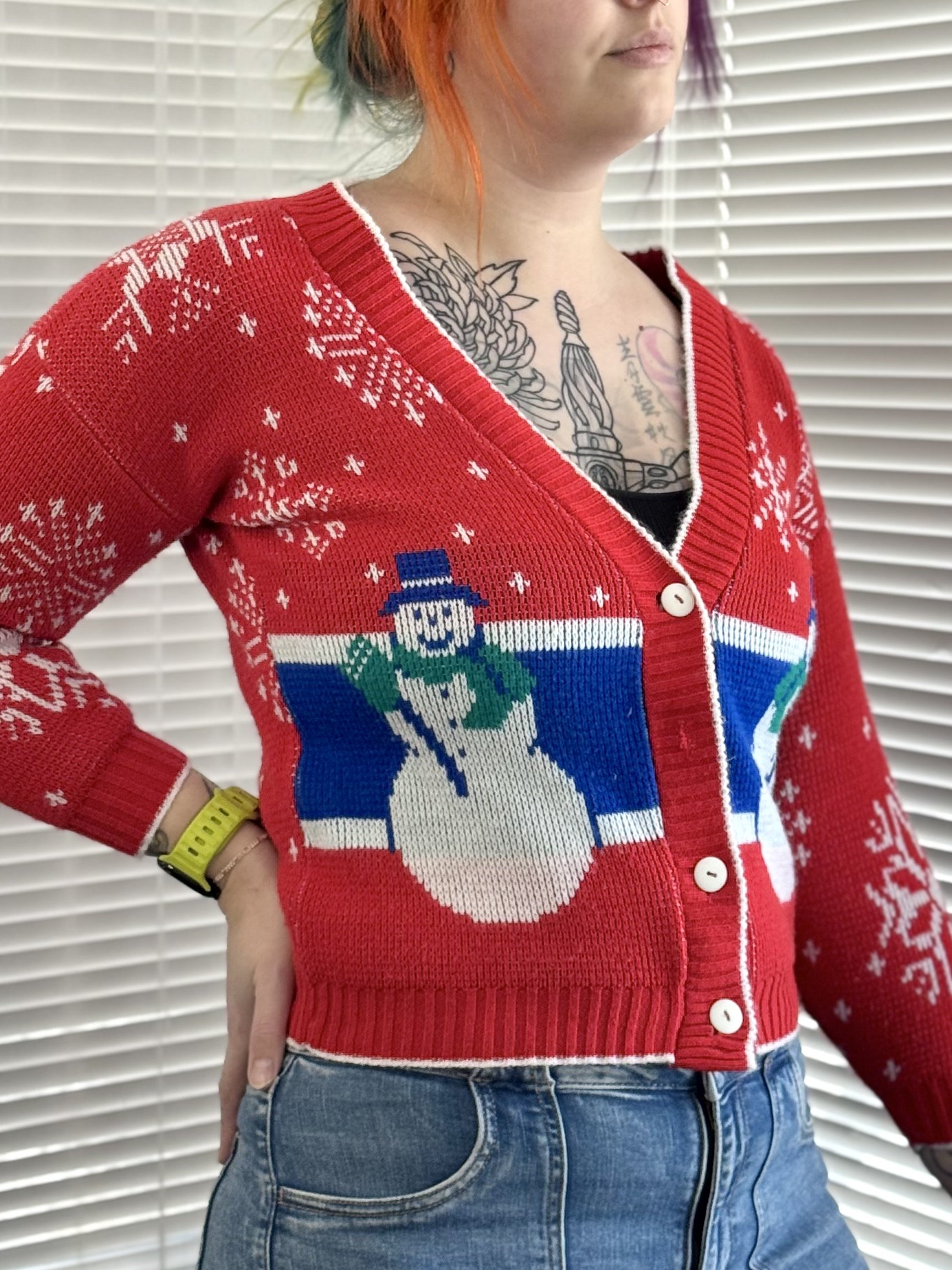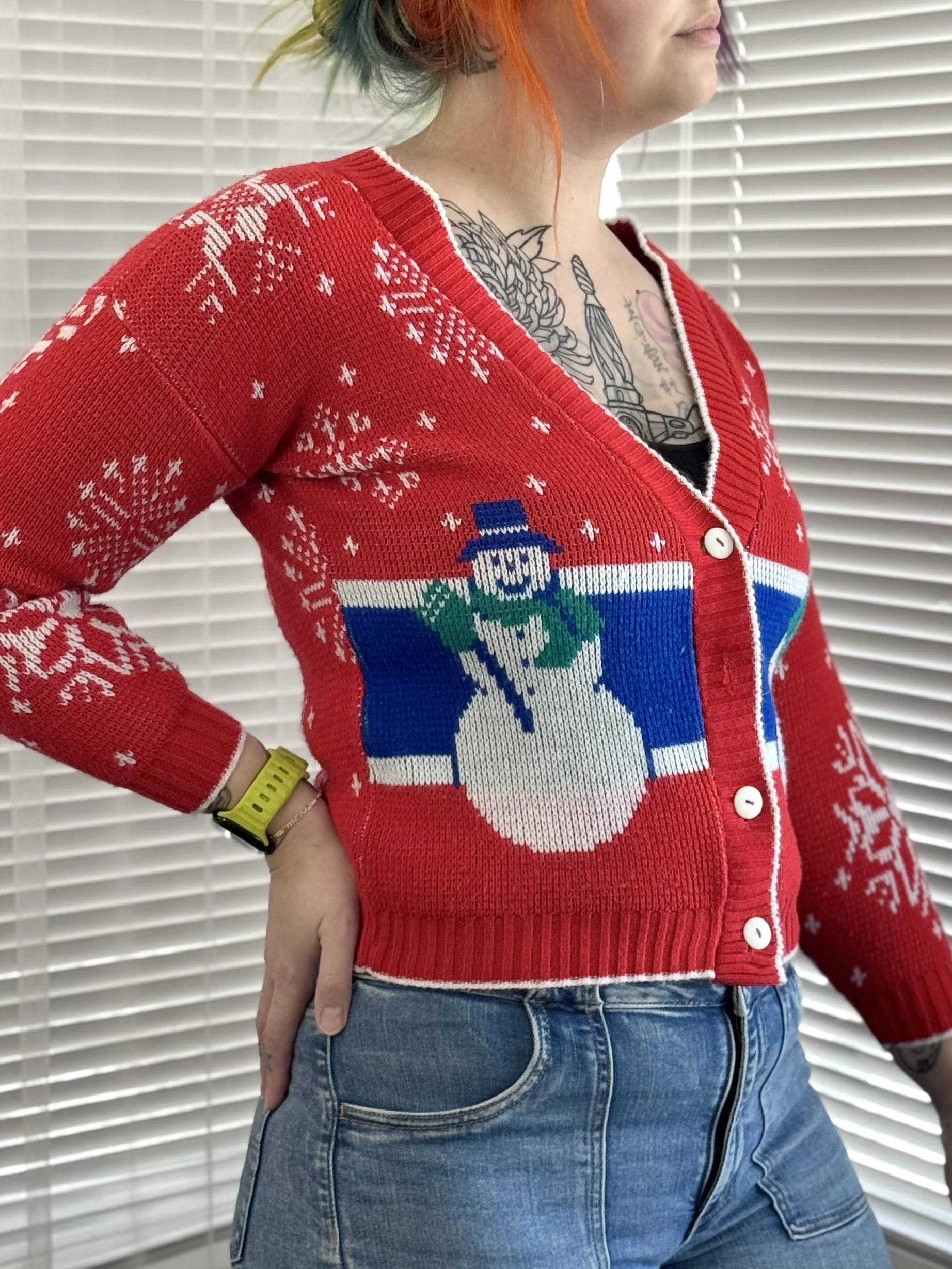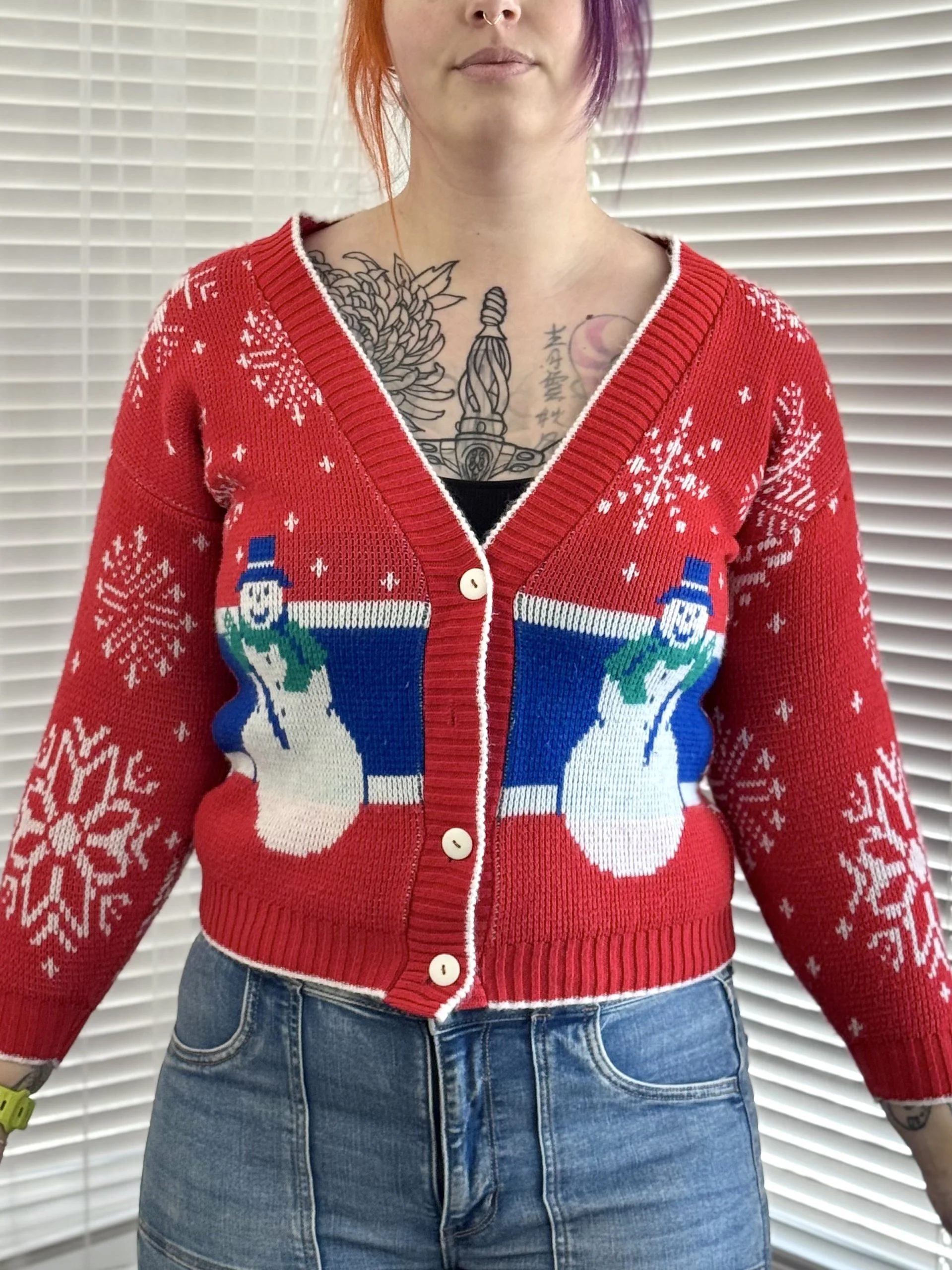 Vintage Jamie Rose red knit cardigan with snowman and snowflake print. Two snowmen on each side of front - blue background and snowmen details and green scarves. V-neck with front button closure - one button is missing.