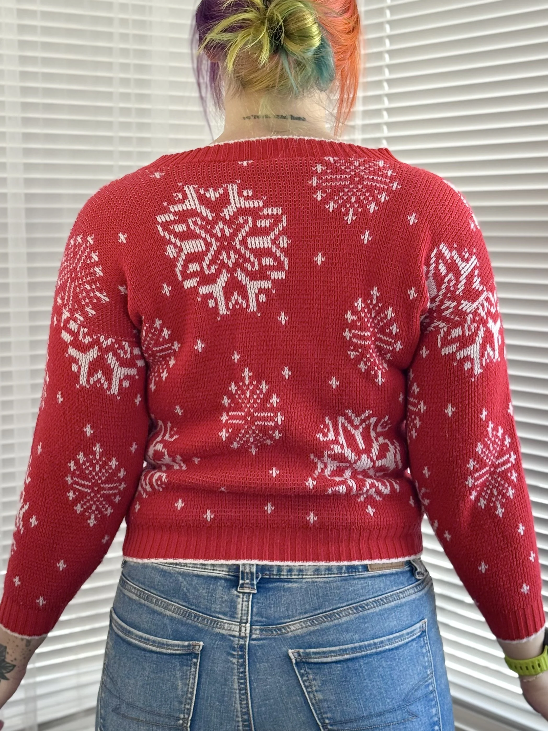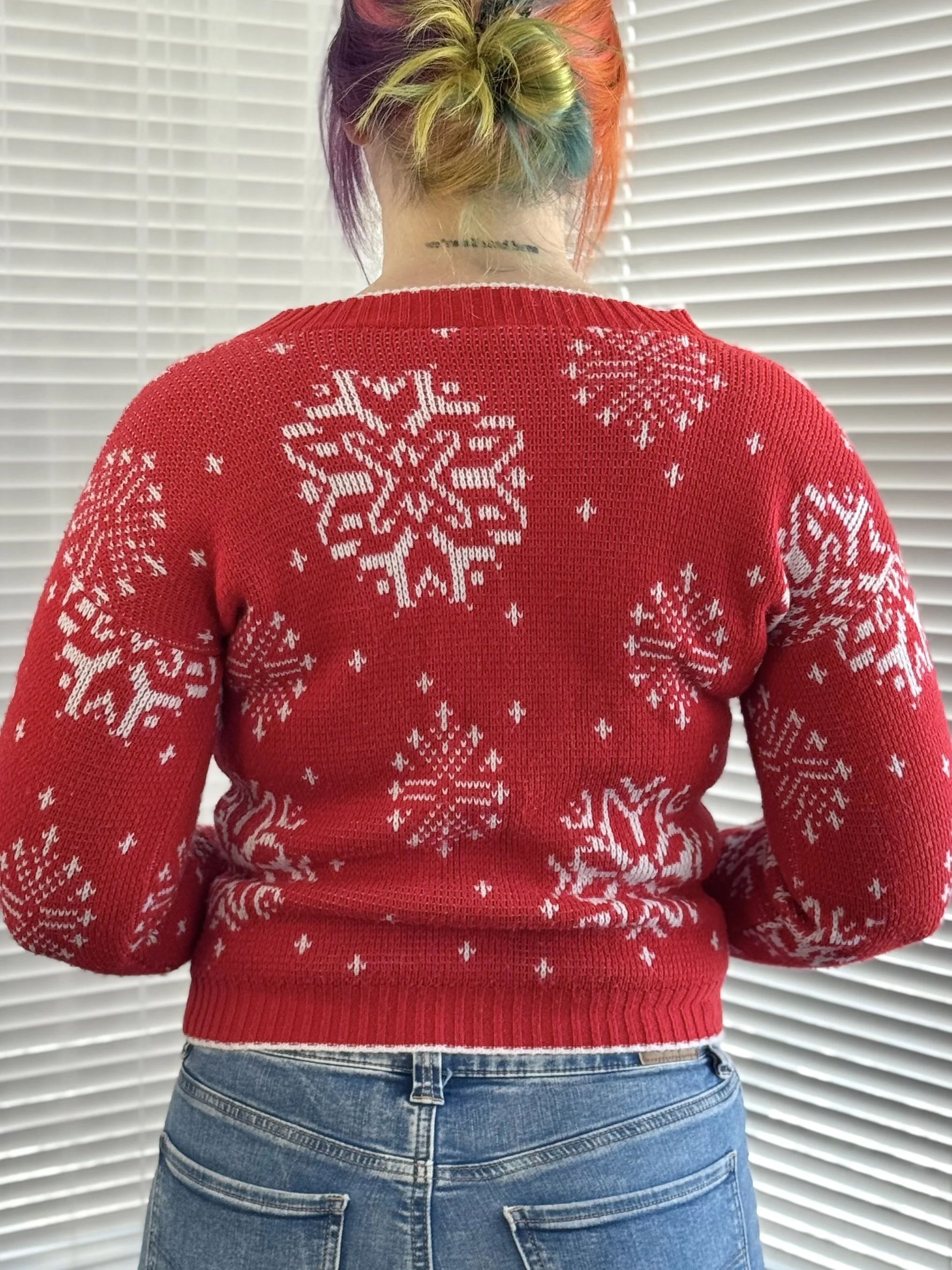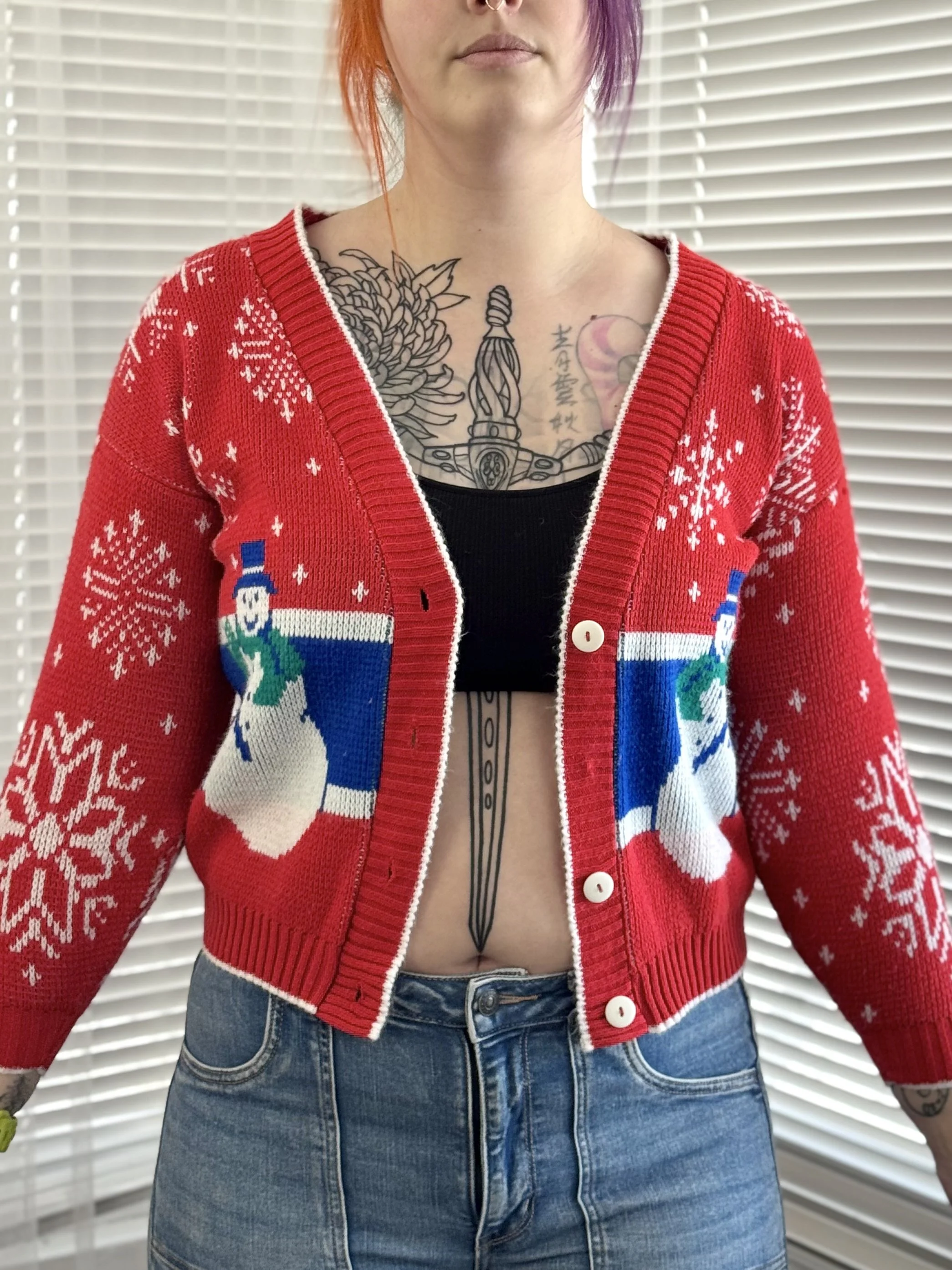 Vintage Jamie Rose red knit cardigan with snowman and snowflake print. Two snowmen on each side of front - blue background and snowmen details and green scarves. V-neck with front button closure - one button is missing.