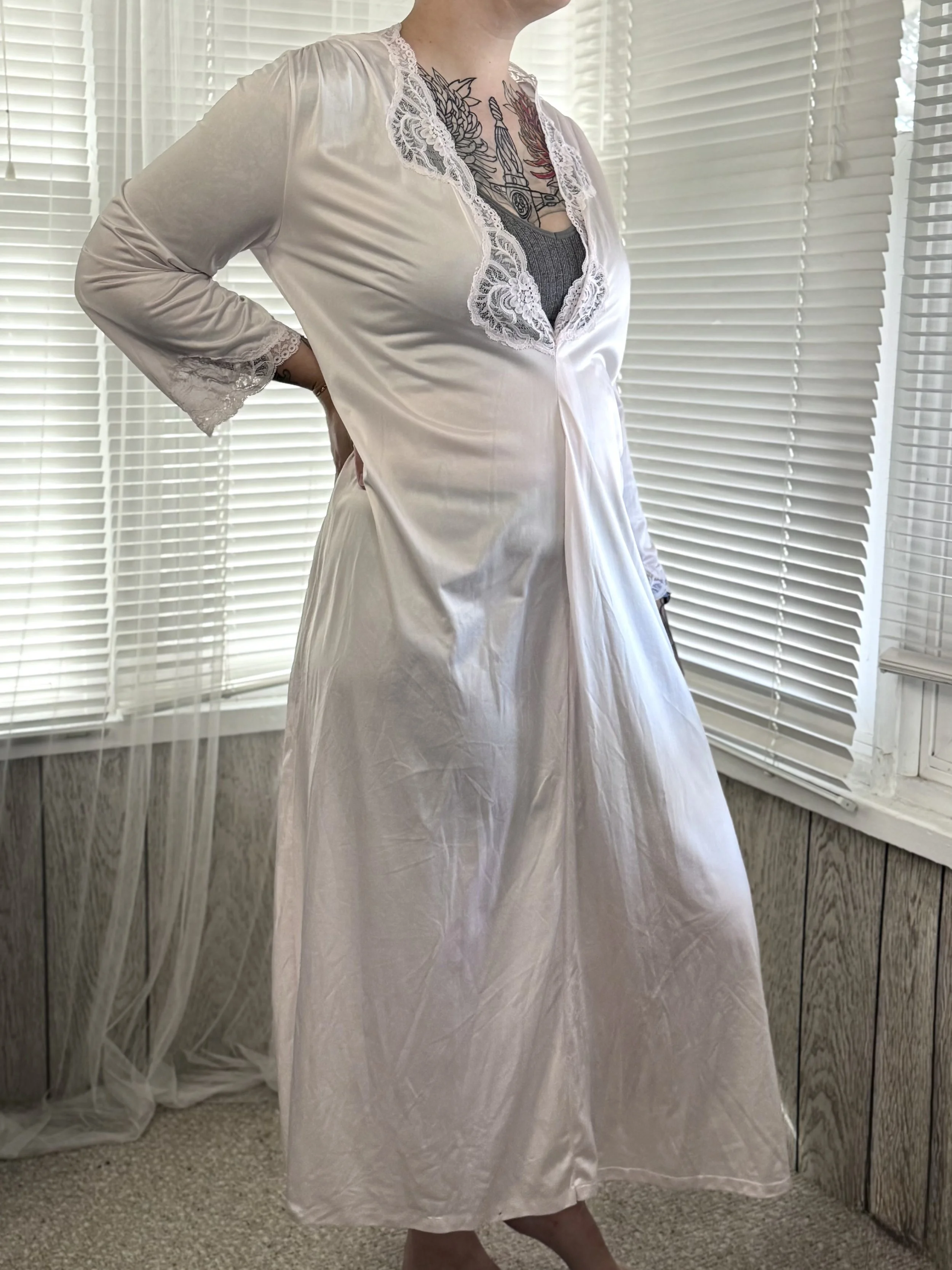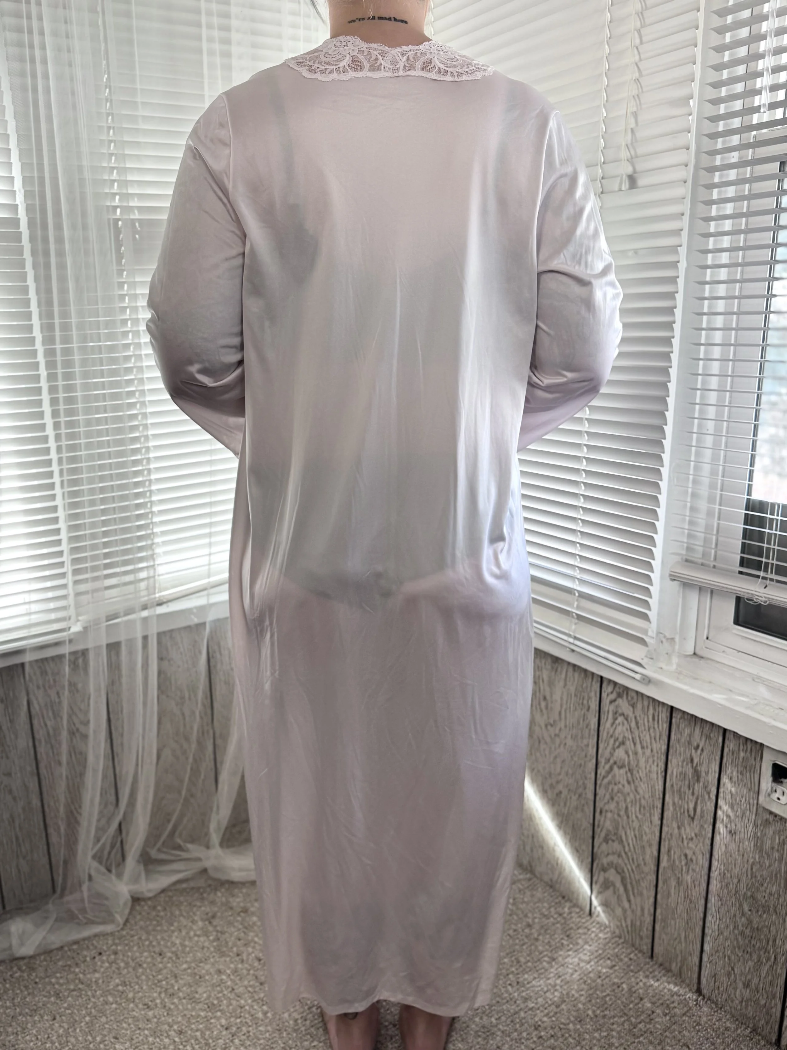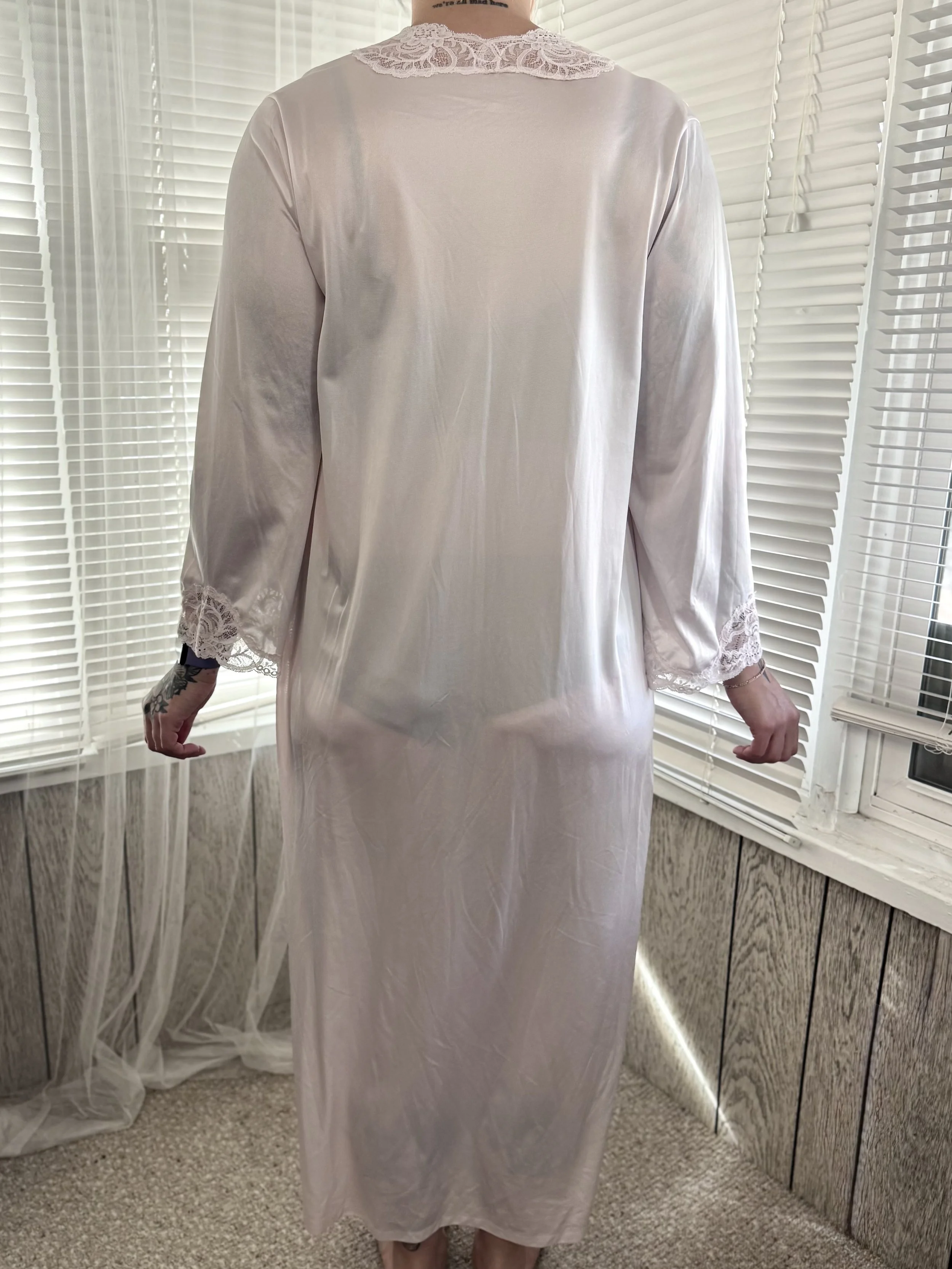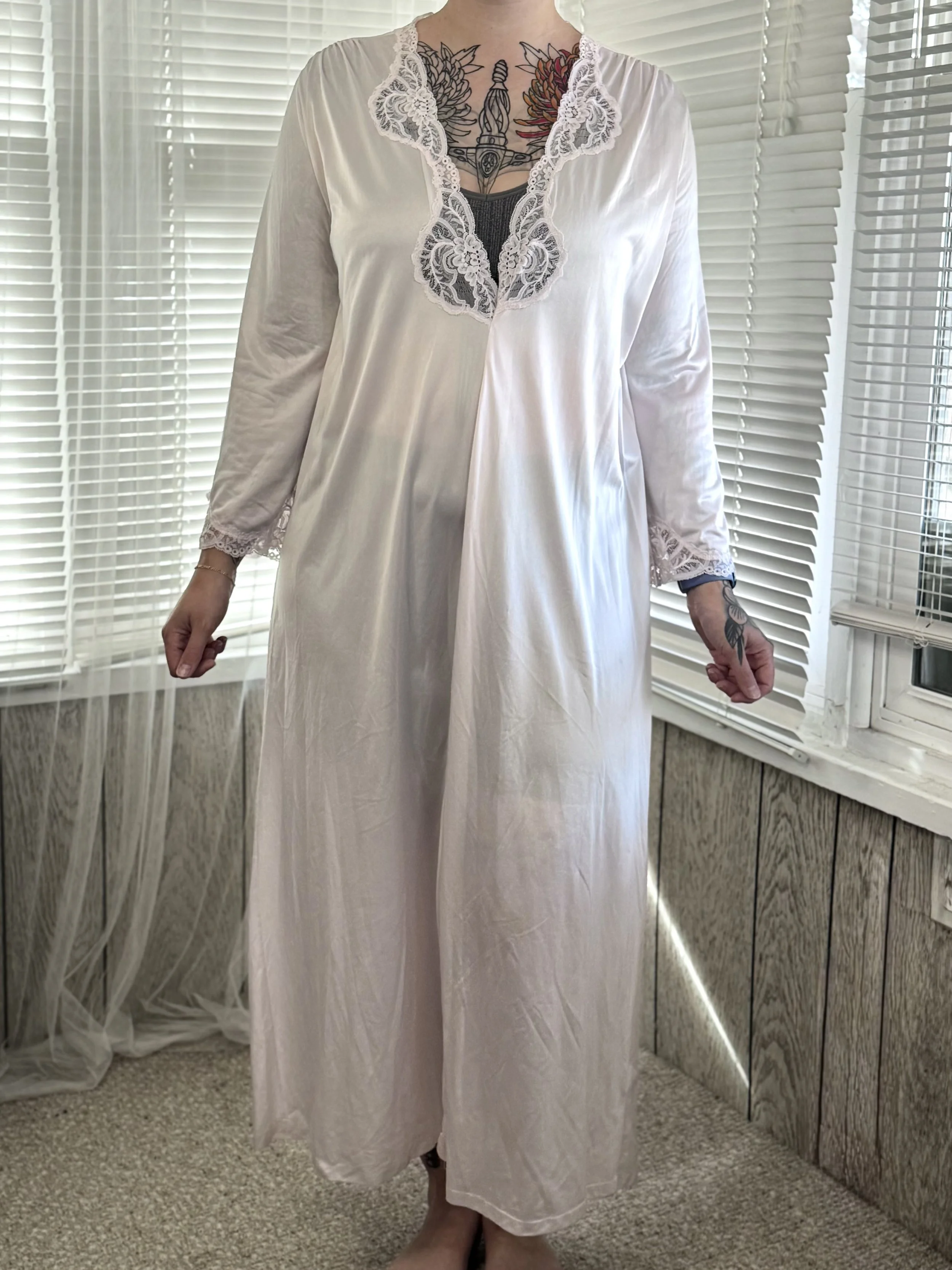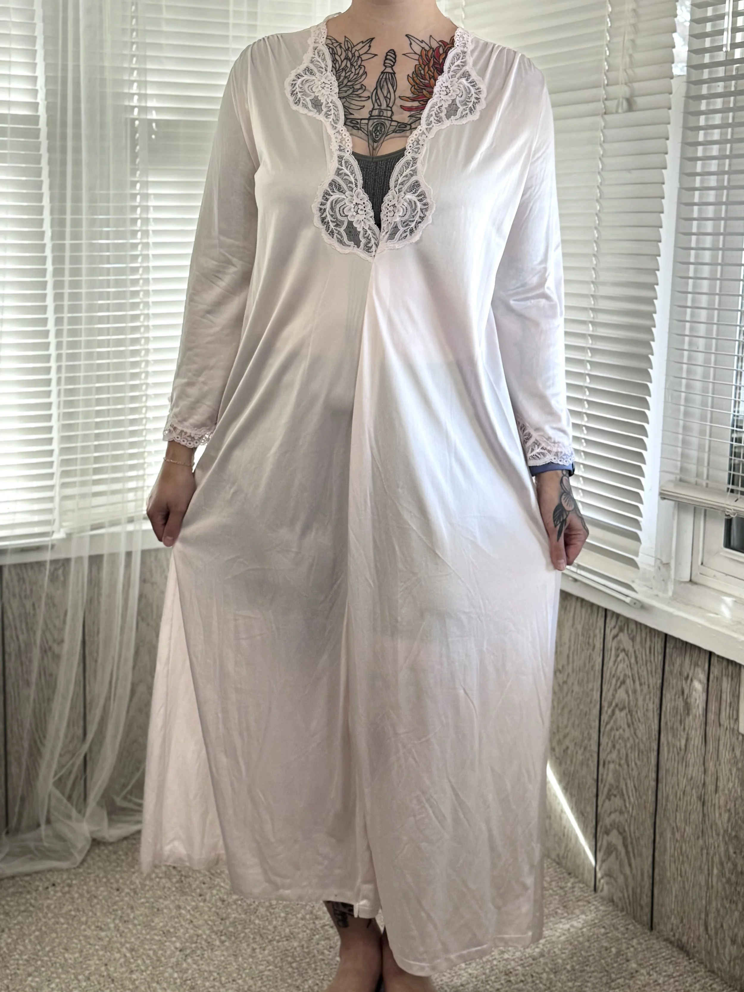 Vintage soft pink long-sleeved maxi slip dress. Material is semi-sheer. Features deep V neckline with lace trim. Two belt loops on either side. Slips on, no zipper or button closures.