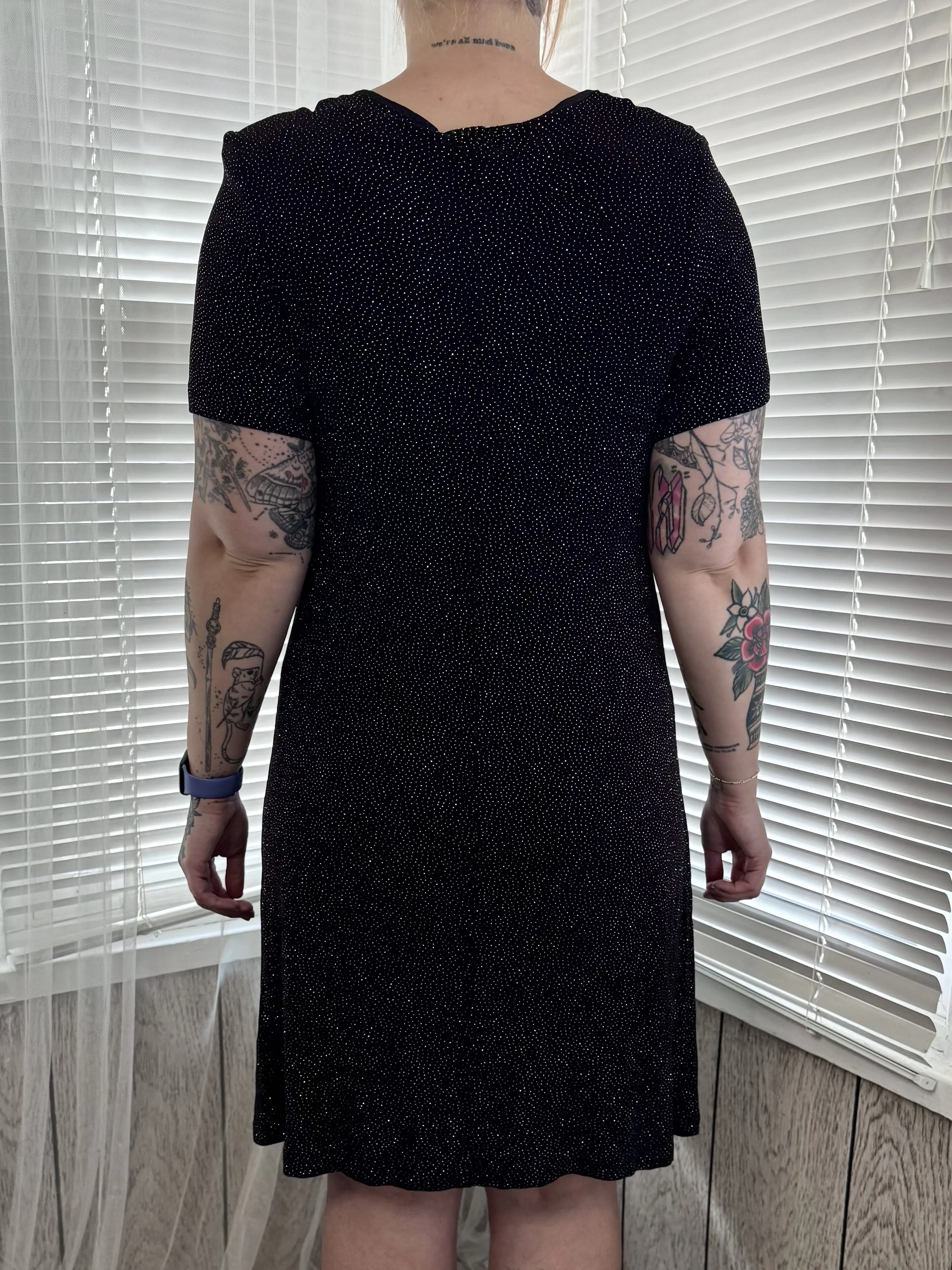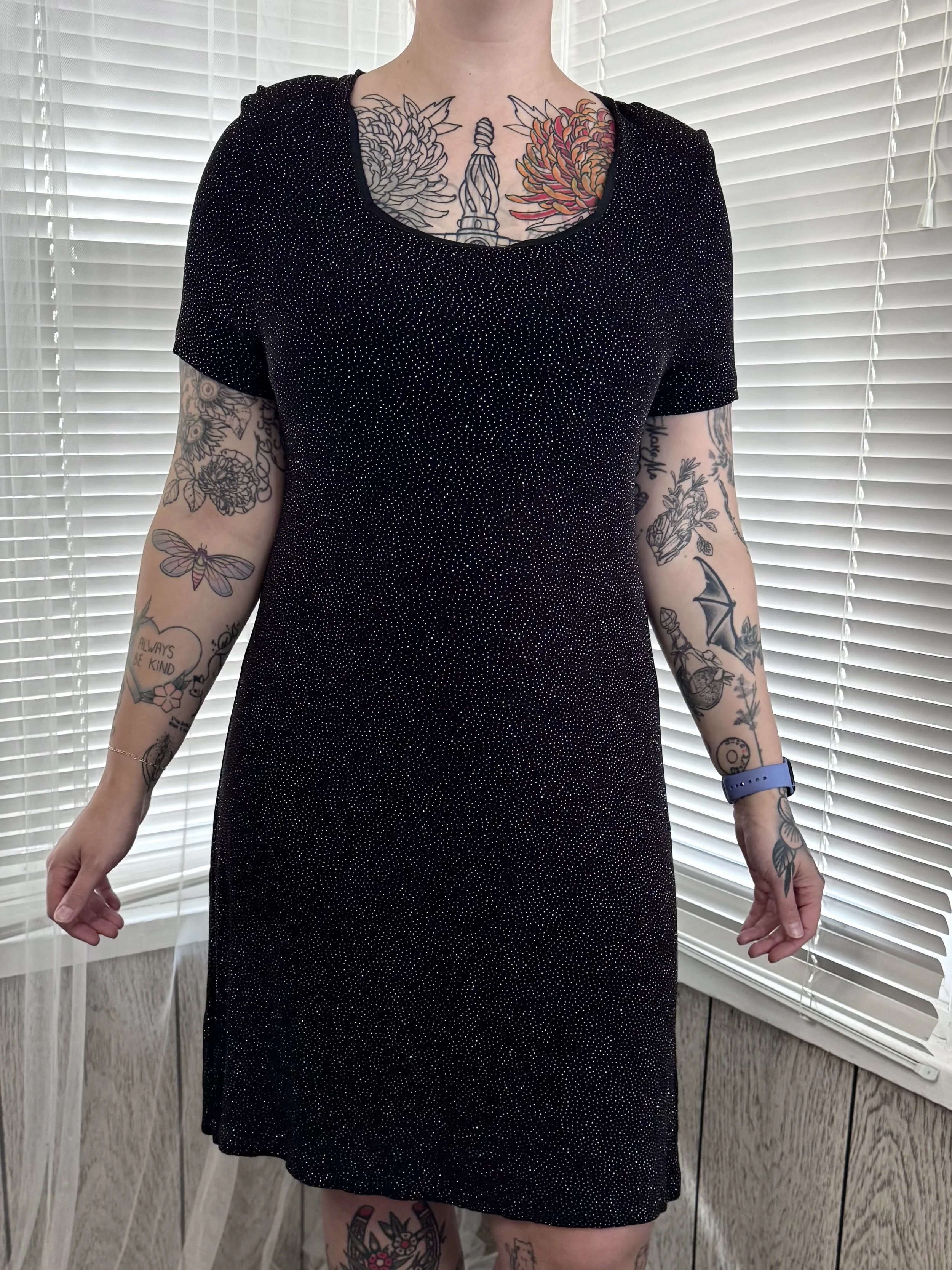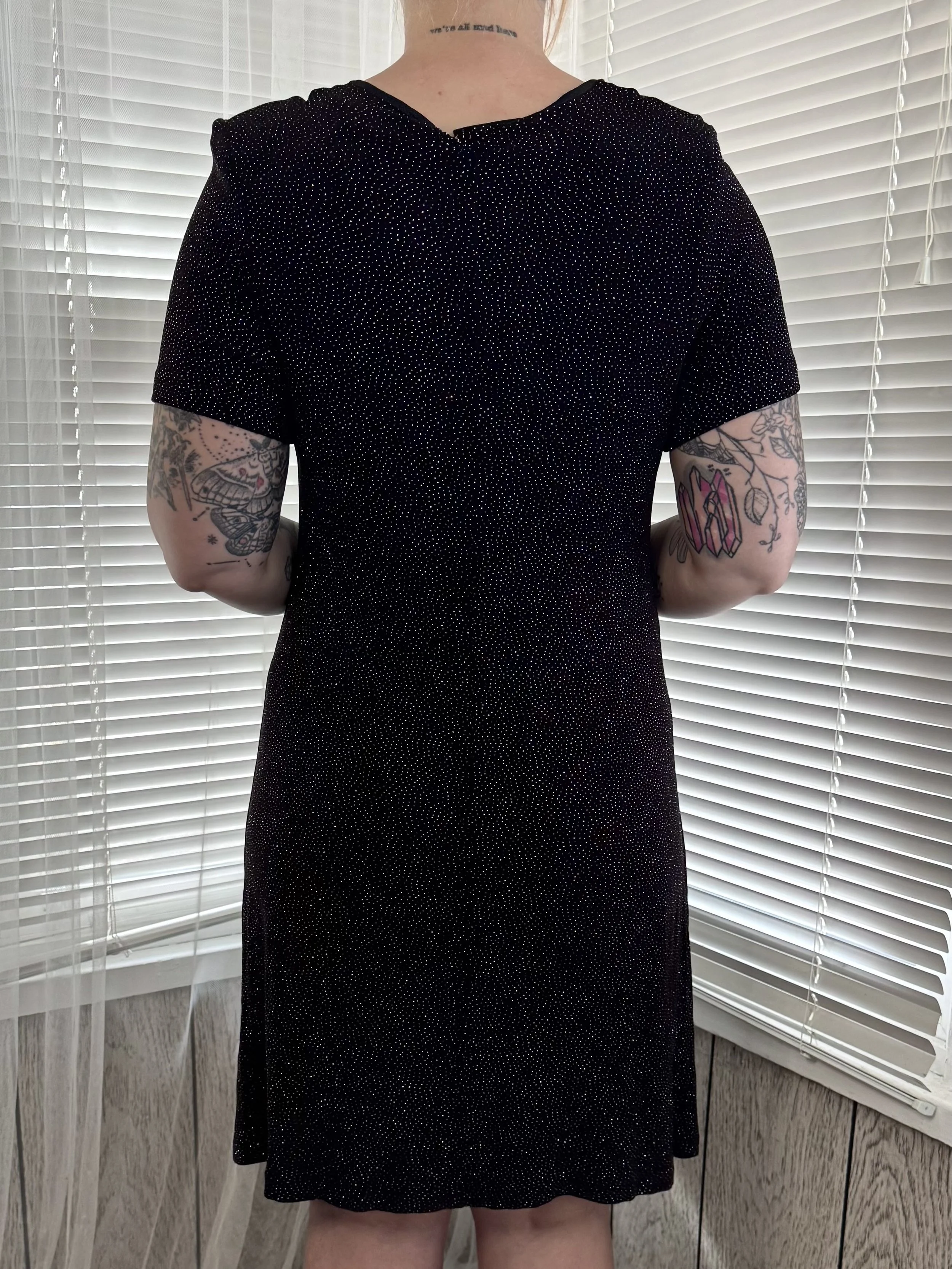 Vintage Ultra Nights short-sleeved knee-length black dress with sparkly dot print. Features square neckline. Slips on, no zipper or button closures.