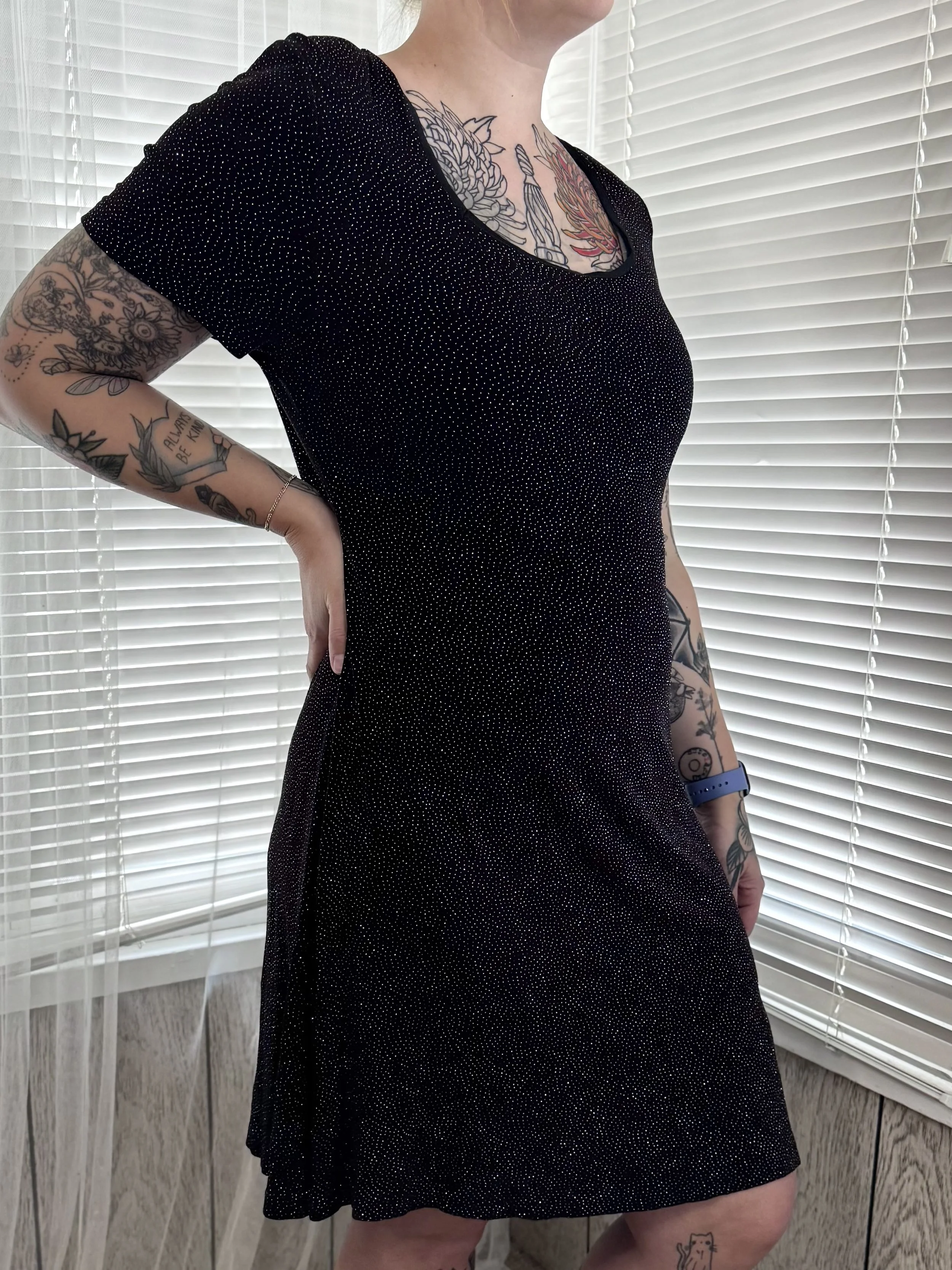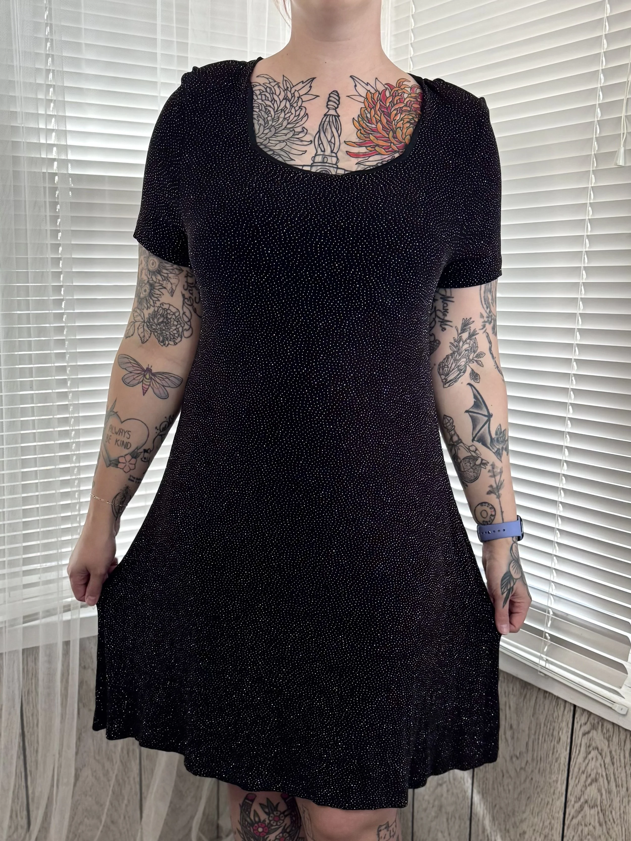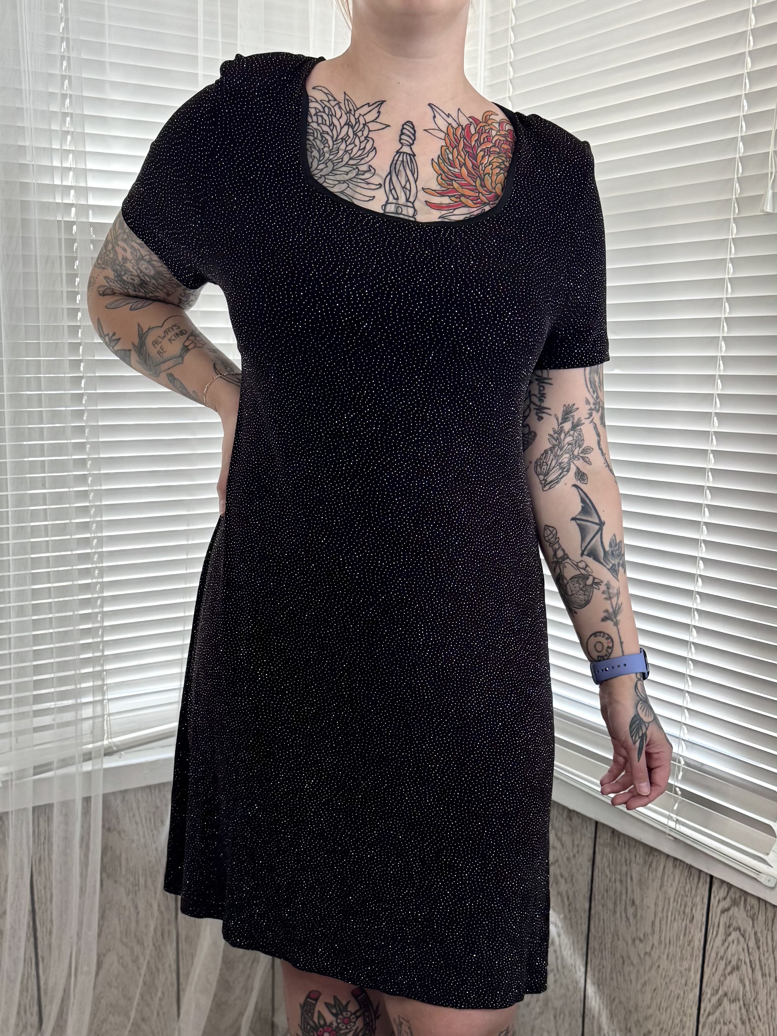 Vintage Ultra Nights short-sleeved knee-length black dress with sparkly dot print. Features square neckline. Slips on, no zipper or button closures.