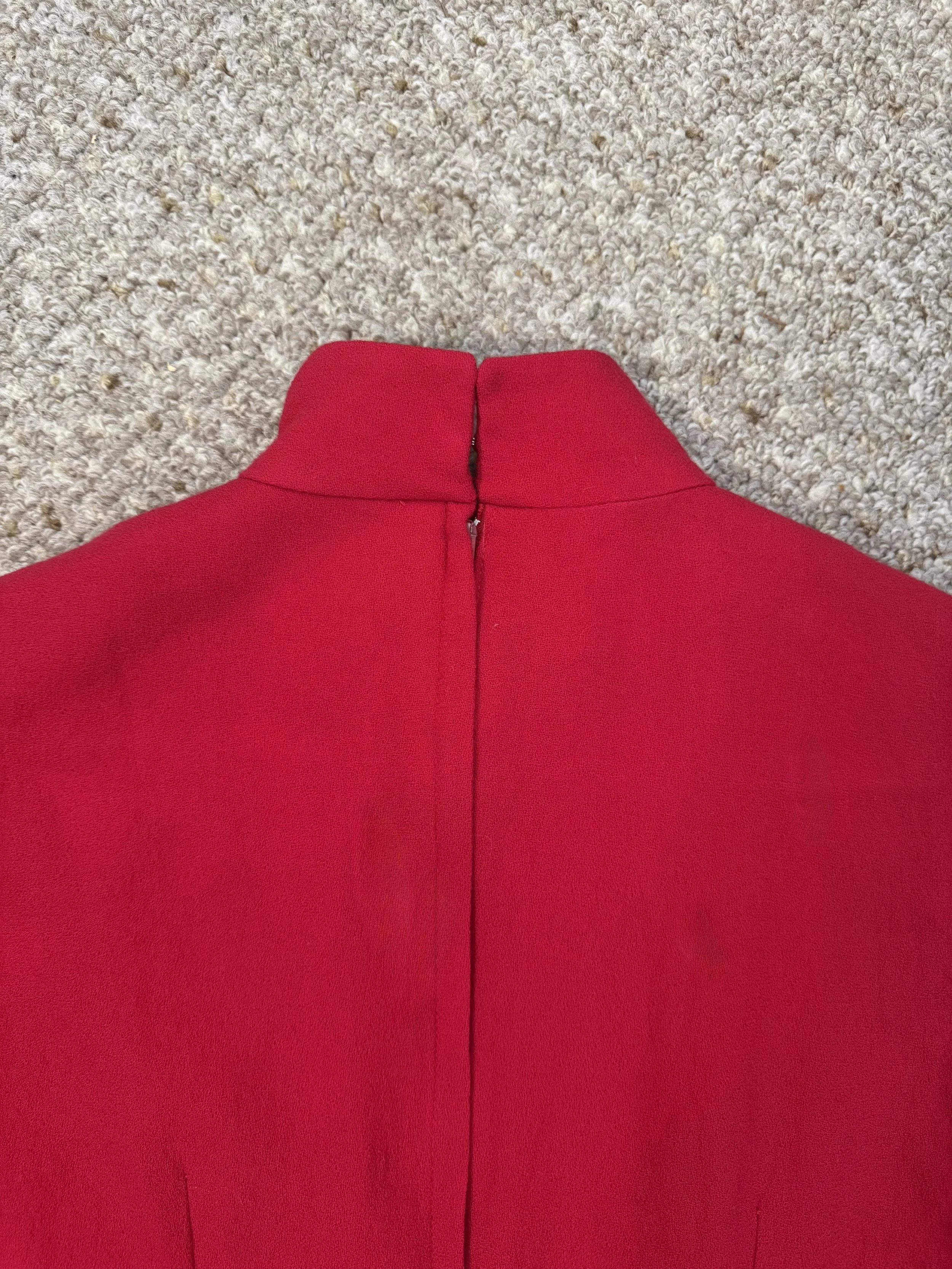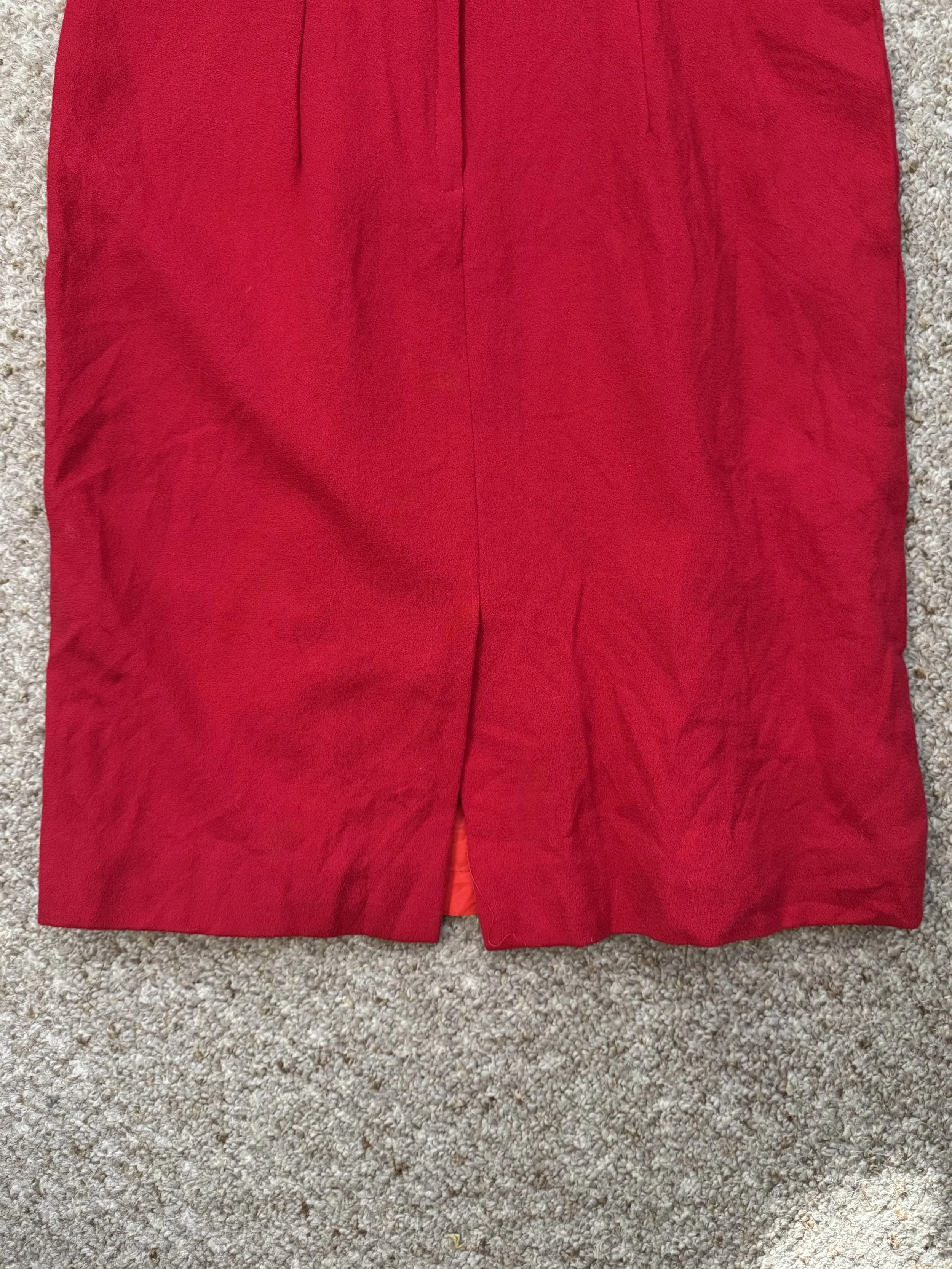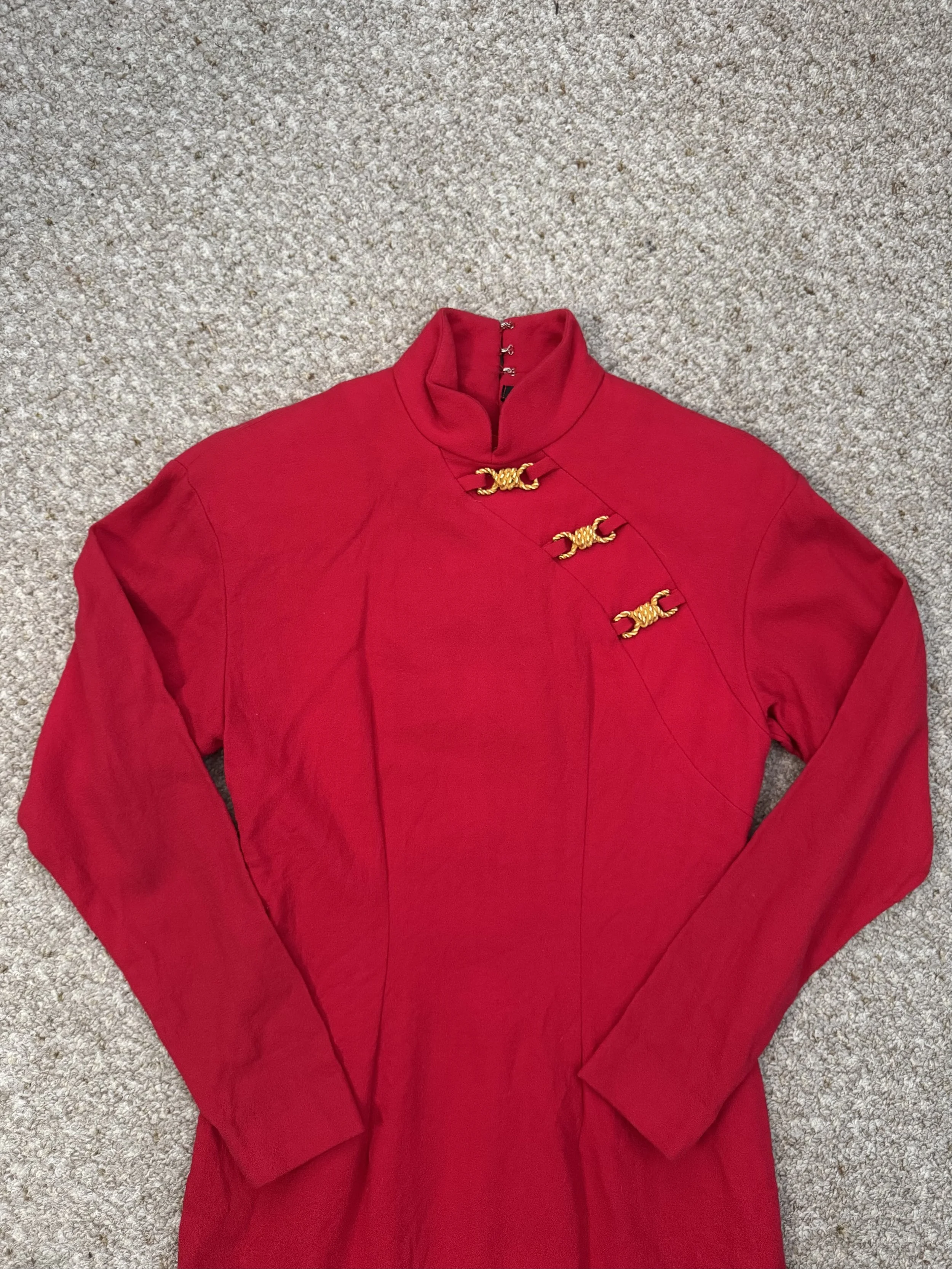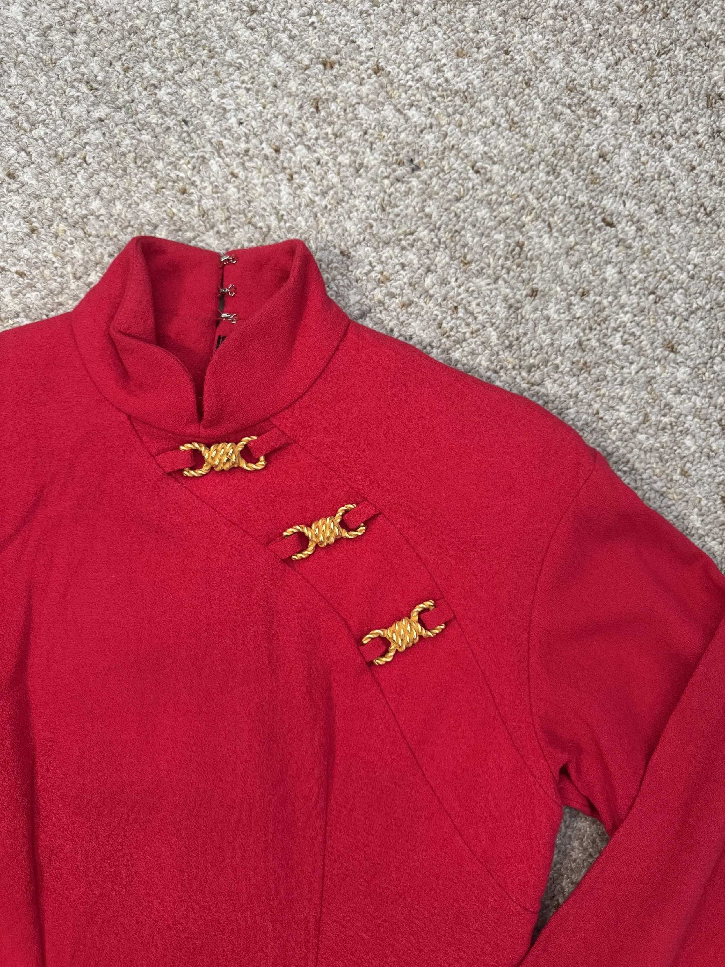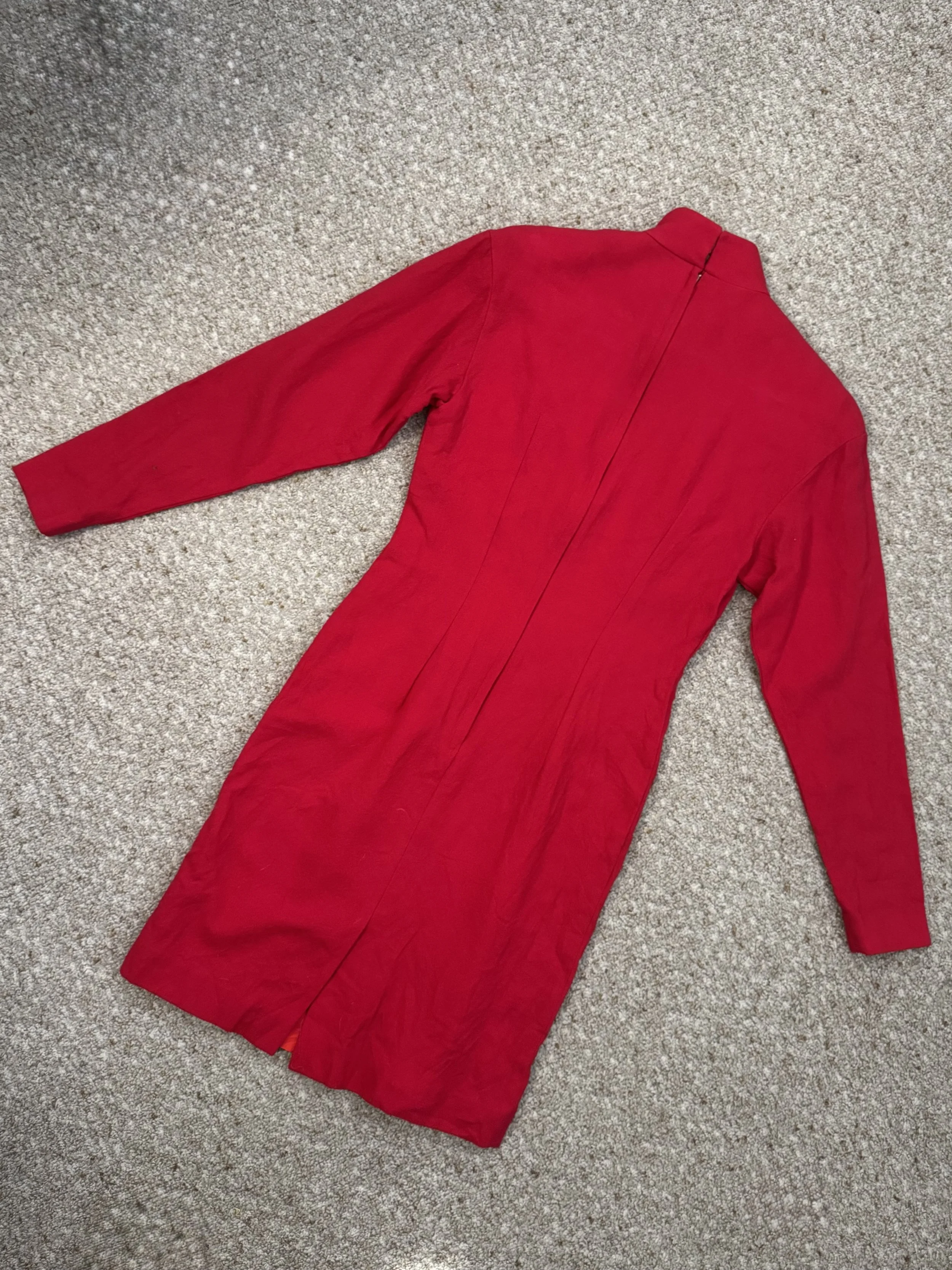 Vintage Theo Miles union-made, long-sleeve red wool dress. Features zipper and triple eye-and-hook closure in back. Triple metal gold knot detail on front, going across chest from neckline to left side.