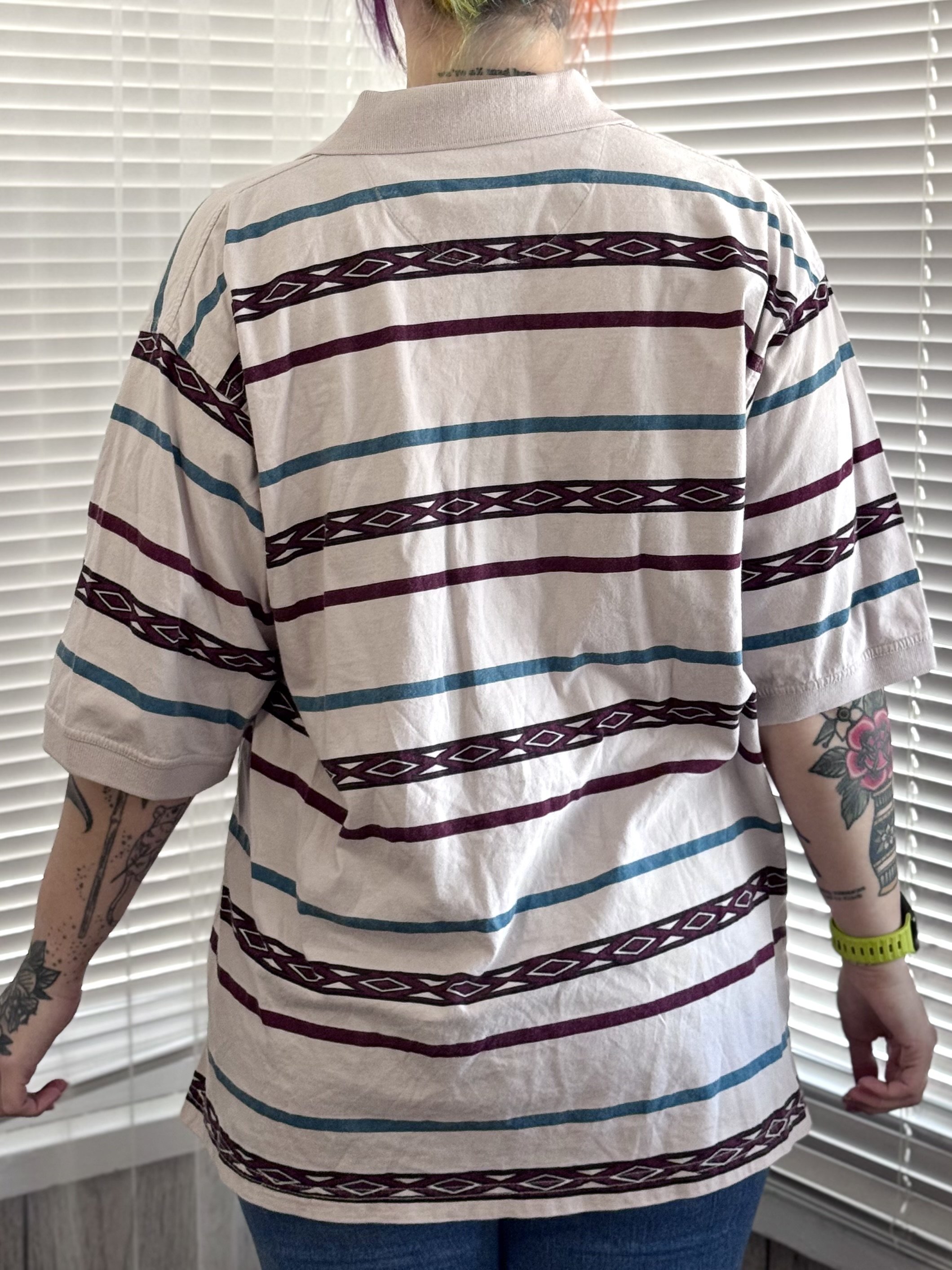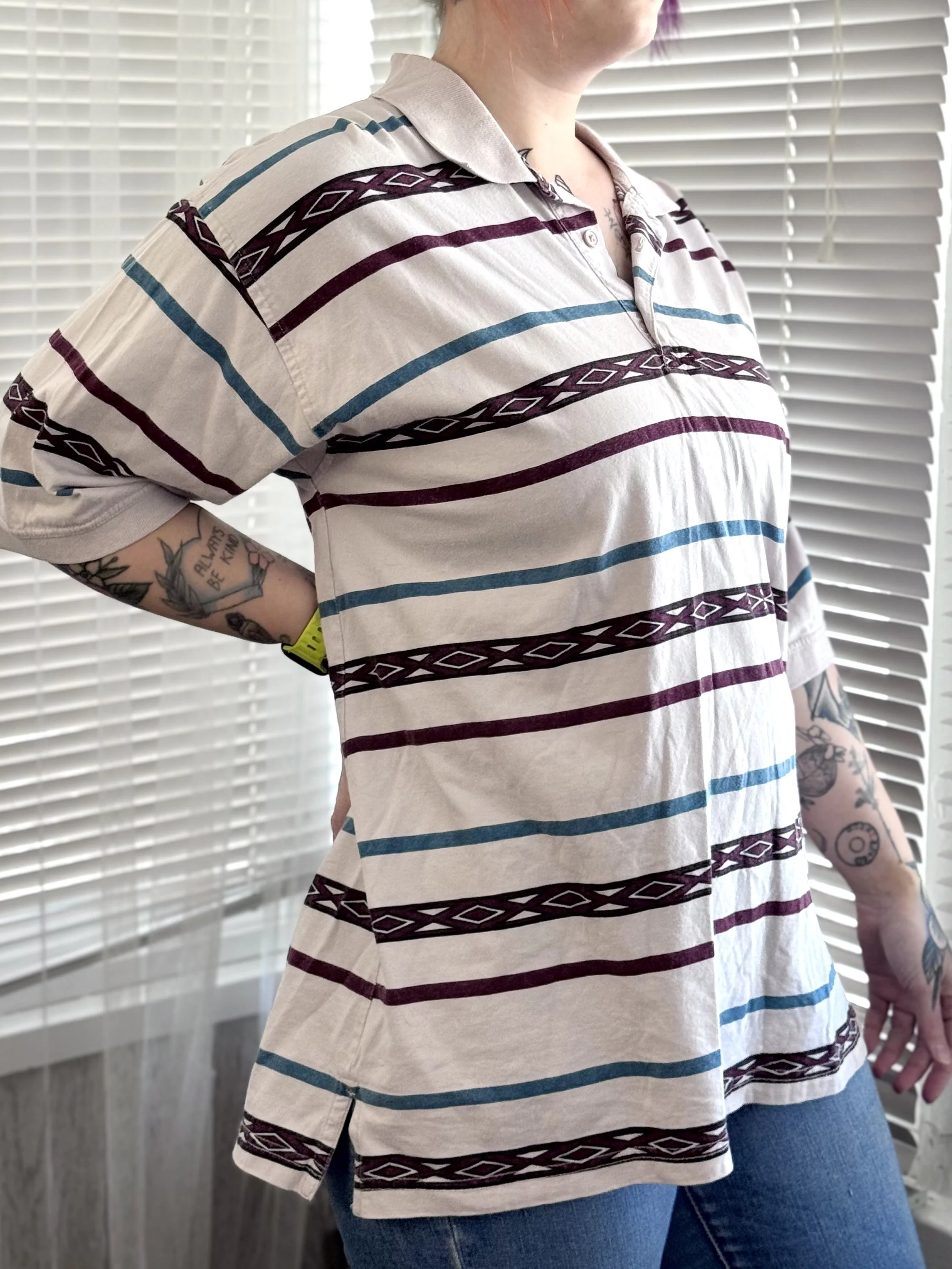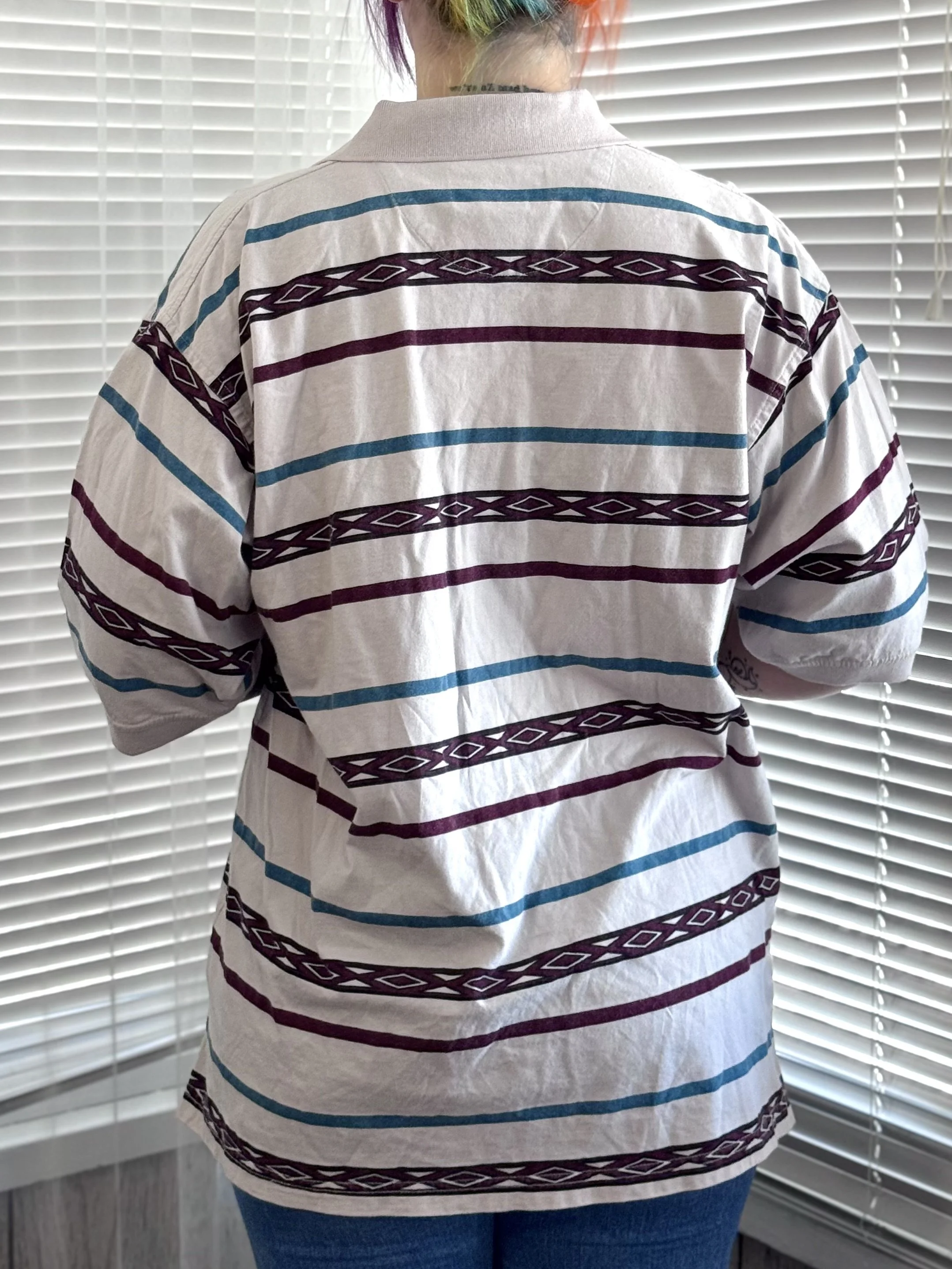 Vintage Wrangler western-print short-sleeved polo. Print is red and turquoise stripes with larger red diamond-print stripe every third stripe. Features 3 button collar closure in front.