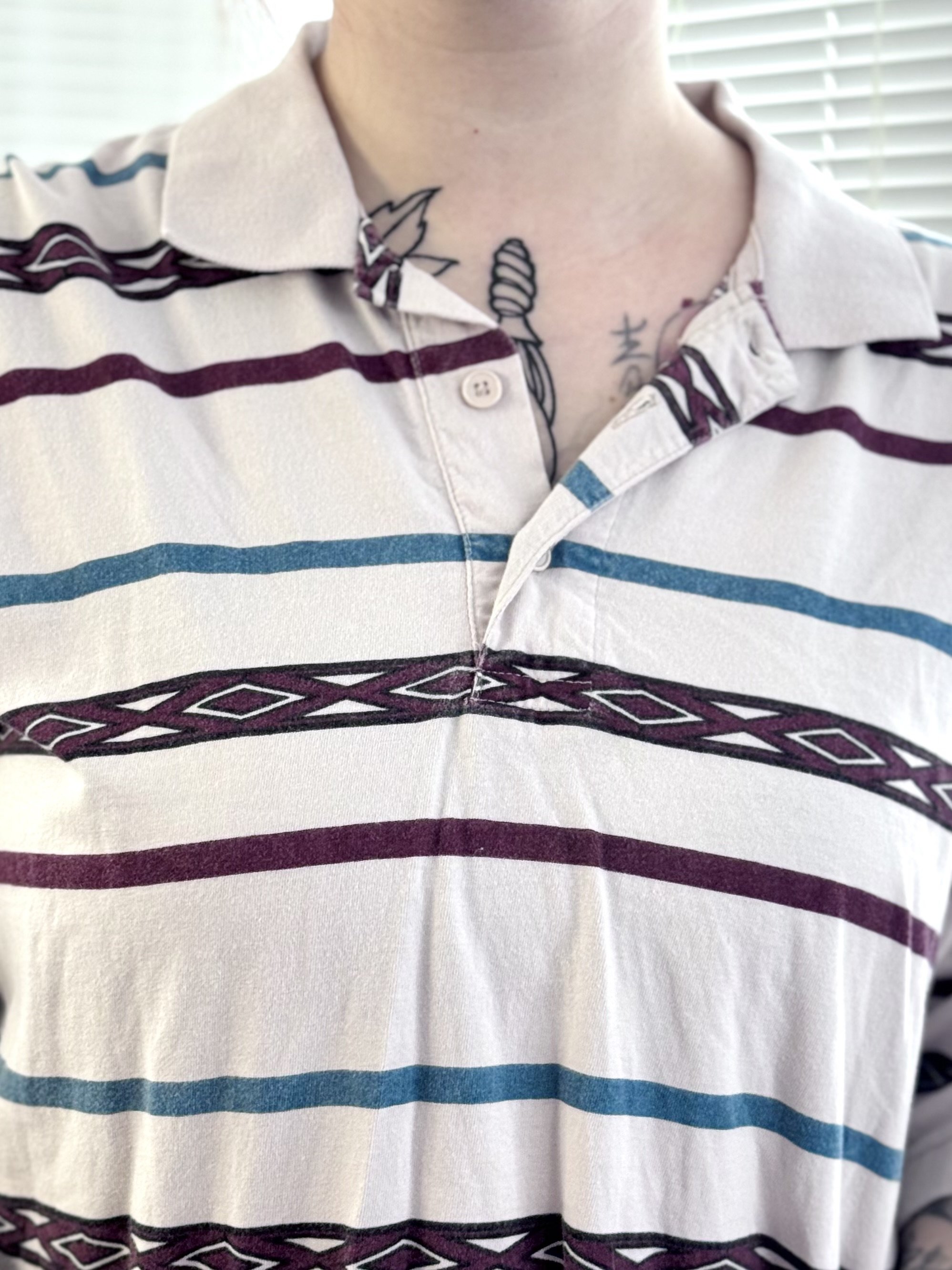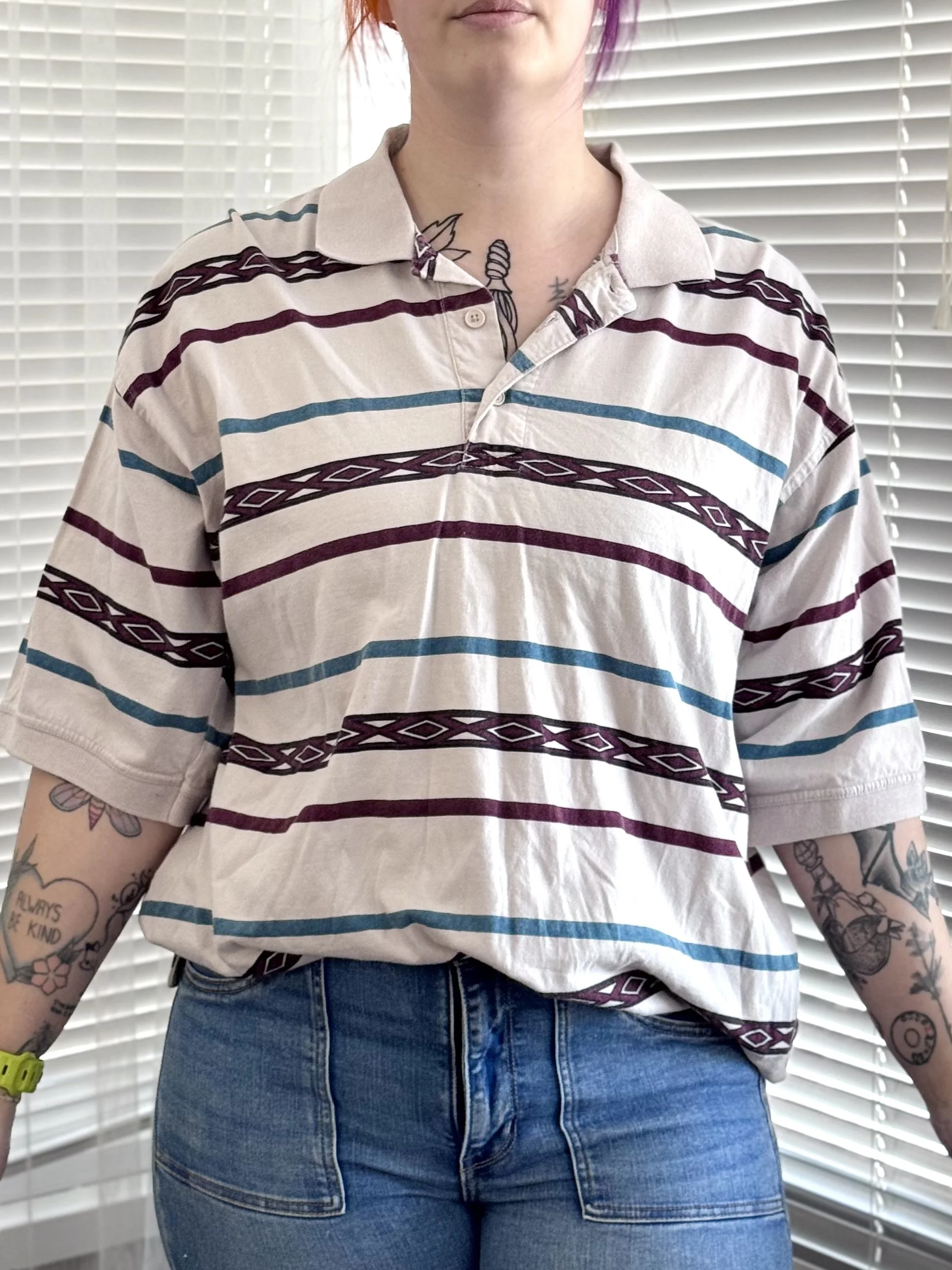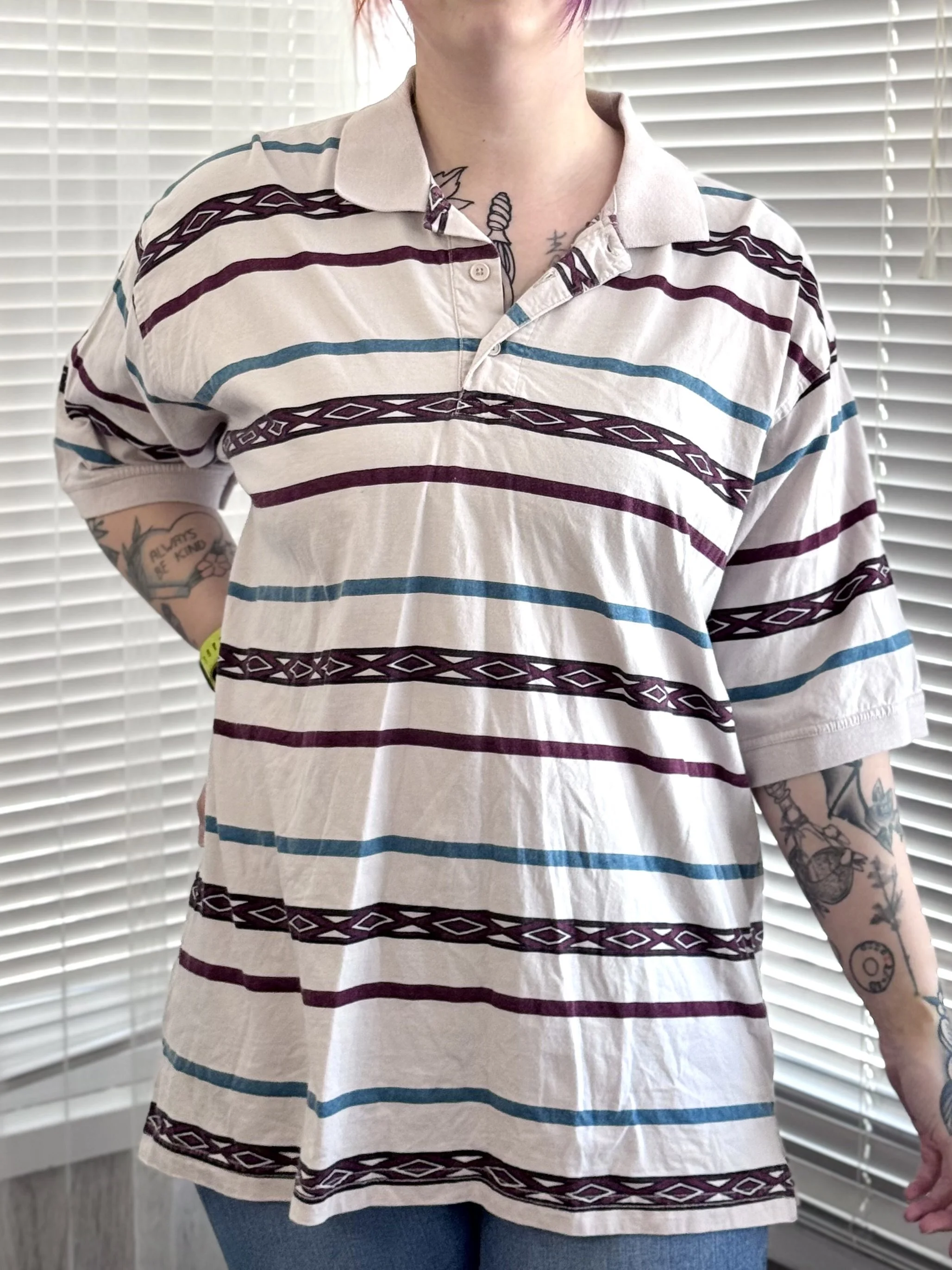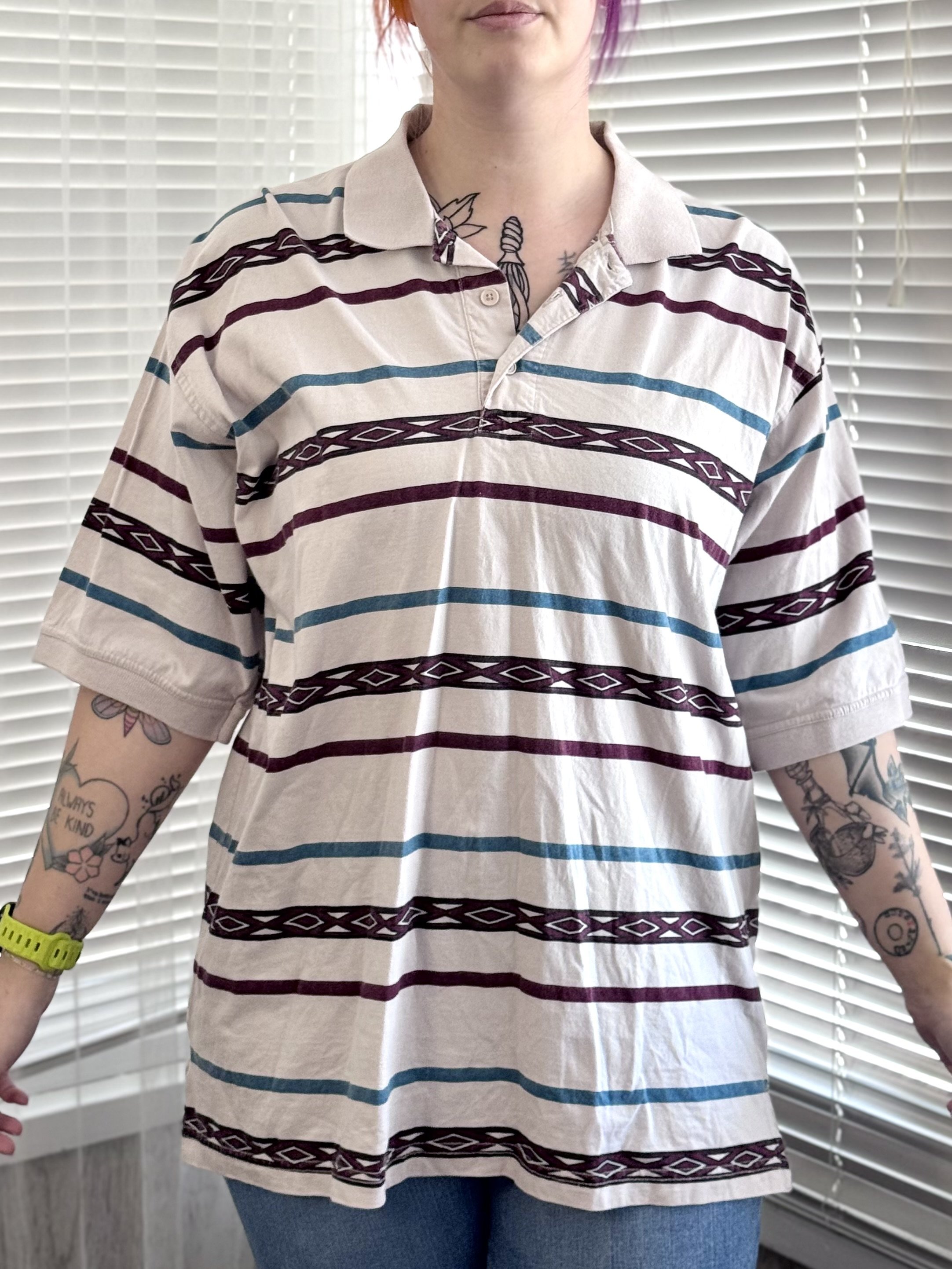 Vintage Wrangler western-print short-sleeved polo. Print is red and turquoise stripes with larger red diamond-print stripe every third stripe. Features 3 button collar closure in front.